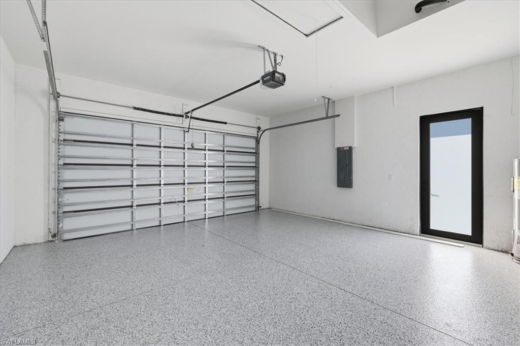 Enjoy indoor-outdoor living with a covered lanai featuring exterior tile flooring, outdoor kitchen cabinets, sink, quartz countertops, and a dedicated pool bath with shower. This home is also equipped with impact windows and doors, full water treatment system, recessed soffit lighting, paver driveway with wraparound pavers, perimeter metal fence, and a 400-sq-ft epoxy-finished oversized garage!