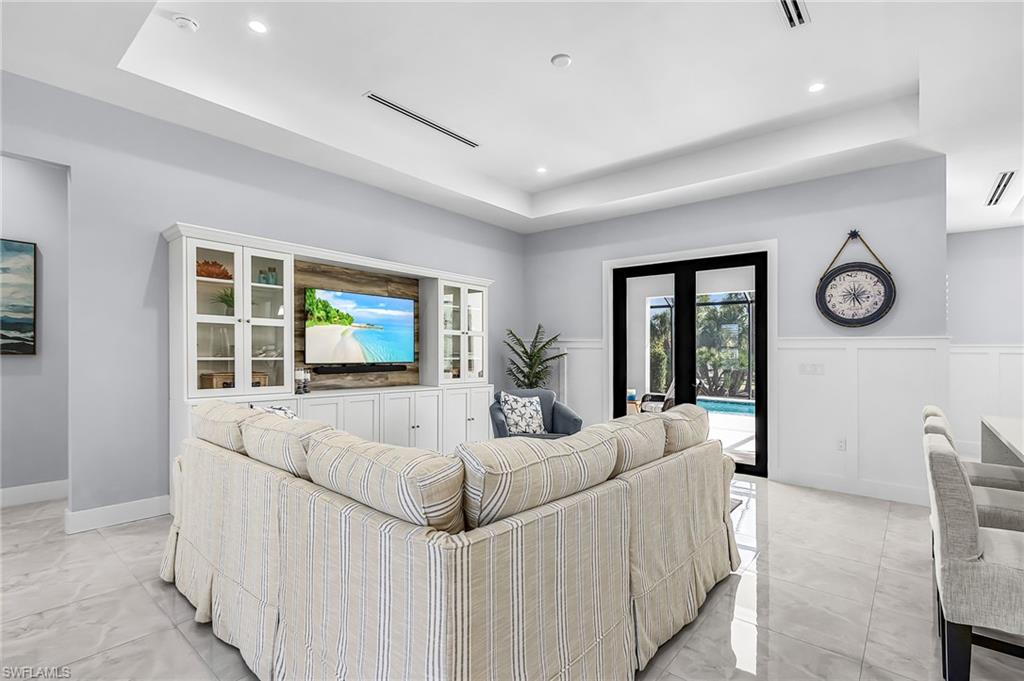Outdoor living is exceptional with a custom Edgewater-designed heated saltwater pool featuring a sun shelf, raised planters with cascading waterfalls, and a full 20/20 screened enclosure. The pool is fully wireless controlled, and mature privacy landscaping, irrigation, and landscape lighting create a peaceful resort-style setting.