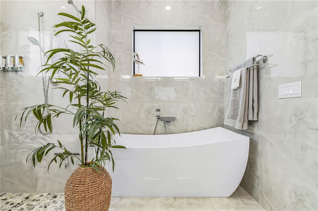 The primary suite serves as a private retreat with a spa-like bathroom featuring dual vanities, a soaking tub, and a separate walk-in shower designed for relaxation.