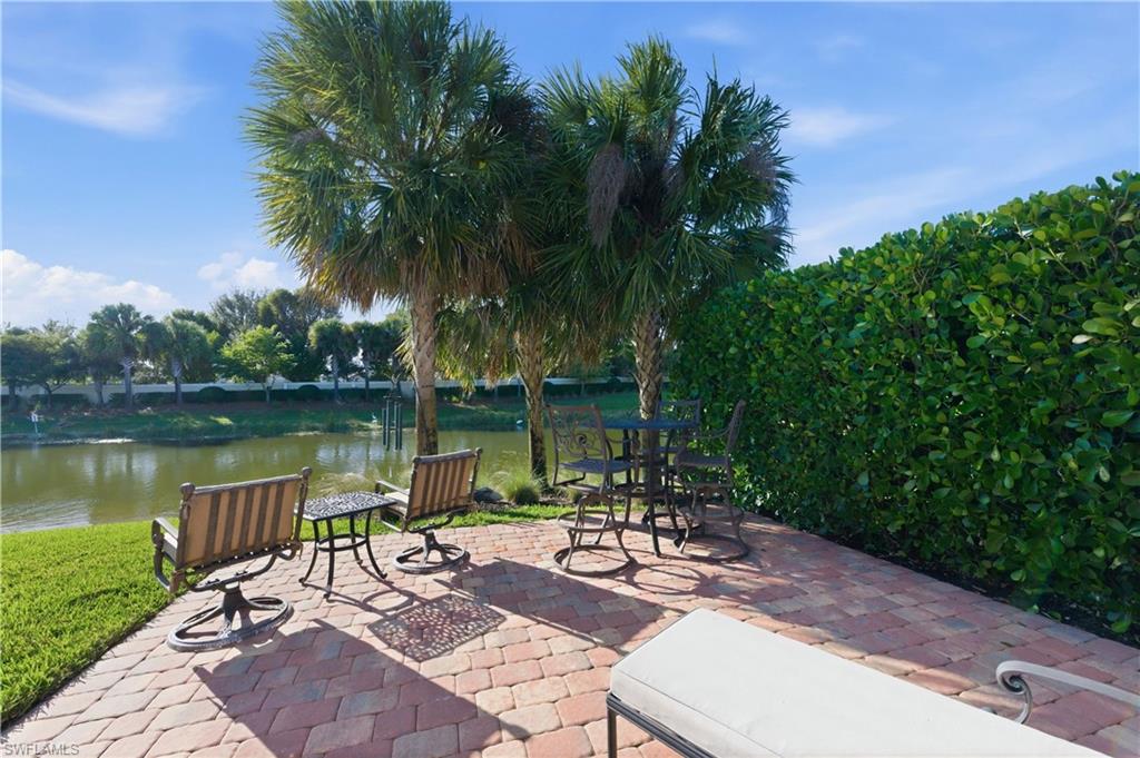 WATERFRONT & JUST LISTED TODAY in gated Avery square. . Perfectly situated on a premium lot on the highly favored Western side of the street with sparkling LAKE & PALM views and away from road noise. This bright 1-story Pulte Orleans model will WOW you, boasting easy-care WOOD PLANK TILE in coastal tones THROUGHOUT the home! Impact glass windows/doors are a huge upgrade, providing effortless peace of mind. You'll love the neutral upscale finishes and over $140, 000 in upgrades: welcoming quartz island/counters, glass tile backsplash, stainless appliances including GAS range and water heater, walk-in pantry, elegant white shaker cabinets with pull-outs and under-cabinet lighting in the open kitchen. Plantation shutters & remote control blinds are on the windows & sliding doors. The brick paver lanai was extended 16 ft. at construction, and the garage was extended 4 ft. and offers a large metal ceiling mounted storage rack and a wide brick paver driveway! Both baths feature upgraded shower tile to the ceilings with glass tile insets, granite counters and contemporary sinks. The oversize master shower features a tile bench & glass block light. 12 ft. tray ceilings add to the open feel. No pool to maintain but, Room for a pool! Gated Avery Square is one of Naples' lowest fee newer neighborhoods within 3-4 miles to beaches, A-rated schools, shopping, gourmet dining and night life at Mercato and Waterside Shoppes!
