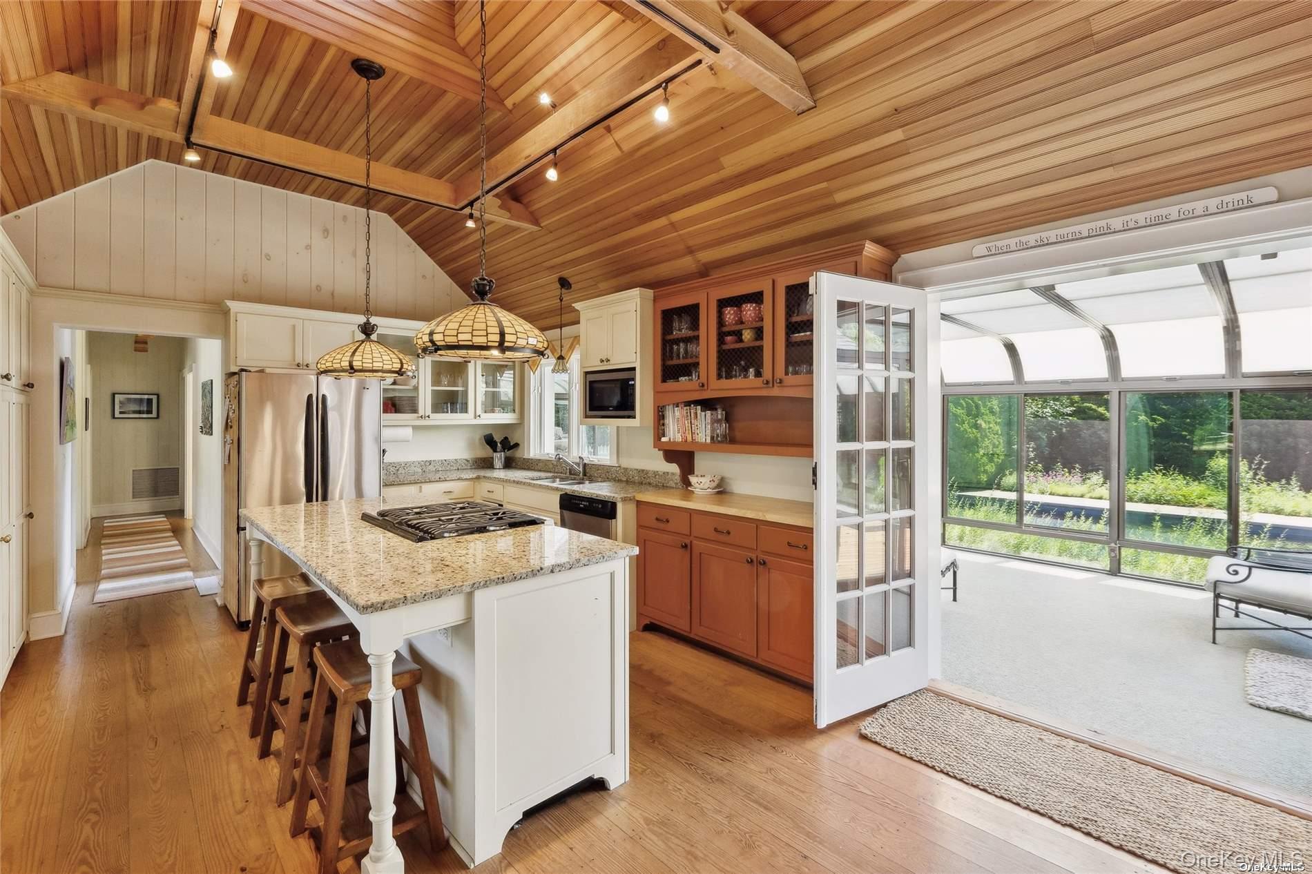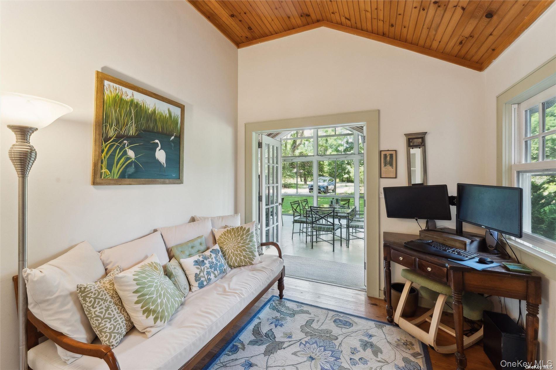 QUIOGUE SUMMER RENTAL AVAILABLE JULY ($35k). On a quiet lane in Quiogue, this 5 BR / 4 BR one-level rental is the ideal summer retreat. Inside is an open kitchen, living room with fireplace, glassed-in sunroom, office with daybed, generous dining room, and four bedrooms including a master suite with a private screened-in porch. Outside there are beautiful gardens, wide lawns, a heated gunite pool, large screened-in porch, and a pool/guest cottage with queen bed and bath. Basement level has ping-pong and kayaks ready for use at the nearby bay access point. Very close to the newly rebuilt Westhampton Beach Main Street and everything the village has to offer.
