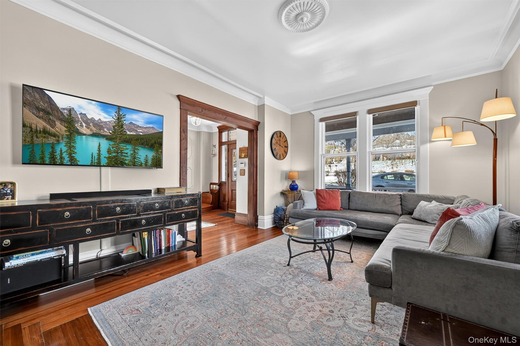 Old-world charm blends with modern luxury to create this one of a kind, circa-1800 Victorian home. Timeless in its character, yet meticulously maintained and beautifully updated, this home is located within the award-winning Marlboro Central School District and just 6 miles from the cultural arts mecca of Beacon. The circular driveway drops you off at the wrap around front porch which curves around the home and leads you to gorgeous mountain views. You may even catch a view of the river when the trees are bare! This alone is enough to fall in love but wait until you go inside! Step into the foyer, which features original hardwood floors, 9-foot ceilings, period details and 16-inch molding. The foyer extends into the large living room with solid wood French doors which open into a massive dining area highlighting a high-efficiency wood burning stove. From there, the flow goes into the kitchen with cherry showcase cabinets, inlaid tile, updated appliances, a large farmhouse sink, and sliders leading out to the porch and backyard. There is a powder room on this level and even that boasts crown molding! The original staircase with elaborate, custom woodwork leads you up to the second floor where you’ll find a large primary bedroom with a giant walk-in closet that could double as a nursery (there's another closet and a window inside the closet)! The second bedroom on this floor is ample-sized and overlooks the backyard. The remodeled, marble tile full-bath has an elegant clawfoot tub, perfect for relaxing. Next, head up to the third floor, with its wide plank original flooring and two additional guest bedrooms (one is currently used as a home office). There is also another huge closet (which the owners used as a toy room…yup it's that big)! Notable points of this fine home include a new boiler, newer roof with 30-year shingles, 3-zone heat, propane hookup for the stove and outdoor grill, a fully fenced-in yard (perfect for little ones, two- or four -legged) and so much more. An ideal location for commuters, the home is 2 miles from I-84 and the Newburgh/Beacon Bridge, 5 miles from I-87, and just 6 miles from the Metro-North train station in Beacon. Visit local farm markets, apple orchards, wineries, and enjoy fine dining on the river. Close to West Point and Stewart Airport and shopping is right down the road. Play a round of golf at the Powelton Country Club or hike on any of the nearby trails. Come see the beauty of this home and all it offers.
