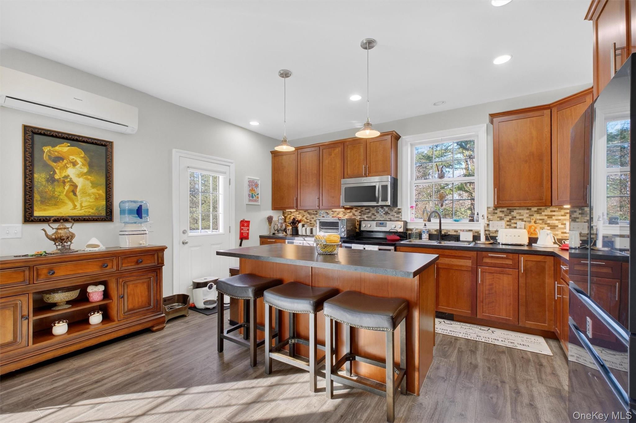 Perfect timing to join the wonderful Twin Lakes community. This meticulously maintained and thoughtfully renovated home is truly move-in ready, with nothing left to do. Between 2021 and 2024, numerous upgrades were completed, including enclosed front mudroom, new engineered wood floors, a new refrigerator, washer and dryer, and a new split A/C system on the second floor. The walk-out lower level was fully finished and now features a kitchenette, a full bathroom, closets, and over 800 square feet of flexible living space. Additional improvements include a Fully fenced in Backyard, a Reverse Osmosis water system and owned solar panels. The main level offers an open-concept layout with a welcoming, efficient modern kitchen, a sun-filled first-floor primary bedroom with an ensuite bathroom, and a convenient half bath for guests. Upstairs, you’ll find two generously sized bedrooms and a full bathroom. The lower level provides an ideal space for guests or extended family, complete with its own kitchen and full bath. Two large glass walk-out doors lead directly to a completely fenced, private, and charming backyard. The property also includes a detached two-car garage and is located just 500 feet from the clubhouse and lake docks. Conveniently situated approximately 14 miles to Hudson or Rhinebeck and only 8 miles to Red Hook, with easy access to excellent restaurants, music, shopping, and the vibrant towns and villages of the Hudson Valley.