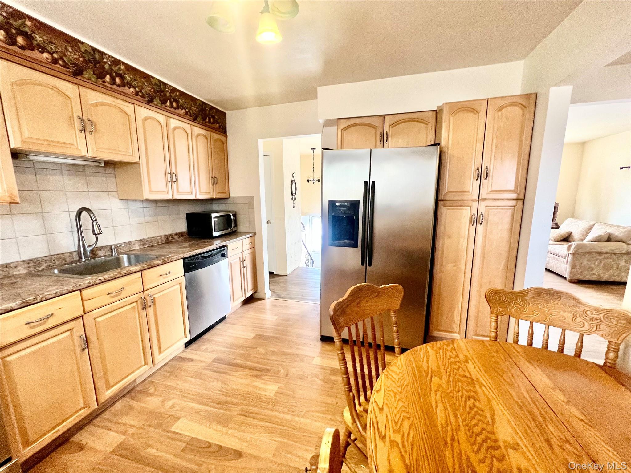 Well-maintained hi-ranch home situated on a 100 x 60 corner lot offering a flexible and functional layout. The upper level features three bedrooms, one full bath, a bright living room, dining room, and eat-in kitchen. The street level provides one to two additional bedrooms, a full bath, a den with sliders leading to the patio, a laundry room, and a one-car attached garage. Additional highlights include two-zone gas heat, a separate gas hot water tank, slab foundation with no basement, and pull-down attic storage. Taxes shown include village taxes.