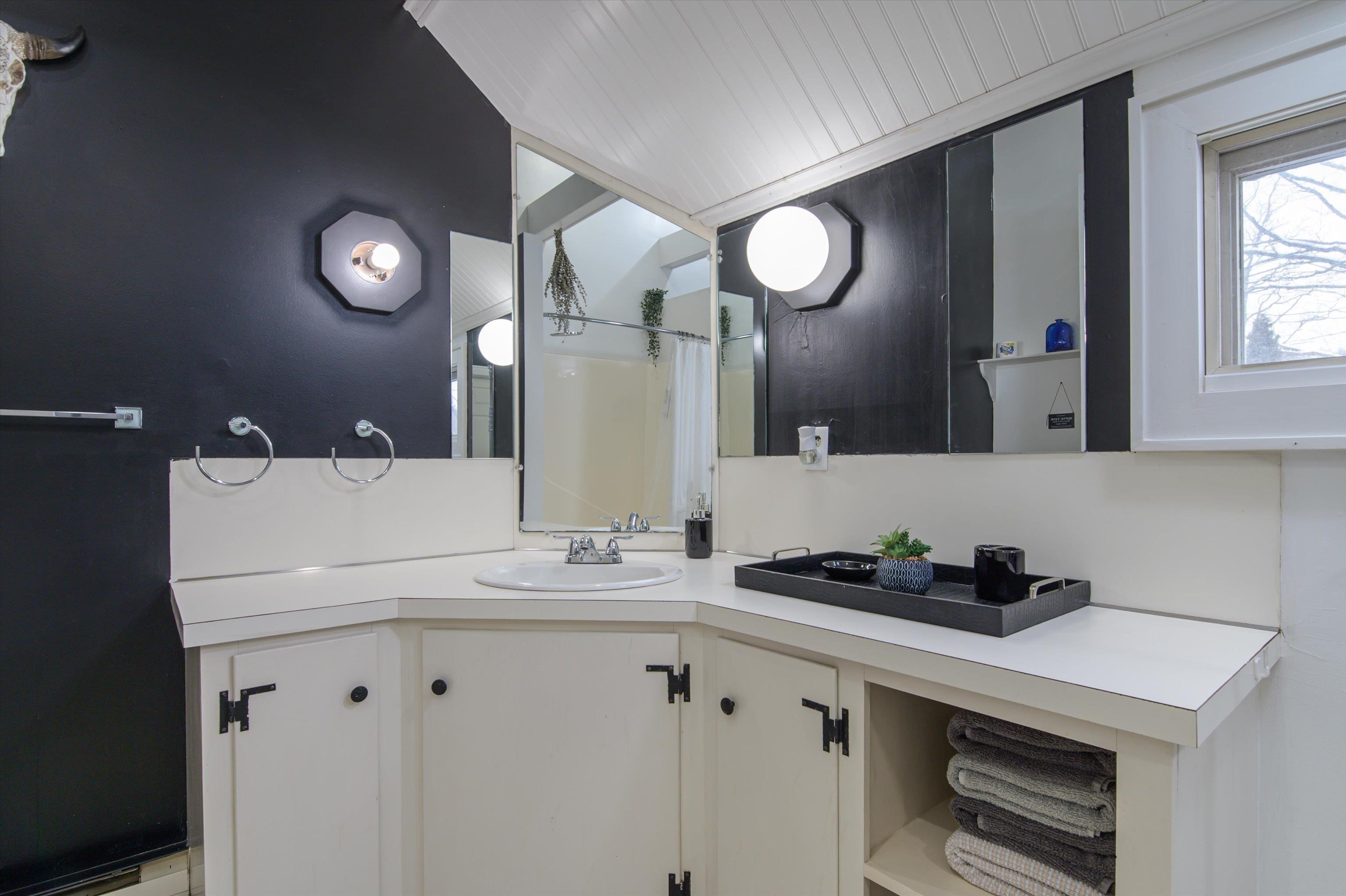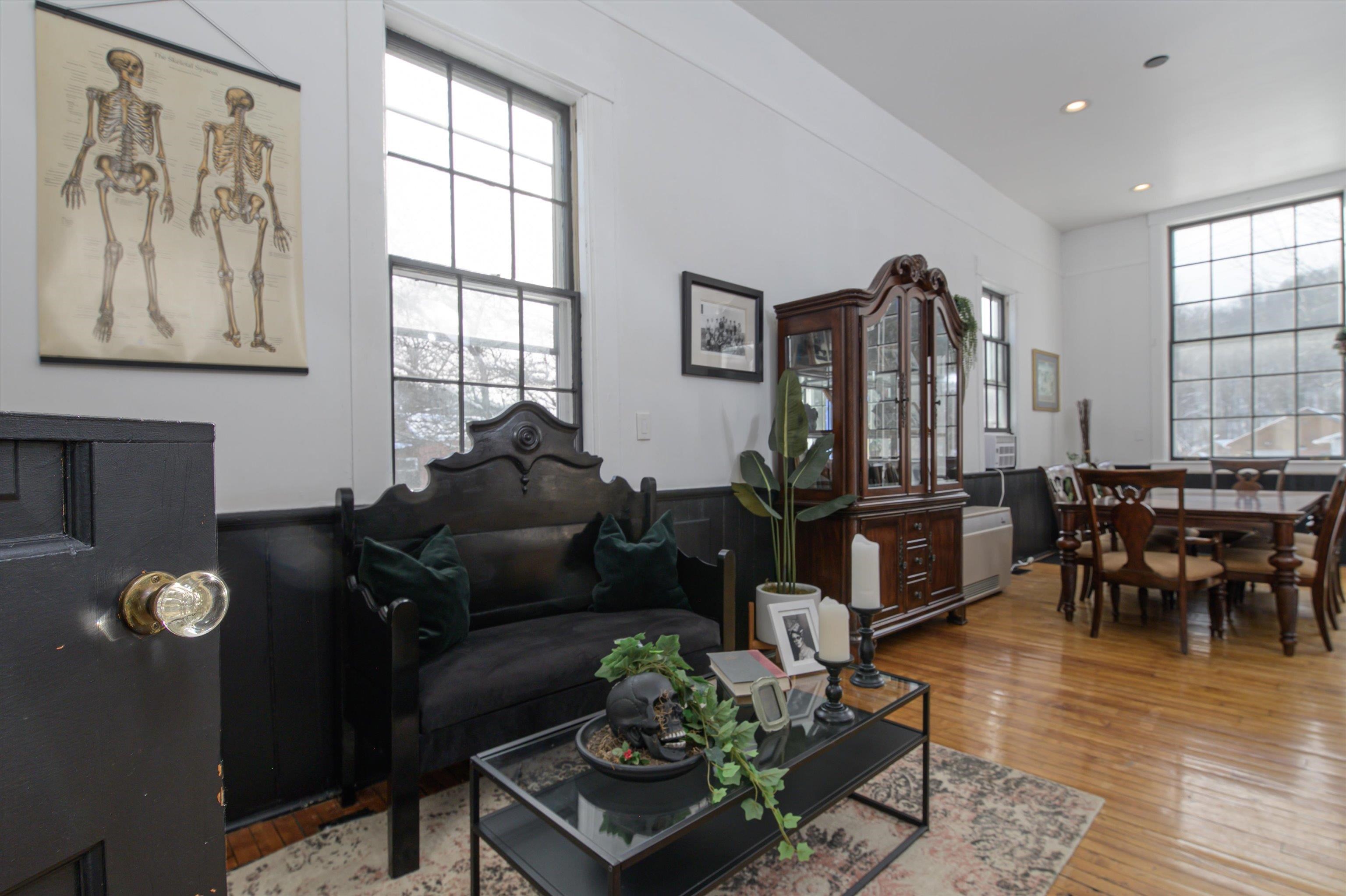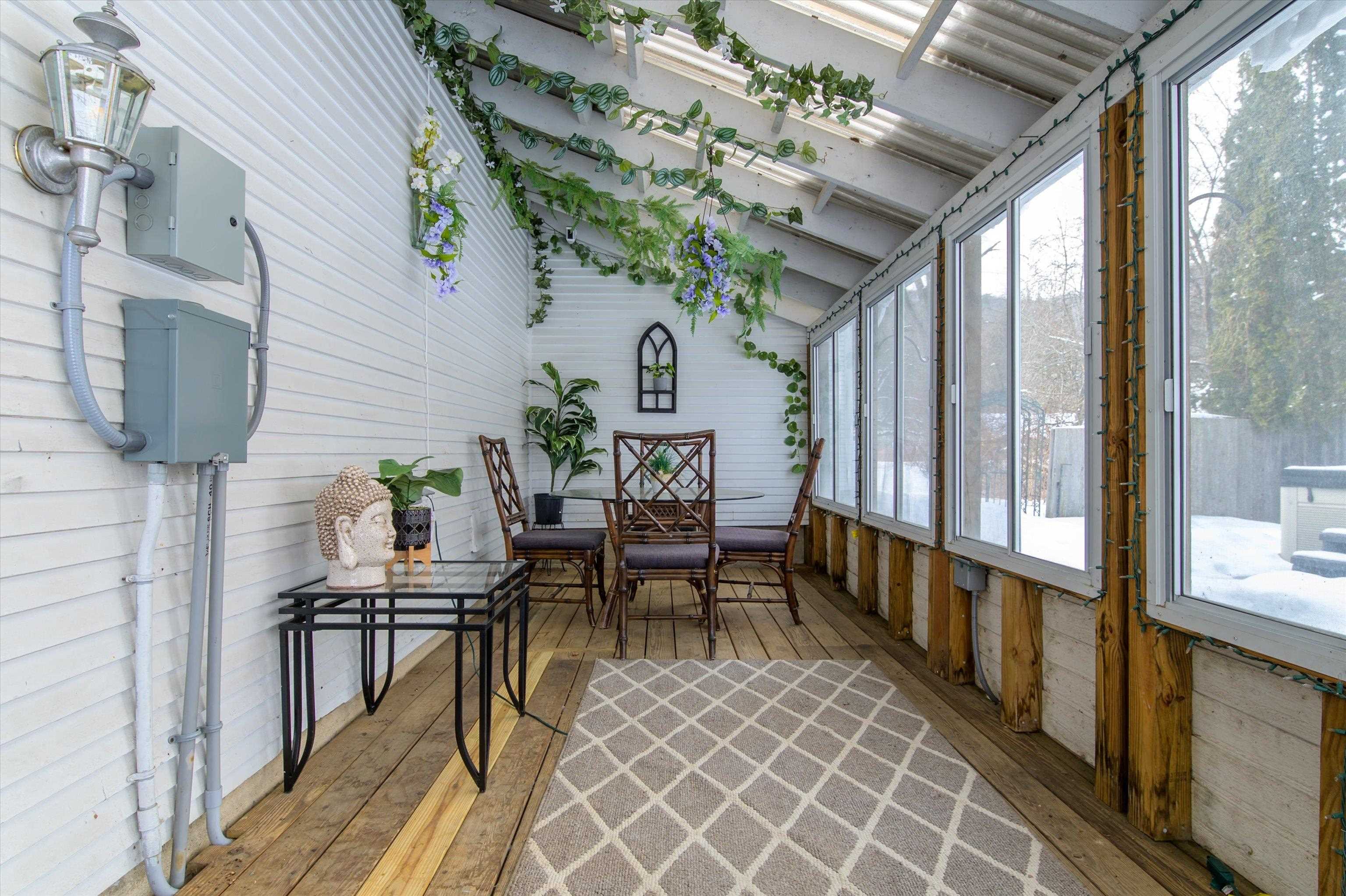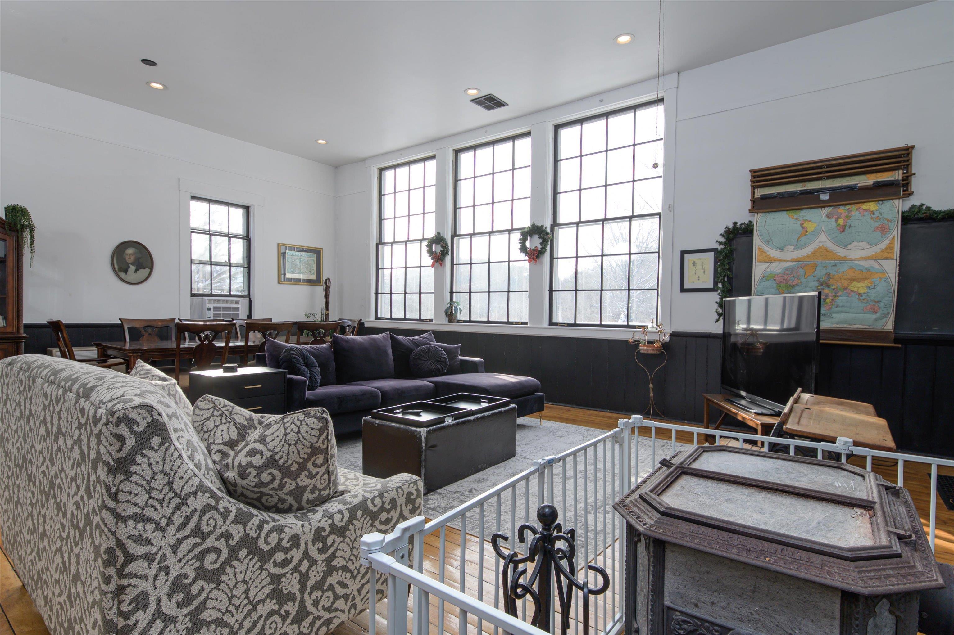 Set on . 76 acres in the peaceful Chester VT countryside, this former schoolhouse offers timeless farmhouse charm, rich history, and a setting that feels both private and inviting. Framed by classic stone walls, a pond site, and a gently wooded backdrop, the home sits just off a main road, providing easy access to town while maintaining a quiet, pastoral atmosphere. Originally serving the community as a schoolhouse until the early 1960s, the property was thoughtfully converted into a residence that honors its roots while offering comfortable modern living. The original schoolroom now anchors the home as a warm, open living space filled with natural light, where hardwood floors and tall windows create an airy yet cozy environment ideal for everyday living and gathering. The farmhouse-style kitchen flows seamlessly into the living area and features butcher block countertops, a professional-grade gas convection range with double ovens, and a breakfast bar with a charming pass-through window, perfect for casual meals and entertaining. A spiral staircase adds rustic character and leads to the upper level, offering a spacious bedroom or studio and flexible use for guests, creative space, or a private retreat. The primary suite serves as a peaceful sanctuary with vaulted ceilings, custom built-in shelving, a private full bath, and a cozy wood stove. Doors open to a rear deck overlooking the private yard and surrounding countryside. Additional features include a generous first-floor laundry area, enclosed sun porch, outdoor patio, a private hot tub with a heated walkway for truly maintenance-free winter access (no shoveling, ever!) and an attached two-car garage currently used as a game room, easily adapted back to garage space or reimagined as a workshop, studio, or home office. With commercial zoning, just 10 minutes from Okemo Mountain Resort, and a history as a successful Airbnb, this rare property offers character, flexibility, income potential, and true country charm.