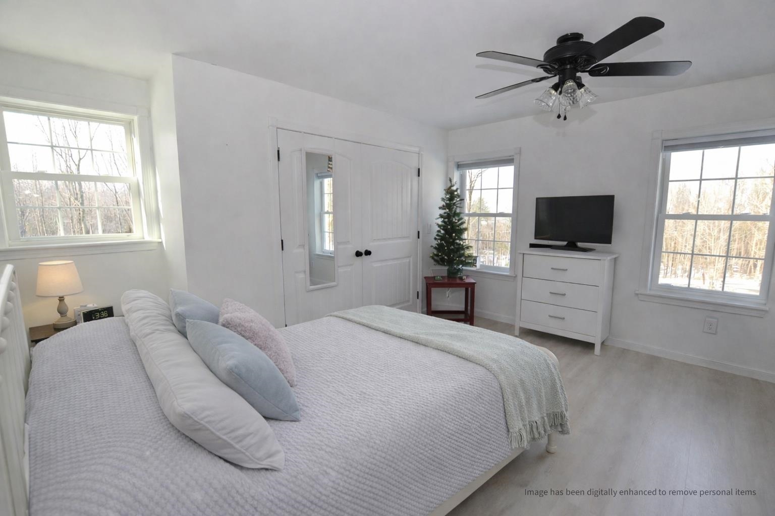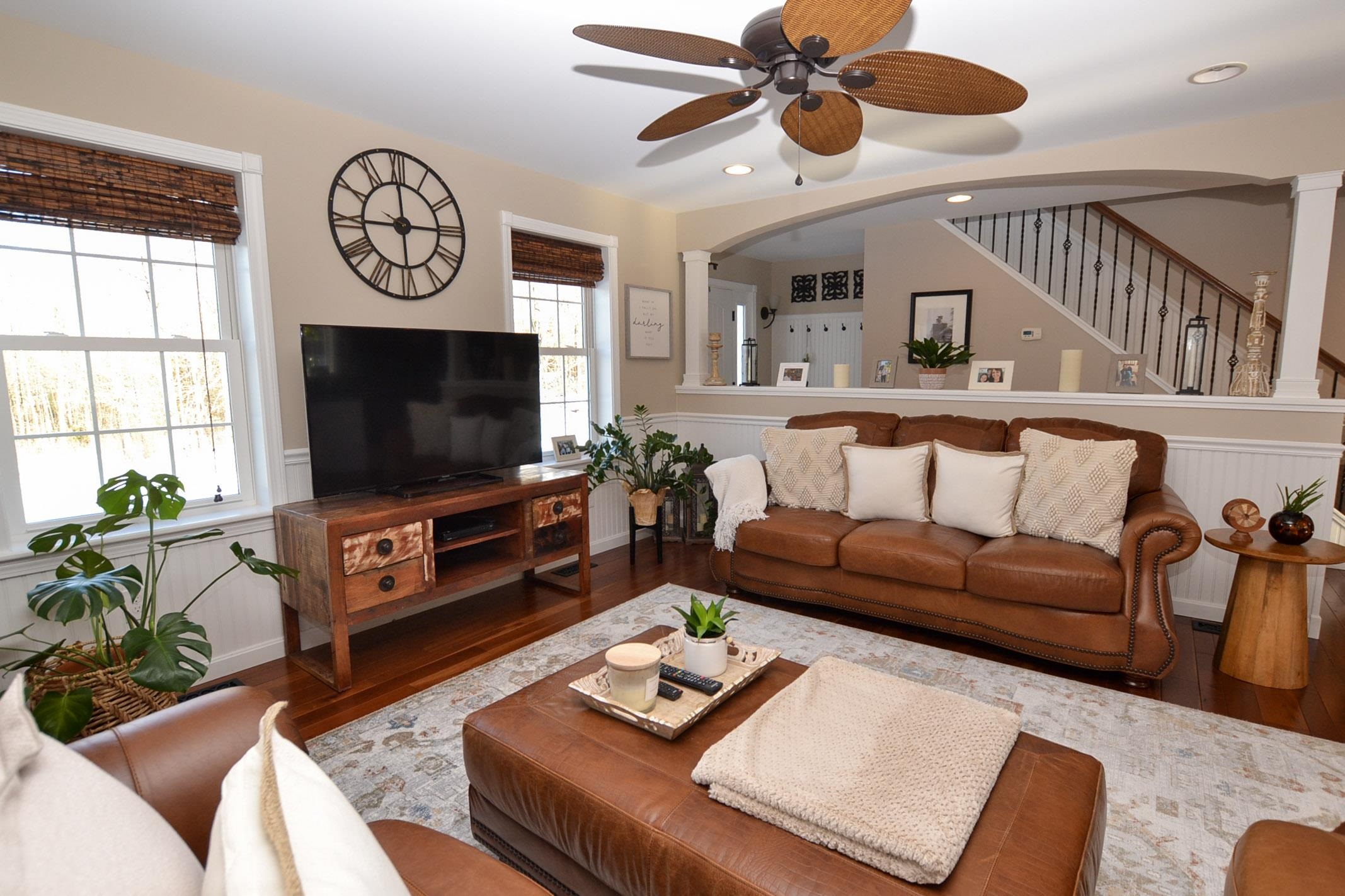 Welcome to this truly stunning, meticulously maintained four bedroom, four and a half bath home. Thoughtfully set on a private, level yard, this home is framed by mature trees, stone walls and fencing, with beautifully established landscaping and a striking display of hydrangeas. From the moment you arrive, the sense of care and pride of ownership is unmistakable. Inside, sun-filled spaces and cherry hardwood floors create warm, inviting atmosphere throughout the main level, complemented by central air conditioning for year-round comfort. The garage opens into a well-designed mudroom, offering a tidy and functional drop zone for shoes and coats. The open-concept kitchen, dining, and living area is ideal for both everyday living and memorable gatherings, featuring granite countertops, a breakfast bar, and a cozy gas fireplace that anchors the living room with warmth and charm. Designed for effortless indoor-outdoor living, this home offers both a fabulous three-season porch and a four-season sunroom, each opening to the deck and patio; perfect for entertaining, quiet mornings, or evenings spent with family and friends. Upstairs, three generously sized bedrooms include a serene primary suite with a walk-in closet and private bath, along with an additional full bath and the convenience of second-floor laundry. Above the garage, a versatile bonus room with its own entrance and three-quarter bath offers possibilities as a home office, studio, or private space for family and friends. The finished basement expands your living space even further, ideal for movie nights, game days, or a home gym, with an additional bonus room ready to adapt to your needs. Completing the property is an attached two-car garage and an exceptional detached two-bay heated garage/workshop with over 1, 600 sqft and a half bath; perfect for hobbyists, storage, or creative pursuits. A rare blend of comfort, functionality, and privacy, this exceptional home is designed to be enjoyed for years to come!