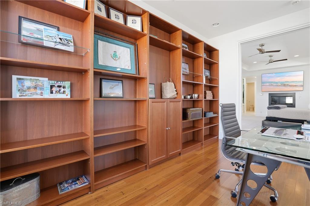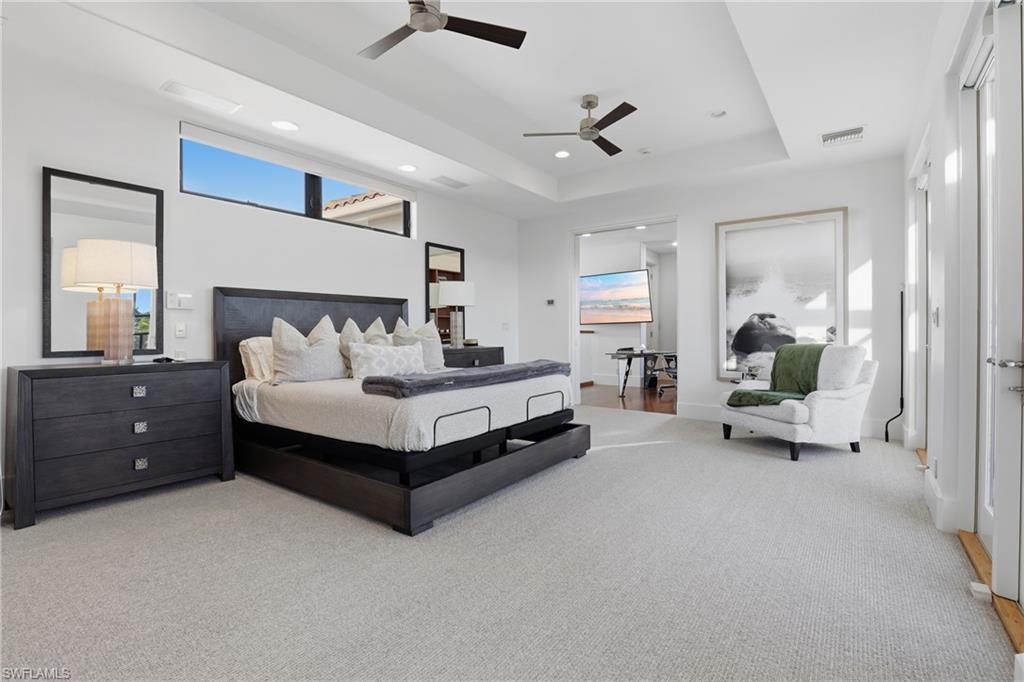 The open-plan living area is ideal for entertaining, with French doors opening to a spacious lanai. The gourmet kitchen is equipped with gas cooking, Sub-Zero and Miele appliances, and high-end finishes throughout. Flooring includes a mix of tile, hardwood, and carpet, complemented by impact-resistant doors and windows.