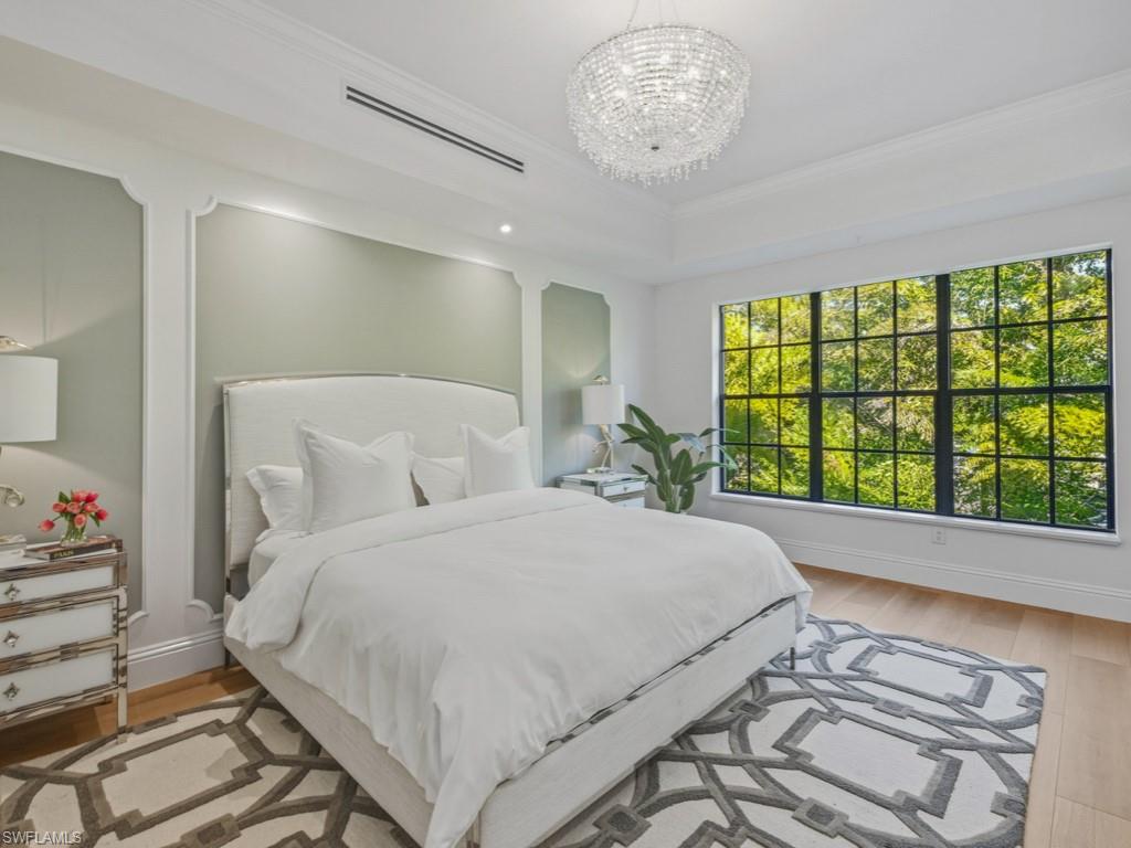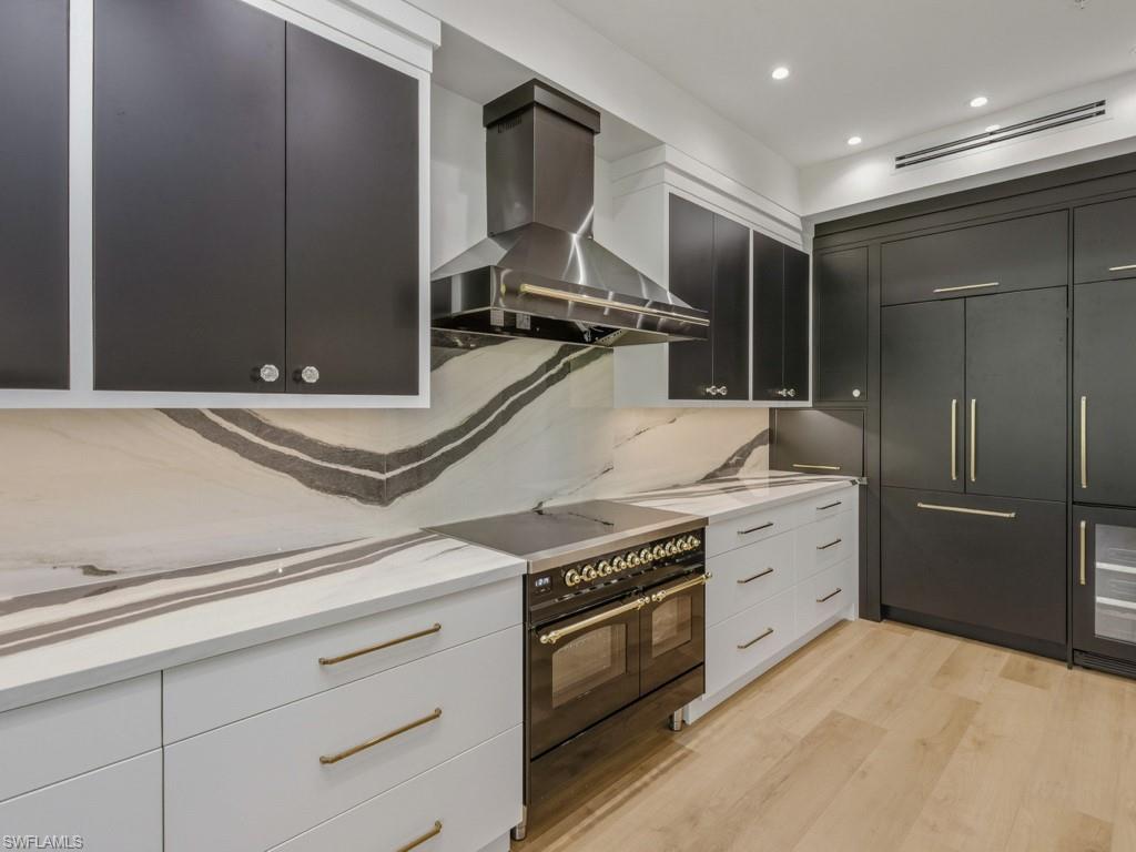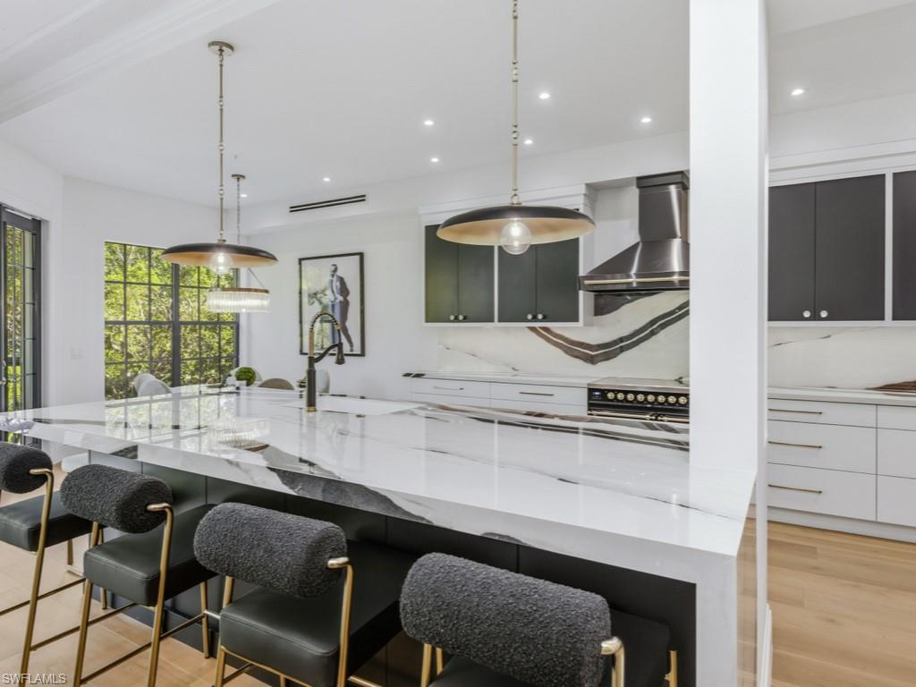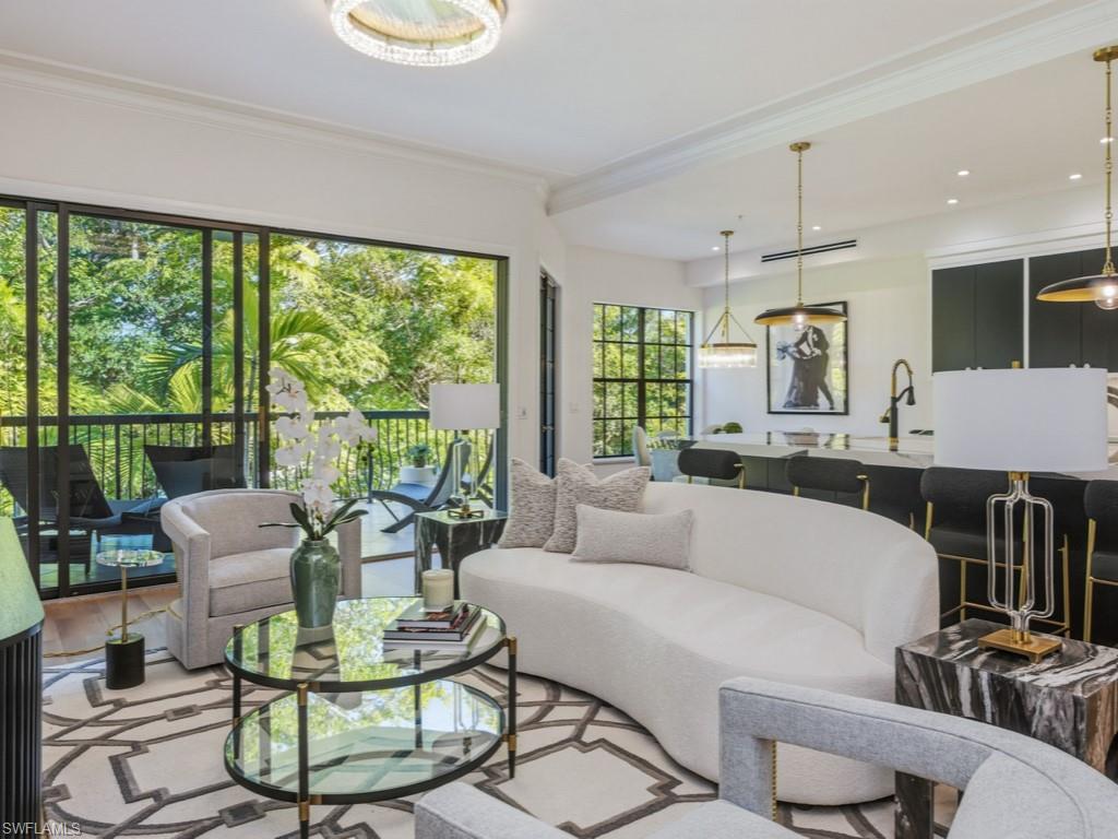 Welcome to an unparalleled coastal masterpiece. This exquisitely re-envisioned, designer-appointed luxury condominium in the heart of Olde Naples is just steps from iconic Fifth Avenue and moments from Naples’ renowned sugar-sand beaches. The exceptional residence offers the ultimate in refined coastal living and completely renovated down to the studs, with no detail overlooked in this sophisticated home. Soaring ceilings and an abundance of natural light highlight a thoughtfully redesigned open floor plan, perfect for both elegant entertaining and relaxed everyday living. The residence features three spacious en-suite bedrooms, each offering privacy and comfort. The striking chef’s kitchen is a true showpiece-featuring custom floor-to-ceiling cabinetry with brass and crystal hardware, and infinity porcelain counters and backsplash made in Italy. Premium appliances include an Italian black Ilve range and statement hood with gold accents, complemented by integrated refrigeration and wine storage for a seamless, architectural finish. A dramatic oversized porcelain waterfall island with marble veining, provides seating for six and ideal for gatherings and casual dining alike. Designer lighting, Vanderpump pendants, and curated finishes complete this exceptional space. The living and dining areas flow effortlessly to a generous private balcony, inviting alfresco dining and tranquil views overlook the lushly landscaped pool deck and tropical greenery, an ideal setting for morning coffee or evening cocktails. The primary suite serves as a serene, spa-inspired retreat, offering direct balcony access, dual walk-in closets, Allegri Italian crystal chandelier, and a beautifully appointed en-suite bath with marble floors and Santorini quartz countertops. Additional bedrooms are equally refined, each with its own en-suite bath and designer finishes like calacatta marble shower and marble floors. Enjoy a rare additional feature of a PRIVATE POOL CABANA WITH HALF-BATH-a coveted luxury that elevates condominium living and convenient for use as an office, gym, den or relaxation. Also, a new HVAC system, all-new electrical design throughout, and a spacious laundry room with storage. Resort-style amenities include gated entry, a heated pool, outdoor grill station, private 1-car garage, and designated covered parking space. Located within one of Olde Naples most coveted boutique buildings, this exceptional home delivers a rare blend of elegance, comfort, and walkable convenience. For The Most Discerning Buyer.