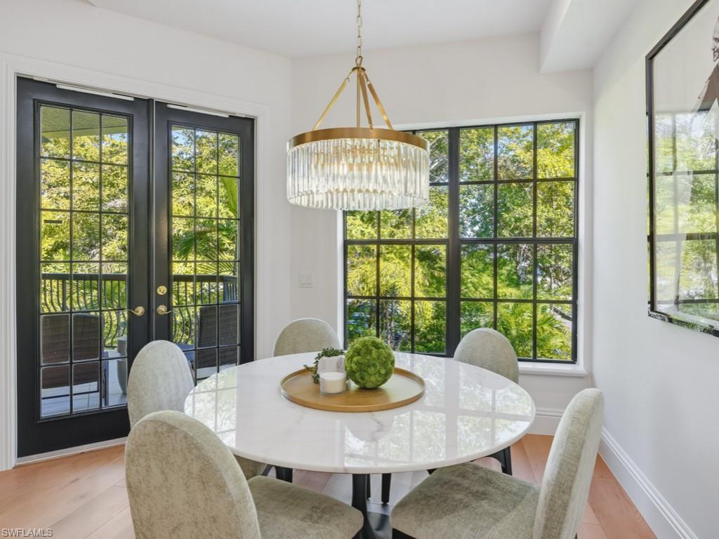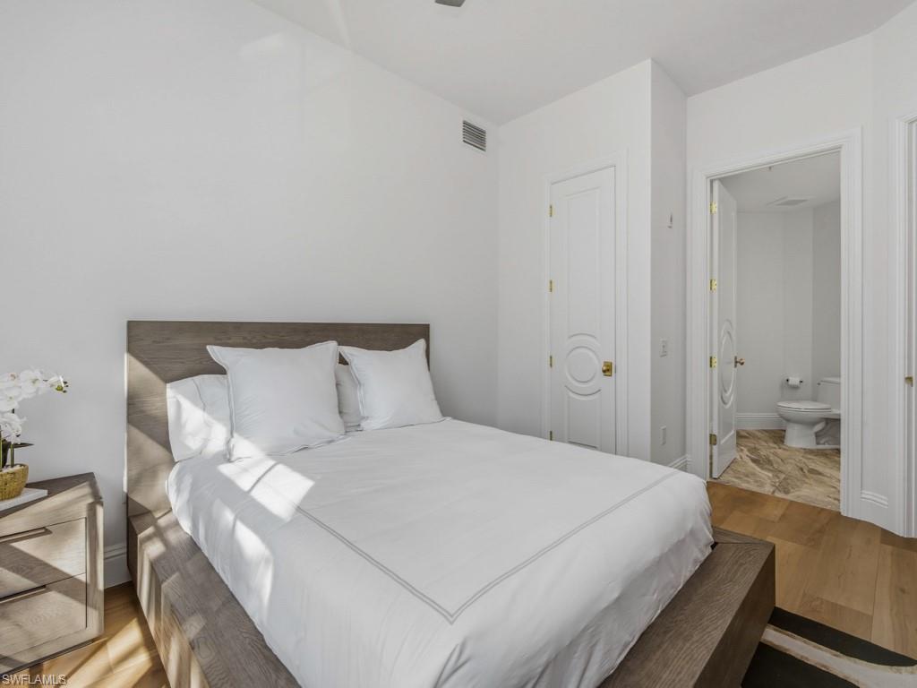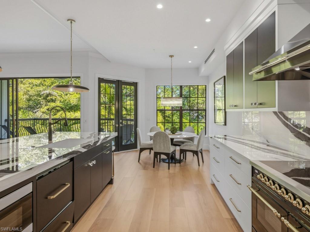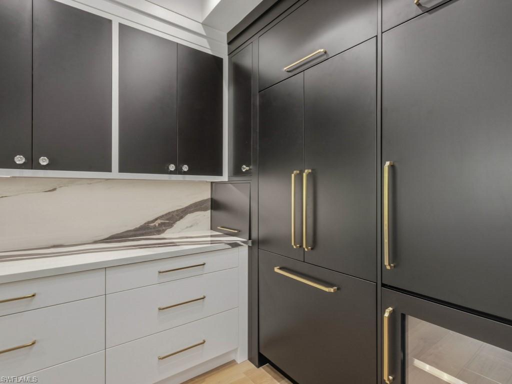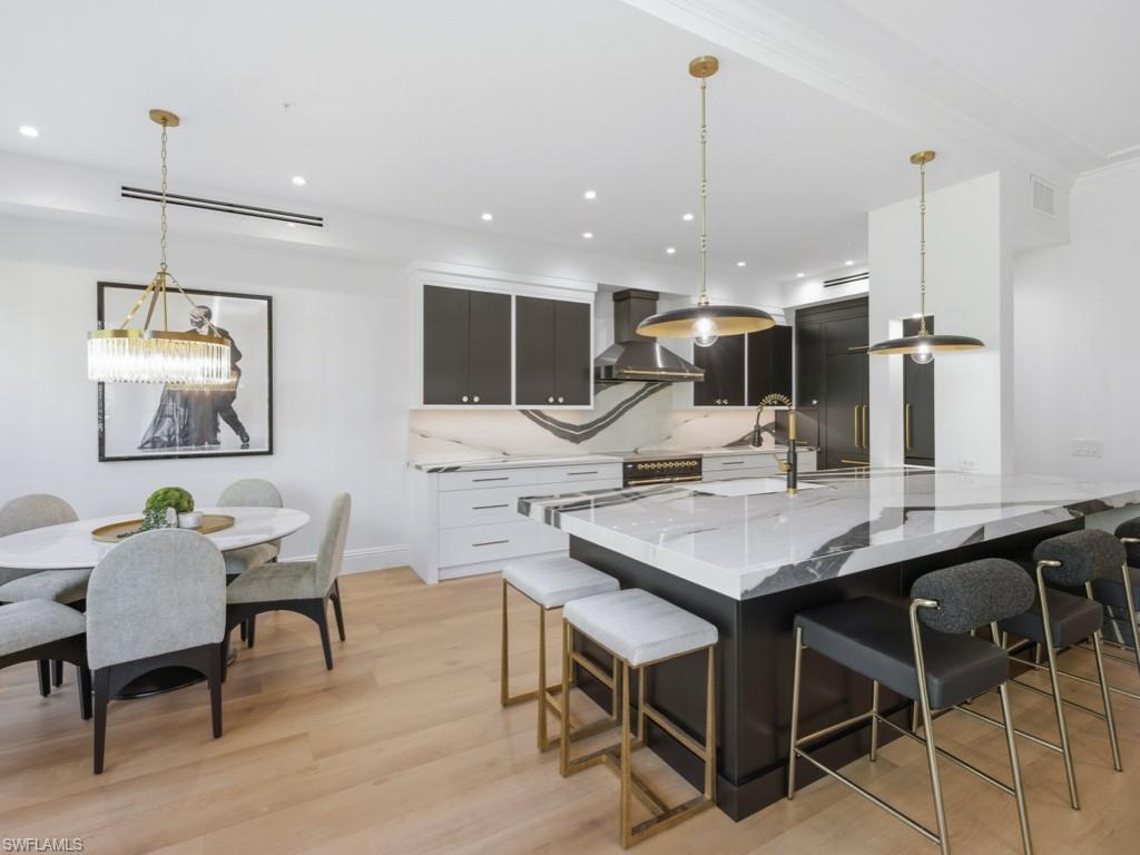 Welcome to an unparalleled coastal masterpiece. This exquisitely re-envisioned, designer-appointed luxury condominium in the heart of Olde Naples is just steps from iconic Fifth Avenue and moments from Naples’ renowned sugar-sand beaches. The exceptional residence offers the ultimate in refined coastal living and completely renovated down to the studs, with no detail overlooked in this sophisticated home. Soaring ceilings and an abundance of natural light highlight a thoughtfully redesigned open floor plan, perfect for both elegant entertaining and relaxed everyday living. The residence features three spacious en-suite bedrooms, each offering privacy and comfort. The striking chef’s kitchen is a true showpiece-featuring custom floor-to-ceiling cabinetry with brass and crystal hardware, and infinity porcelain counters and backsplash made in Italy. Premium appliances include an Italian black Ilve range and statement hood with gold accents, complemented by integrated refrigeration and wine storage for a seamless, architectural finish. A dramatic oversized porcelain waterfall island with marble veining, provides seating for six and ideal for gatherings and casual dining alike. Designer lighting, Vanderpump pendants, and curated finishes complete this exceptional space. The living and dining areas flow effortlessly to a generous private balcony, inviting alfresco dining and tranquil views overlook the lushly landscaped pool deck and tropical greenery, an ideal setting for morning coffee or evening cocktails. The primary suite serves as a serene, spa-inspired retreat, offering direct balcony access, dual walk-in closets, Allegri Italian crystal chandelier, and a beautifully appointed en-suite bath with marble floors and Santorini quartz countertops. Additional bedrooms are equally refined, each with its own en-suite bath and designer finishes like calacatta marble shower and marble floors. Enjoy a rare additional feature of a PRIVATE POOL CABANA WITH HALF-BATH-a coveted luxury that elevates condominium living and convenient for use as an office, gym, den or relaxation. Also, a new HVAC system, all-new electrical design throughout, and a spacious laundry room with storage. Resort-style amenities include gated entry, a heated pool, outdoor grill station, private 1-car garage, and designated covered parking space. Located within one of Olde Naples most coveted boutique buildings, this exceptional home delivers a rare blend of elegance, comfort, and walkable convenience. For The Most Discerning Buyer.