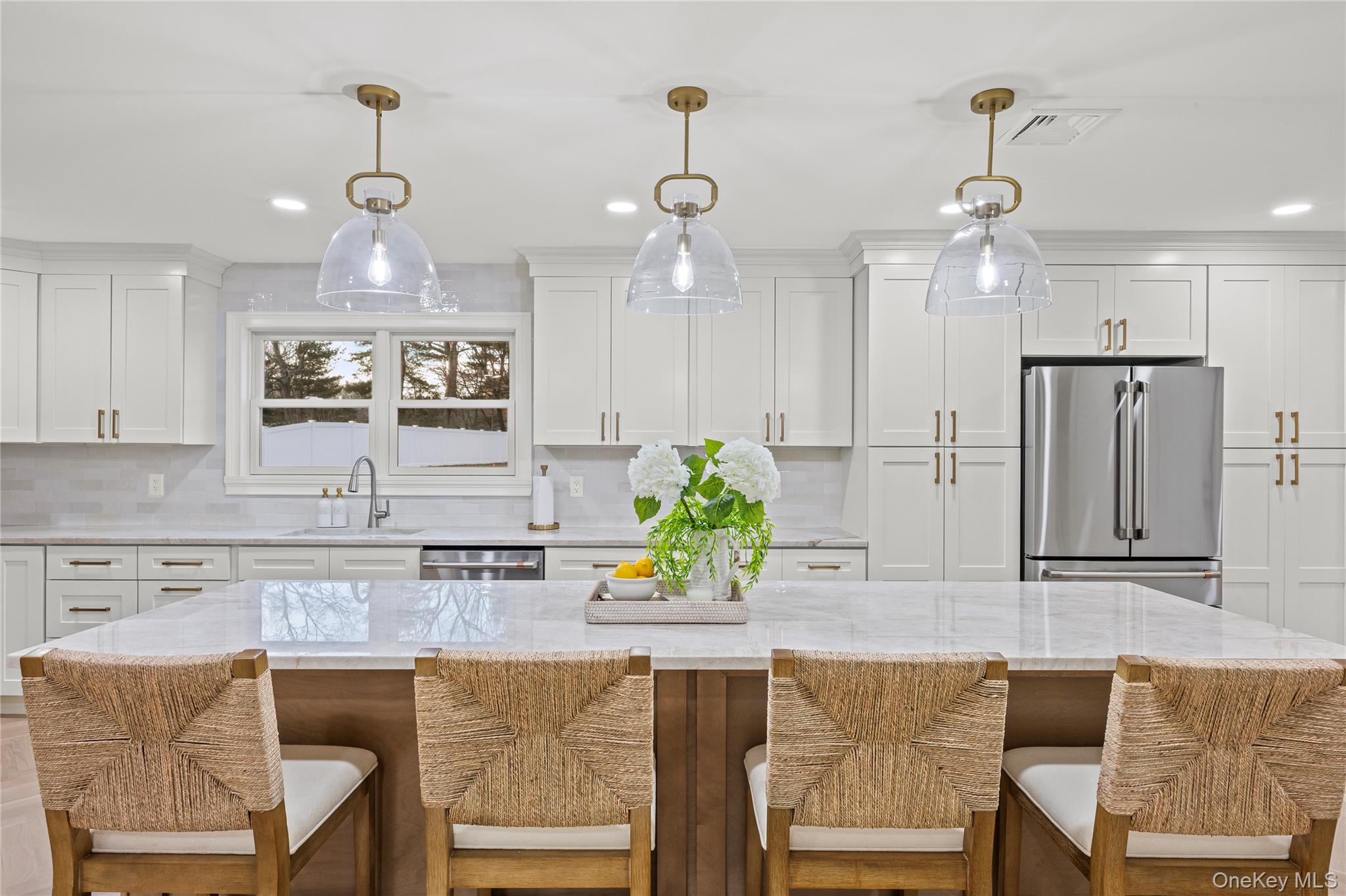 Welcome to this completely renovated and expanded split ranch located in the highly sought- after Smithtown School District. Meticulously rebuilt taken down to the studs, with no detail overlooked. This stunning home offers 4 spacious bedrooms and 3 full bathrooms, including an impressive primary suite with a spa-like ensuite bathroom and 2 oversized closets. Show stopping kitchen, complete with over-sized island Taj Mahal quartzite countertops, brand new GE Cafe Stainless Steel appliances, wine fridge, walk-in pantry closet and white oak herringbone wood floors flowing through the kitchen and dining area perfect for entertaining. A large den and finished basement provide abundant living and recreational space. Outdoors, enjoy a generous backyard with endless potential. Electric has already been run to the shed with a dedicated sub panel, making it pool, gazebo or outdoor kitchen ready. With new roof, siding, plumbing, electric, HVAC, windows, PVC Vinyl fencing and 8 zone In-Ground Sprinklers this home offers peace of mind and luxury of new construction. A rare opportunity to own a truly turn key, high end home in a prime Smithtown location.