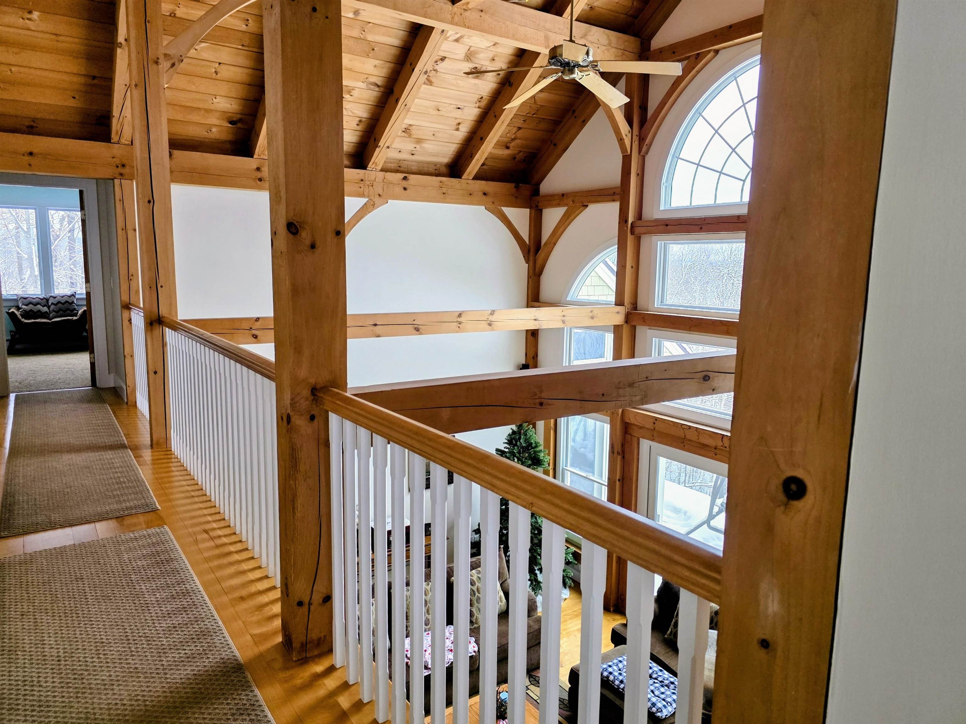 This awesome Timberpeg, post and beam home, which was built in 1998 on 5. 02 acres, provides endless comfort and functionality. Enter and feel the warmth of oil fired radiant flooring, gorgeous wood and abundant light. The home was designed by the owner to flow effortlessly from the eat in kitchen with convection cooking, stainless appliances and large island, abundant cupboards and open views, into the formal dining room and on into the living area where windows look east over an expansive 52 ft PVC deck and cleared frontage. The living room, with cathedral ceiling and doors to the deck, offers the ambience of a floor to ceiling stone wood burning fireplace and an unobstructed view of far distant hills. Follow the convenient hallway to the primary bedroom suite also surrounded by windows. The main floor has a separate office/den or play room, with windows on 2 sides. The main area has an abundance of storage and easy access to the 3 car garage. Upstairs along the balcony there are additional bedrooms and a cozy library nook, and a media room. When not relaxing in the comfort of this home, you can go outside and enjoy the privacy of being surrounded by woods and the safety of a cul de sac. Pre approved buyers only or proof of funds.