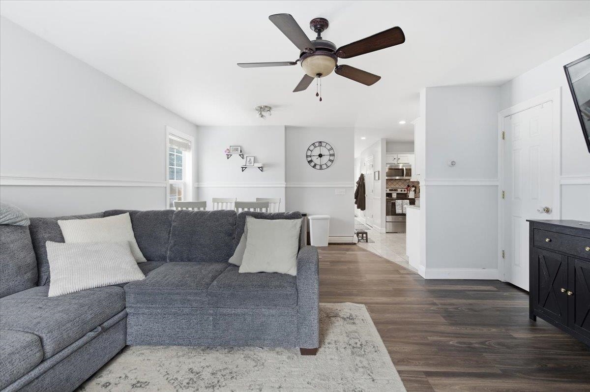 Come see what this sunny end-unit condo has to offer. The kitchen’s beautiful wood cabinets and wood plank flooring pair with modern granite counters. The kitchen opens to dining and family rooms with door to back deck. Capping out the first floor is half bath and large pantry. Upstairs you’ll find 3 bedrooms with closets to match, highlighted by a walk-in closet in the primary bedroom. More wood plank flooring for clean and updated look. 2nd Floor laundry is conveniently close to the bedrooms. Multi zone heating. A one car attached and heated garage is on its own zone. Outdoors enjoy the private deck overlooking a grassy lawn area. Condo is located at the southern end of town, a short walk to the diner, with quick access to I-89. Lower association dues.