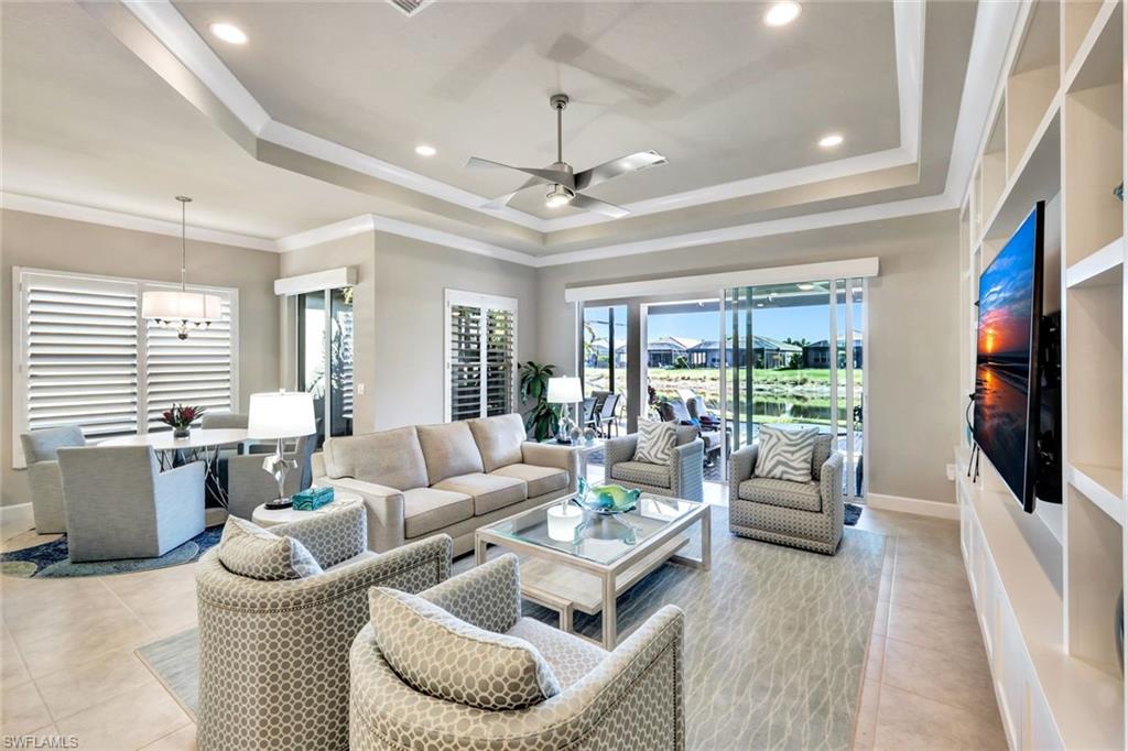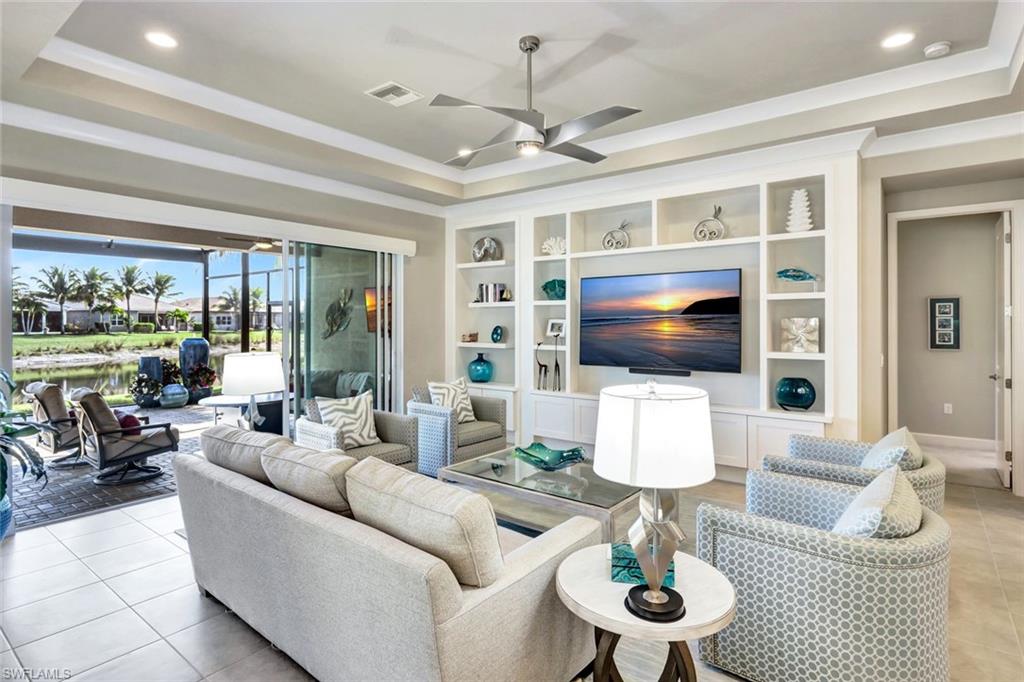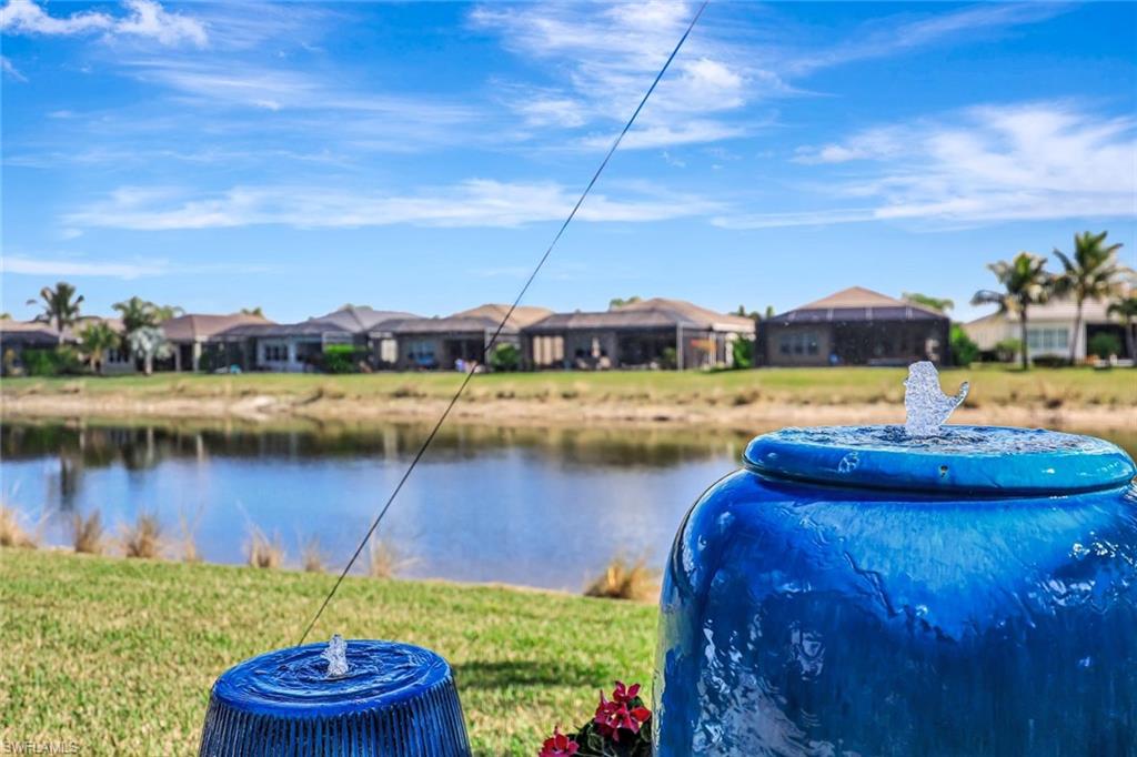 Additional features include an epoxy-coated garage floor, workbench and cabinets in the garage and a beautiful laundry room with sink & cabinetry allowing for all the storage space you could desire, a tankless hot water system, many electrical options added by the builder such as additional outlets and recessed lighting, plantation shutters, spectacular lighting fixtures and ceiling fans, custom drawer additions, primary bedroom closet organizers and much more. Step outside onto your covered patio with an additional patio deck enclosed with a picture window screen providing a large space to entertain or just relax while looking at the serene lake view. Motorized shades at great room sliders.
