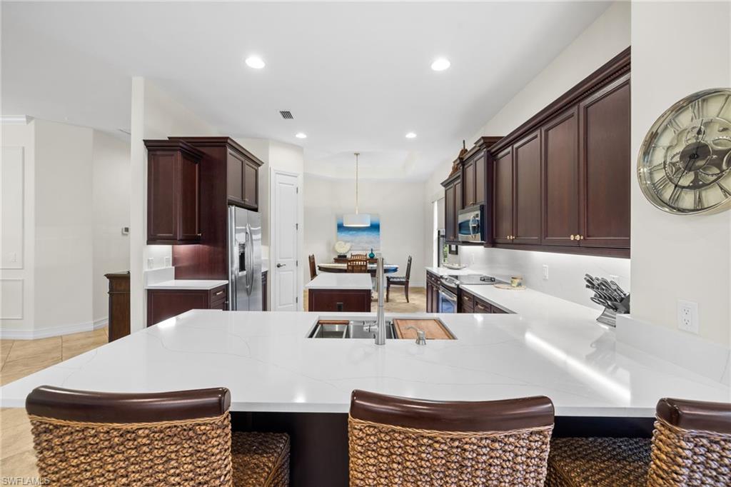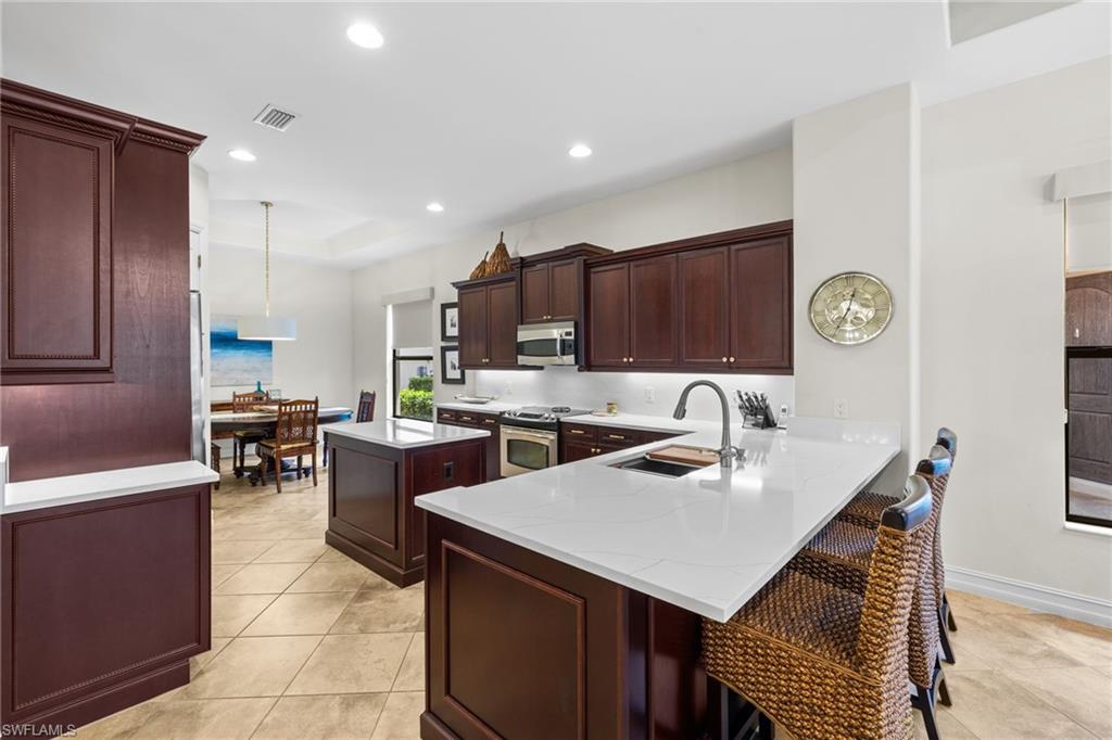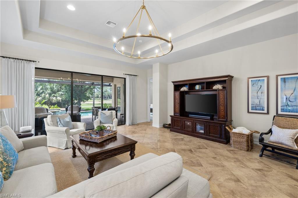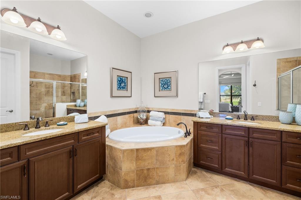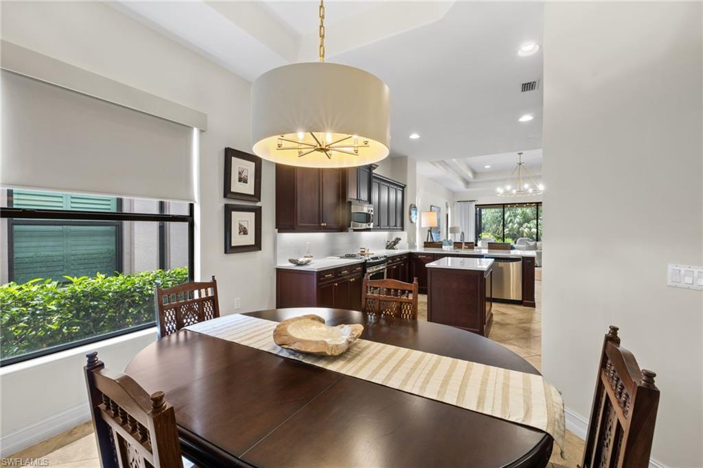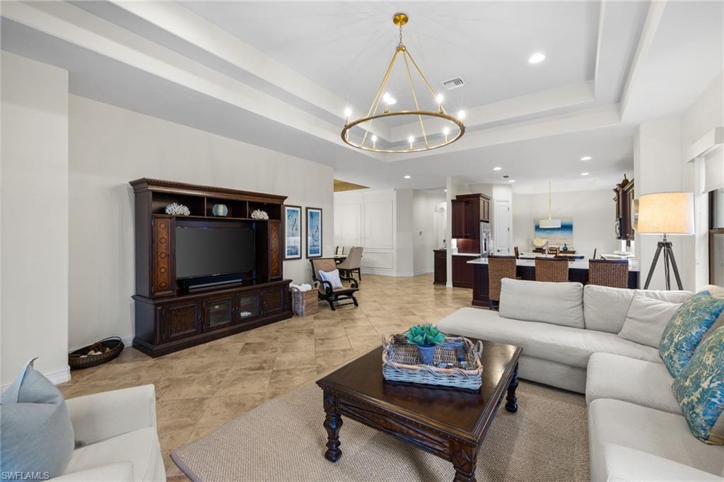 Updated & Move-In Ready Home in the desirable community of Moorgate Point at Lely Resort. This beautifully maintained residence offers a spacious open floor plan that seamlessly connects comfortable indoor living with inviting outdoor spaces, ideal for both entertaining and everyday living. The kitchen was updated in 2022 with sleek quartz countertops, modern hardware, a new sink, and faucet - offering both style and function around a generous island and breakfast bar. A bright breakfast nook and a formal dining room, accented by crown molding and wall trim, provide flexible dining spaces for everyday meals or entertaining. All bedrooms feature durable engineered hardwood flooring, while updated paint, fans and light fixtures throughout the home add a contemporary finish. The private master suite offers a peaceful escape with high tray ceilings, walk-in closets, and added security with power metal storm shutters. Additional roller shutters protect side windows, ensuring comfort and peace of mind. The redesigned lanai is perfect for outdoor living, featuring a resurfaced pool (2021), spa, new picture window screen enclosure (2023), landscape lighting, a mounted TV, and built-in Sonos-connected speakers for relaxing or entertaining guests. Additional upgrades include a new A/C and heating system (2024), water heater (2025), garage air conditioning with added insulation (2022), a new washer and dryer (2023), and concrete corbels (2023) for lasting exterior durability. Residents enjoy exclusive access to The Players Club with resort-style amenities: three pools, tennis, bocce, pickleball, on-site dining, and a tiki bar. Golfers will appreciate nearby access to one private and two public courses. Conveniently located near Naples and Marco Island, this move-in ready home offers modern updates, thoughtful features, and a prime location close to beaches, shopping, dining, and entertainment.