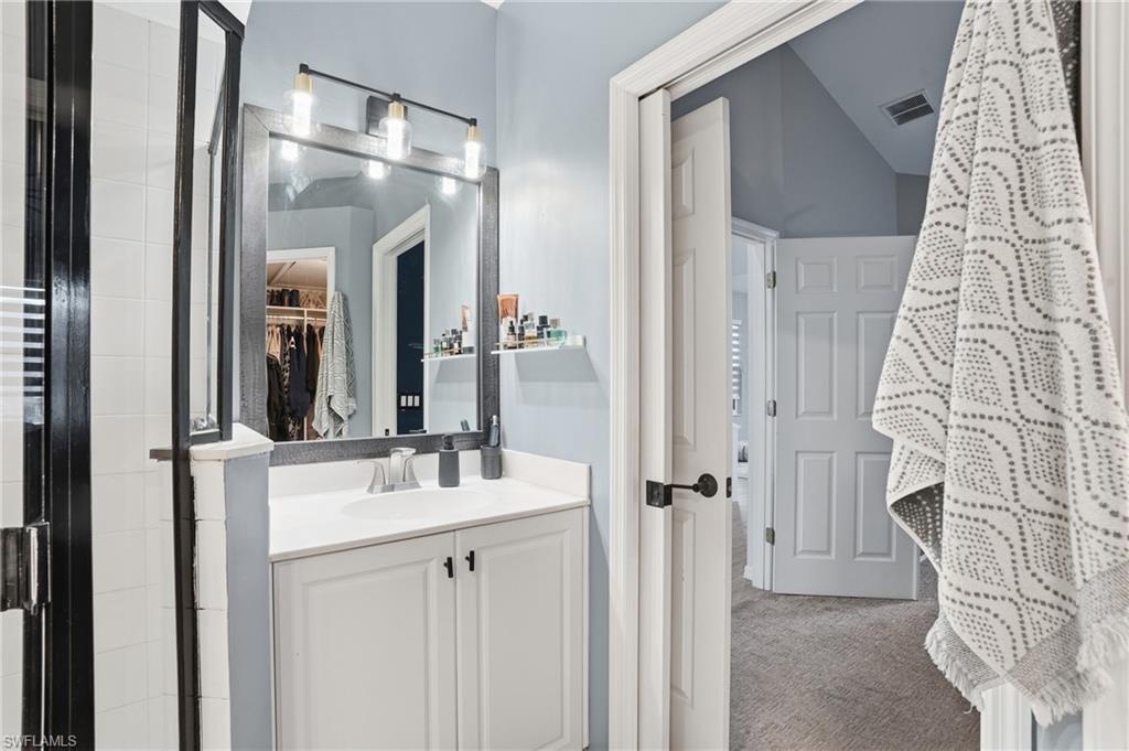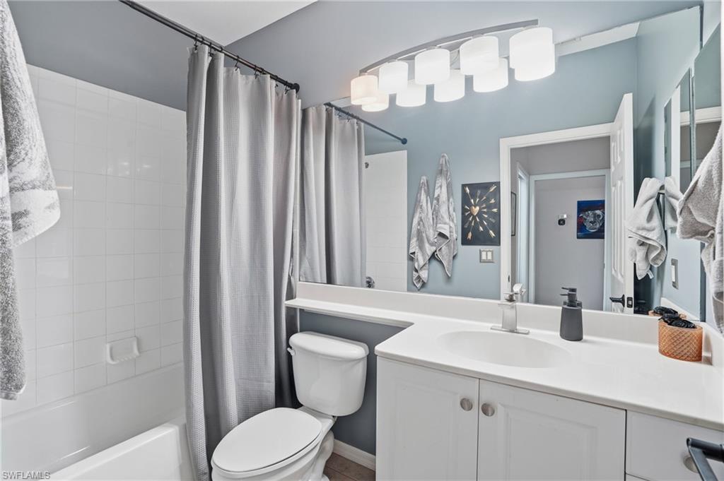 This stunning 3-bedroom, 2-bath condominium with a one-car garage offers 1, 920 square feet of living space beneath soaring vaulted ceilings, ideally located in the desirable Sabal Palm neighborhood of Grandézza. The open and airy great room provides ample space for both living and dining, featuring wide-plank ceramic tile flooring and oversized sliding glass doors that open to a spacious western-facing lanai with serene lake and golf course views—an ideal setting to enjoy breathtaking Florida sunsets.