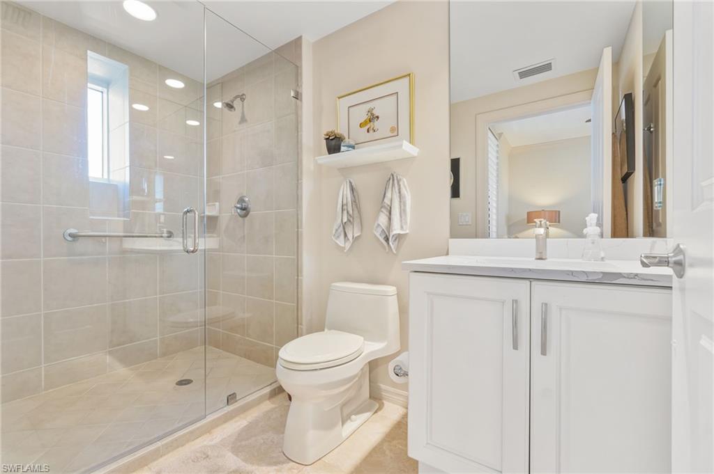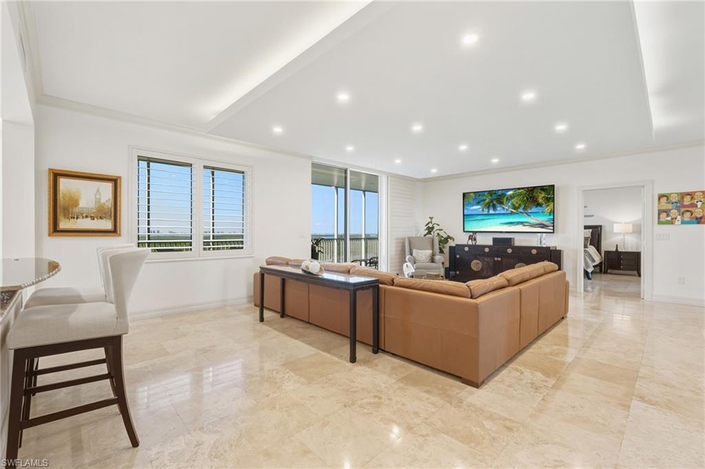 Enjoy sweeping western views and stunning sunsets from the expansive lanai of this beautifully updated 8th-floor, 3-bedroom, 3-bath residence in Jasmine Bay South at West Bay Club. Two premium extra wide, side by side parking spots are available with this unit, just steps from the elevator. This light and airy condominium offers an ideal blend of refined finishes and relaxed coastal living, with panoramic vistas that stretch across the preserve, bay, and beyond. The residence features a beautiful bright kitchen with granite countertops and new backsplash, premium cabinetry with generous drawer storage, stainless steel appliances, and a raised extended island perfect for casual dining and entertaining. Upgrades include new lighting, plantation shutters, ceiling fans, and a shallow drop ceiling in main living area that provides tremendous dimmable light, plus ambient lighting for a soft lit glow. Also enjoy private elevator entry, fresh interior paint, crown molding throughout and travertine marble floors. The spacious primary suite boasts custom closets, dual vanities, and a spa-like bath. The eastern-facing balconies off both guest bedrooms offer beautiful morning sun and gentle cross-breezes. Jasmine Bay residents enjoy an upscale amenity package including an infinity-edge pool, fitness room, hot tub, gas grilling area, cabanas, and four private guest suites ideal for visiting friends and family. West Bay Club is a premier lifestyle community where nearly all amenities—excluding optional golf membership—are included in the HOA. Residents enjoy the private Gulf-front Beach Club with restaurant and bar, chair and towel service; the recently renovated Bay House featuring a resort-style pool, Aqua Café, and state-of-the-art fitness center; and River Park, offering a fishing pier, boat launch with Gulf access, kayak and canoe storage, playground, basketball court, pickleball, tennis, bocce, boat storage, and two dog parks. Optional memberships are available for the private 18-hole Pete & P. B. Dye championship golf course and clubhouse.