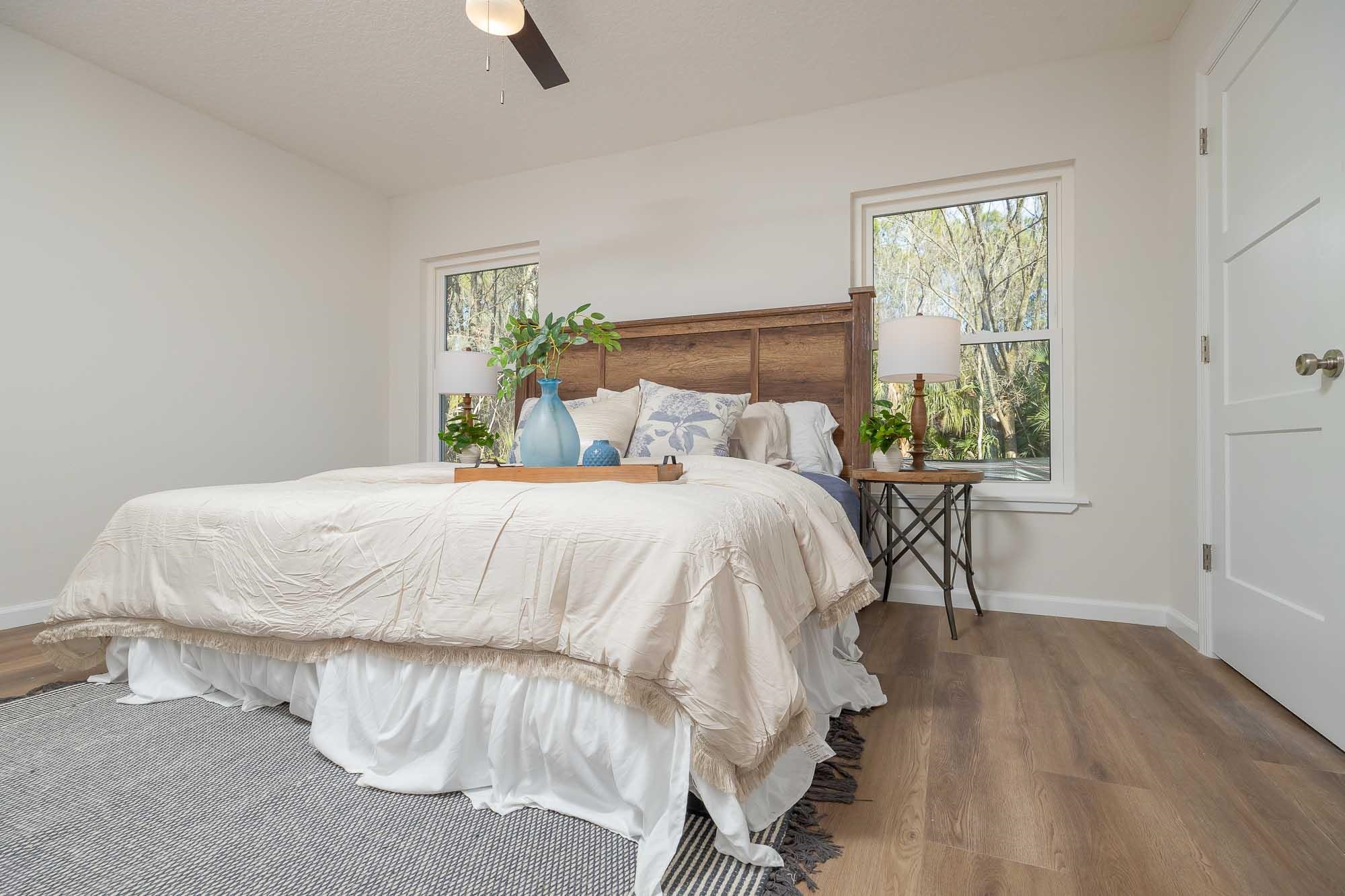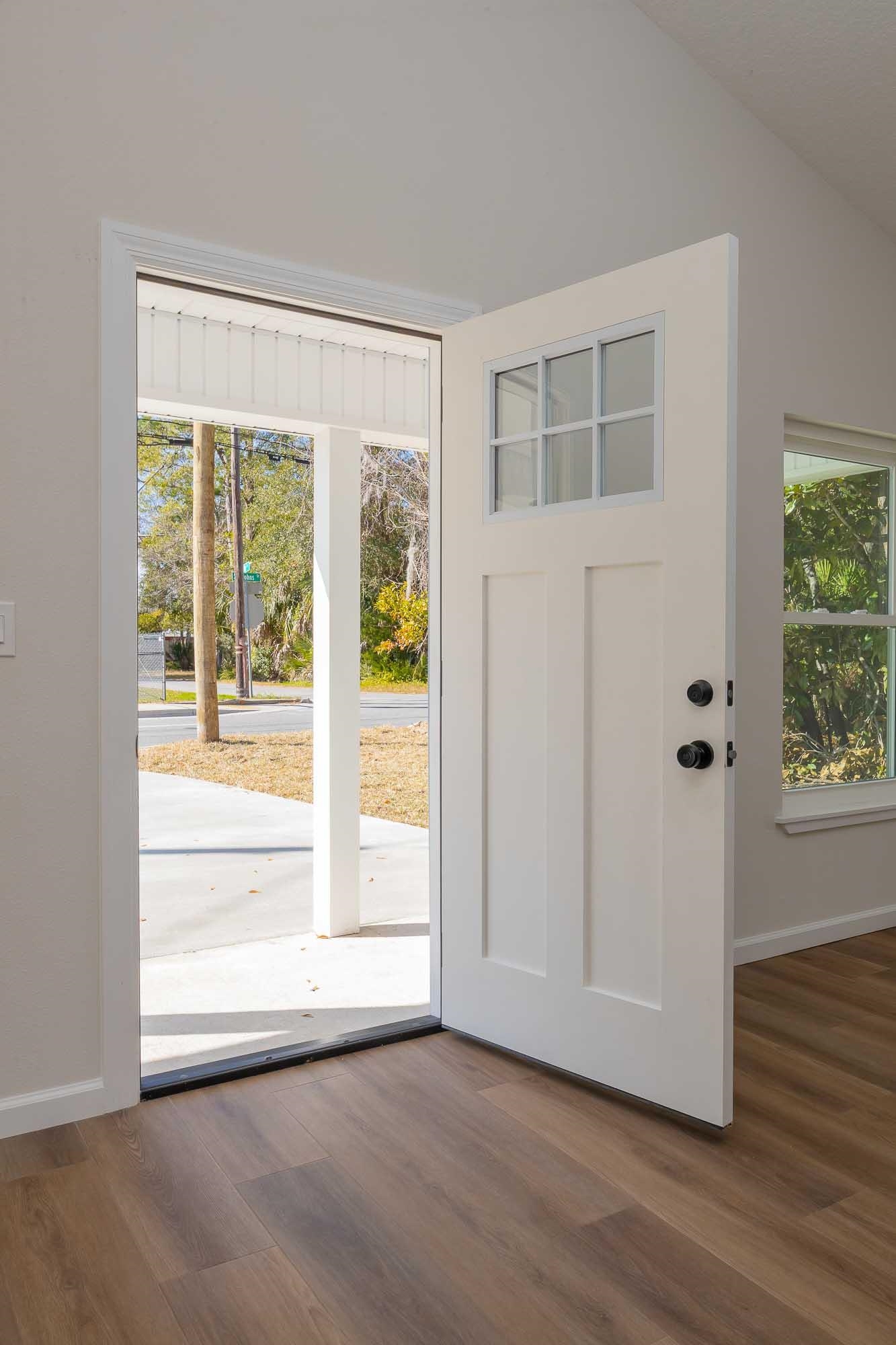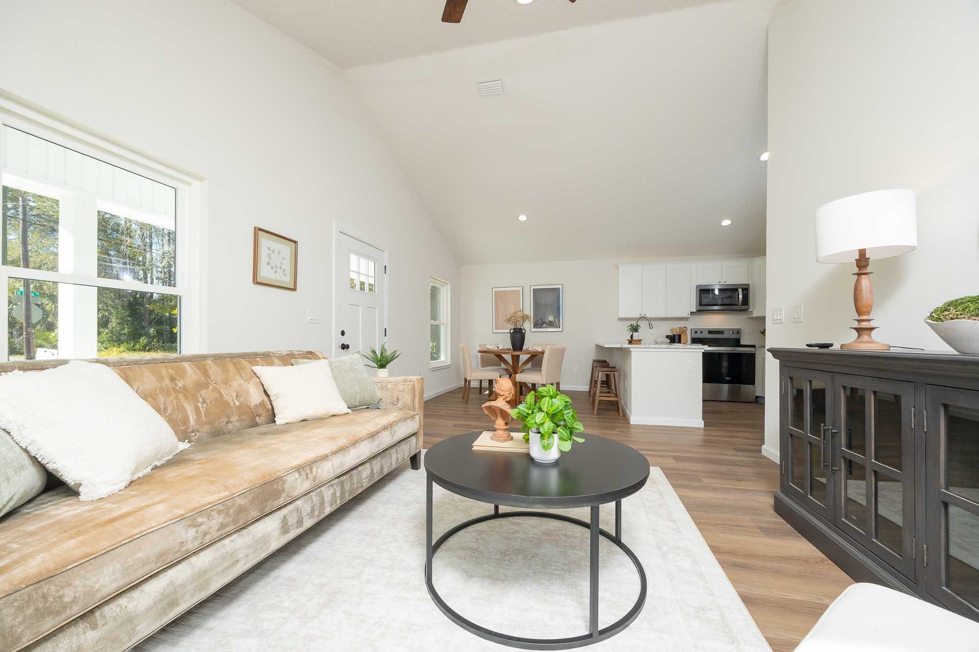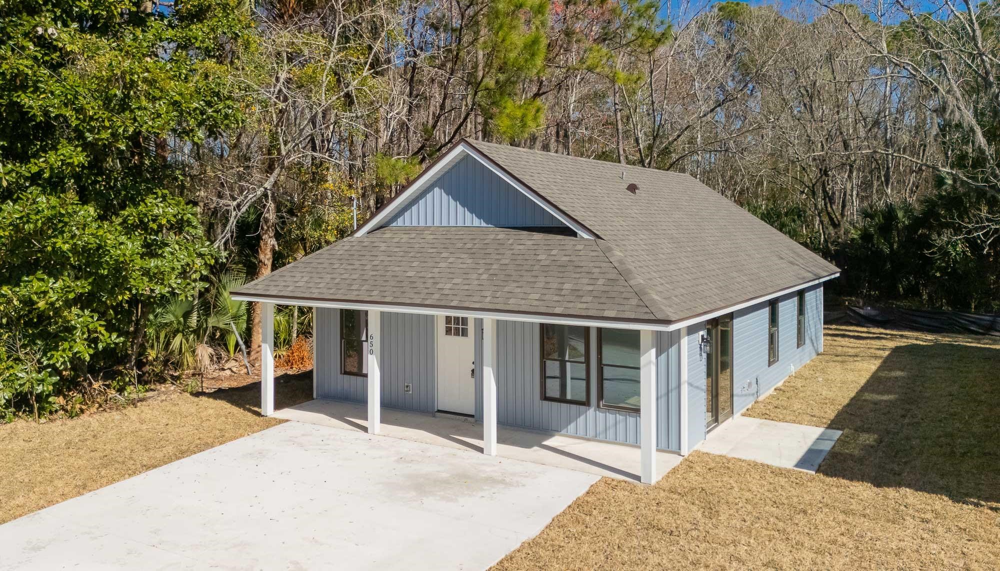 BRAND NEW 3BR/2BA HOME. Open, spacious, light & bright floor plan. Large 26' covered front porch. Beautiful light colored luxury vinyl plank floors throughout. Kitchen with upscale wood cabinets & gorgeous granite counters. Tankless water heater. Owner suite with walk in tiled shower & large walk in closet. Additional walk in closet in 2nd bedroom. Custom tile in 2nd bathroom. Vaulted ceiling, recessed lighting plus full sized laundry closet. Roomy living room with sliders leading to outdoor patio & spacious back yard made possible by having sewer connection & no septic hump taking up valuable space. Treed area borders north side of home for privacy. Built by native, family owned TOP TEN custom builder who puts pride in his work! NO RESTRICTIONS means you can park a boat in the yard, or use it as an investment and rent by the night. 1. 5 miles to historic downtown & 6. 4 miles to the beach! 2 BRAND NEW HOMES SIDE BY SIDE! EXTRA WIDE DRIVEWAY FITS UP TO 6 CARS!