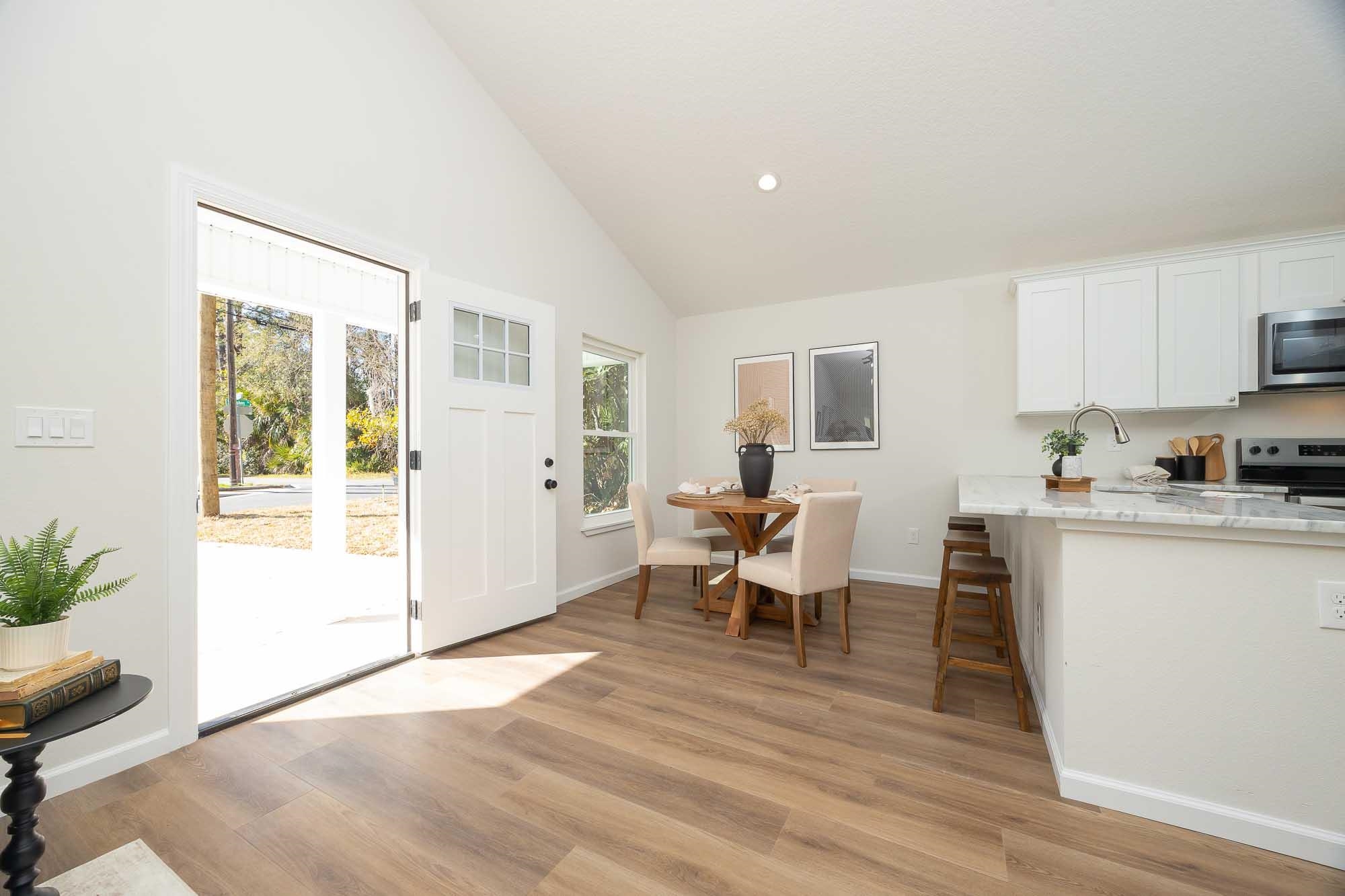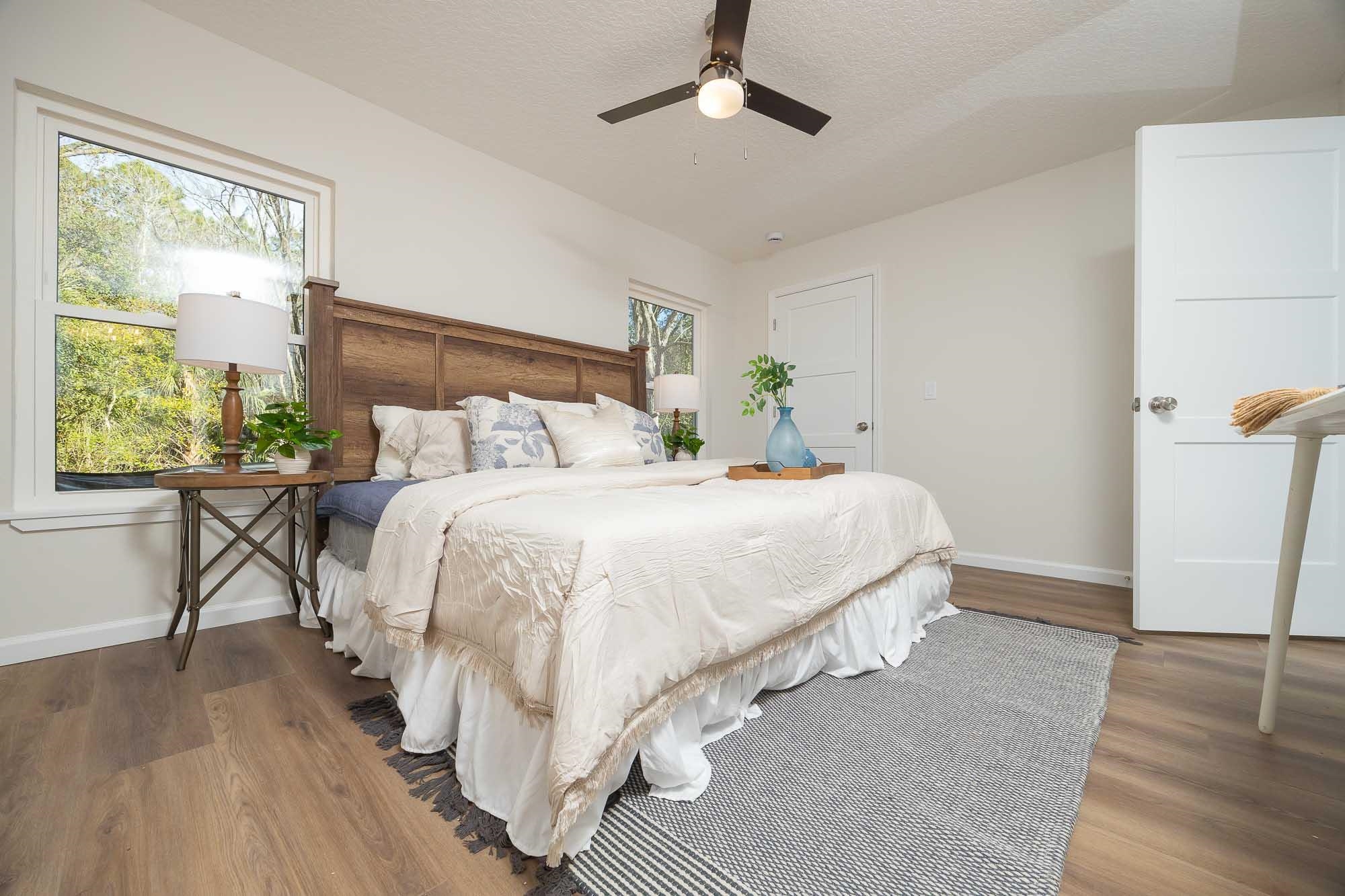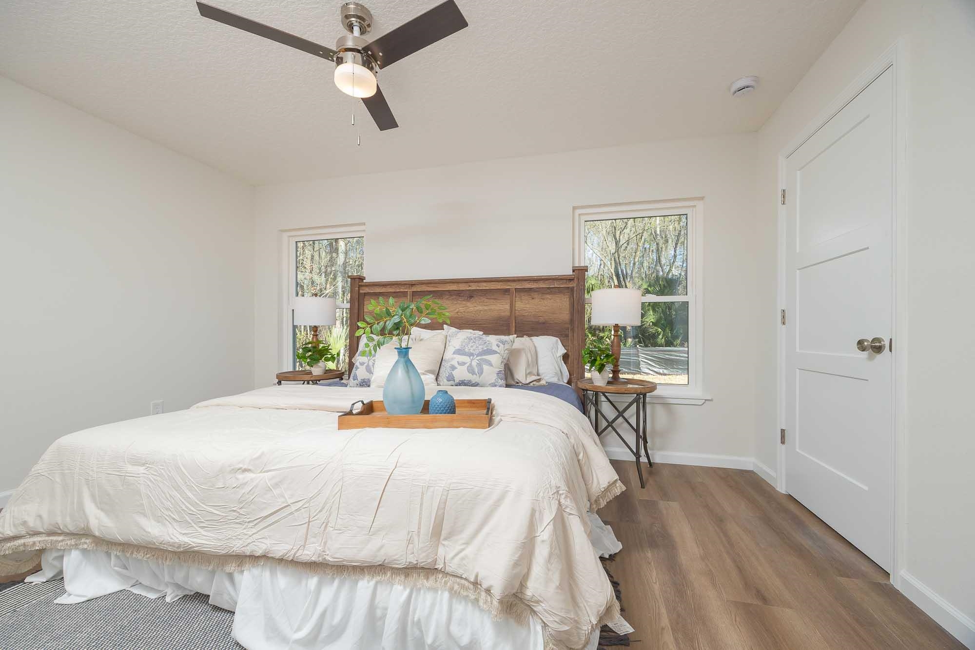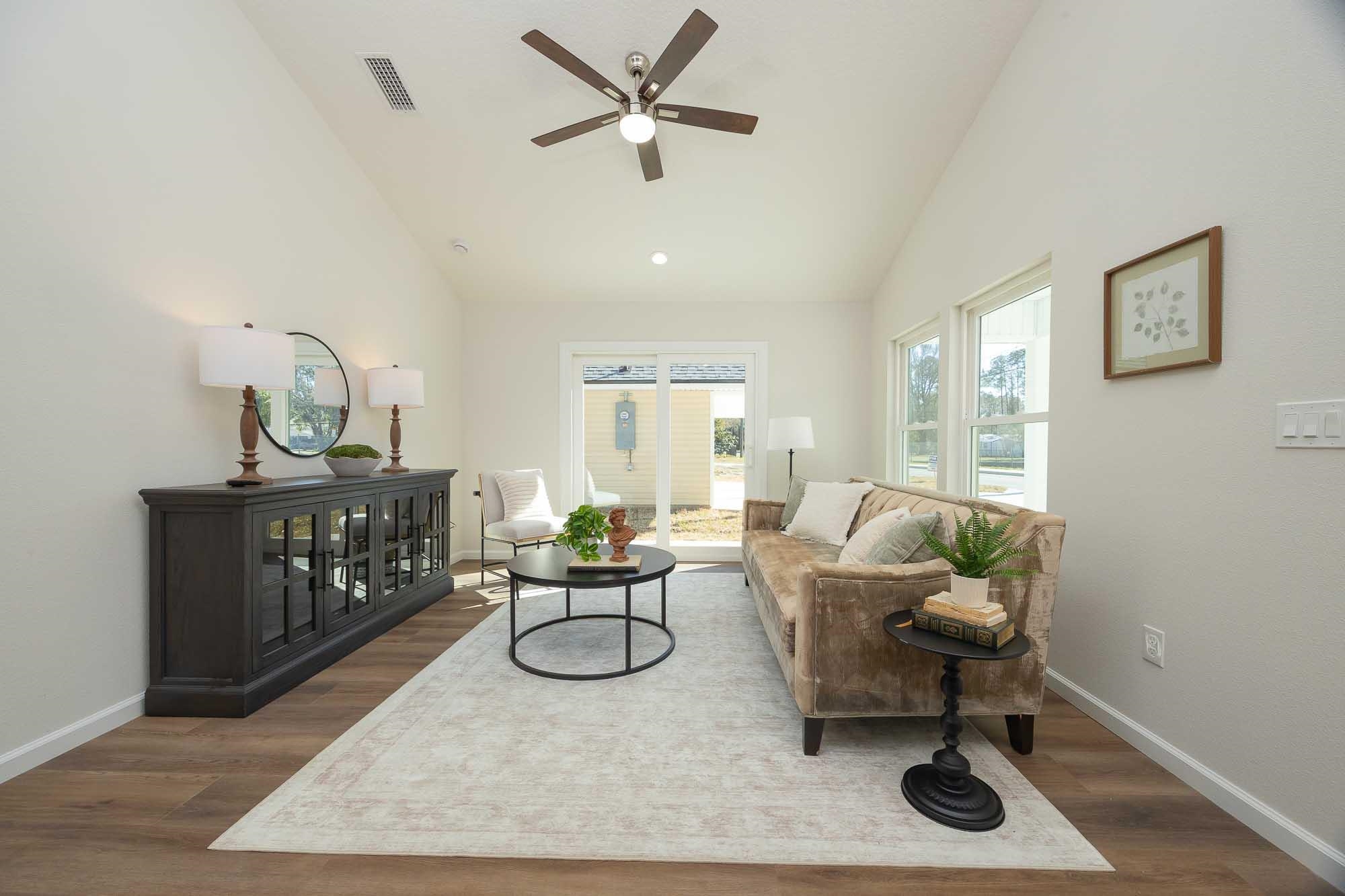 BRAND NEW 3BR/2BA HOME. Open, spacious, light & bright floor plan. Large 26' covered front porch. Beautiful light colored luxury vinyl plank floors throughout. Kitchen with upscale wood cabinets & gorgeous granite counters. Tankless water heater. Owner suite with walk in tiled shower & large walk in closet. Additional walk in closet in 2nd bedroom. Custom tile in 2nd bathroom. Vaulted ceiling, recessed lighting plus full sized laundry closet. Roomy living room with sliders leading to outdoor patio & spacious back yard made possible by having sewer connection & no septic hump taking up valuable space. Treed area borders north side of home for privacy. Built by native, family owned TOP TEN custom builder who puts pride in his work! NO RESTRICTIONS means you can park a boat in the yard, or use it as an investment and rent by the night. 1. 5 miles to historic downtown & 6. 4 miles to the beach! 2 BRAND NEW HOMES SIDE BY SIDE! EXTRA WIDE DRIVEWAY FITS UP TO 6 CARS!