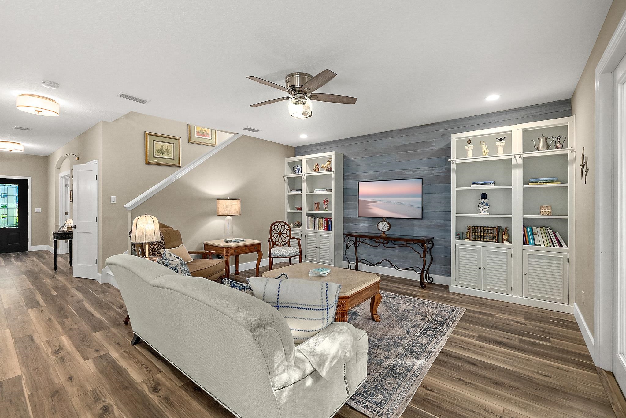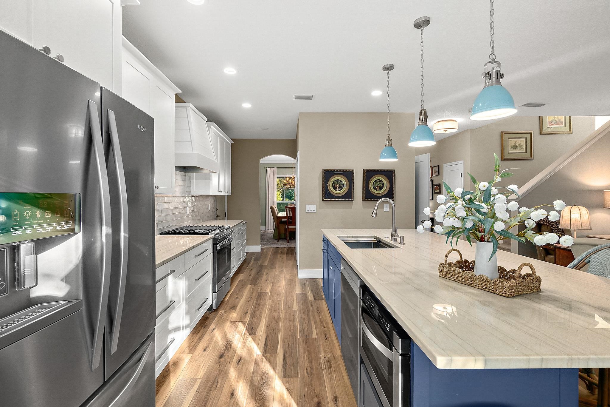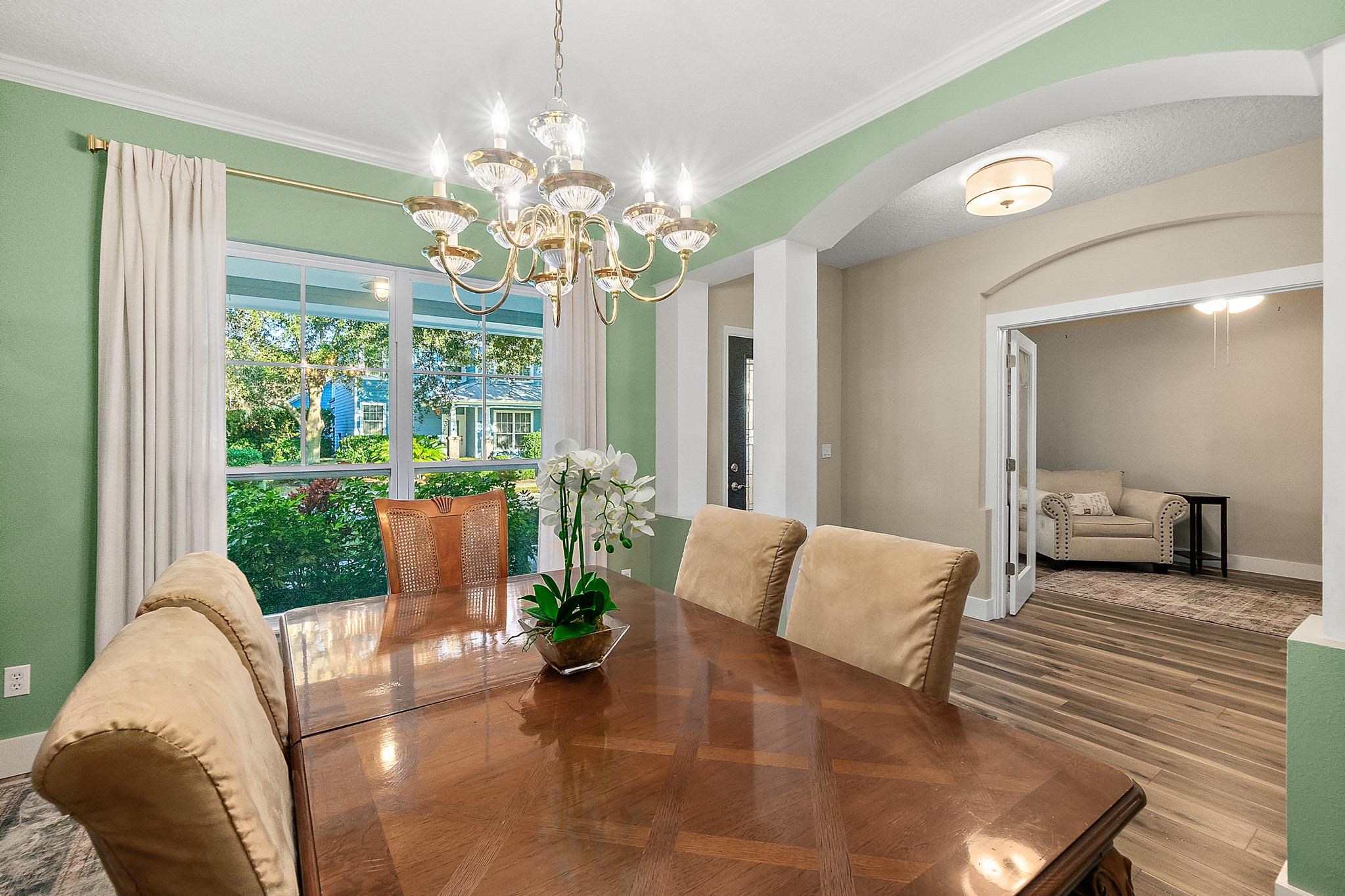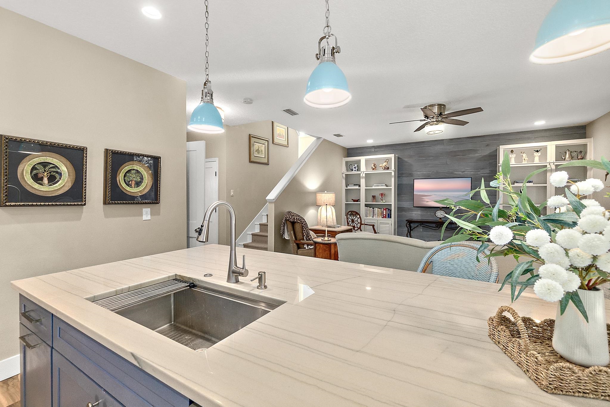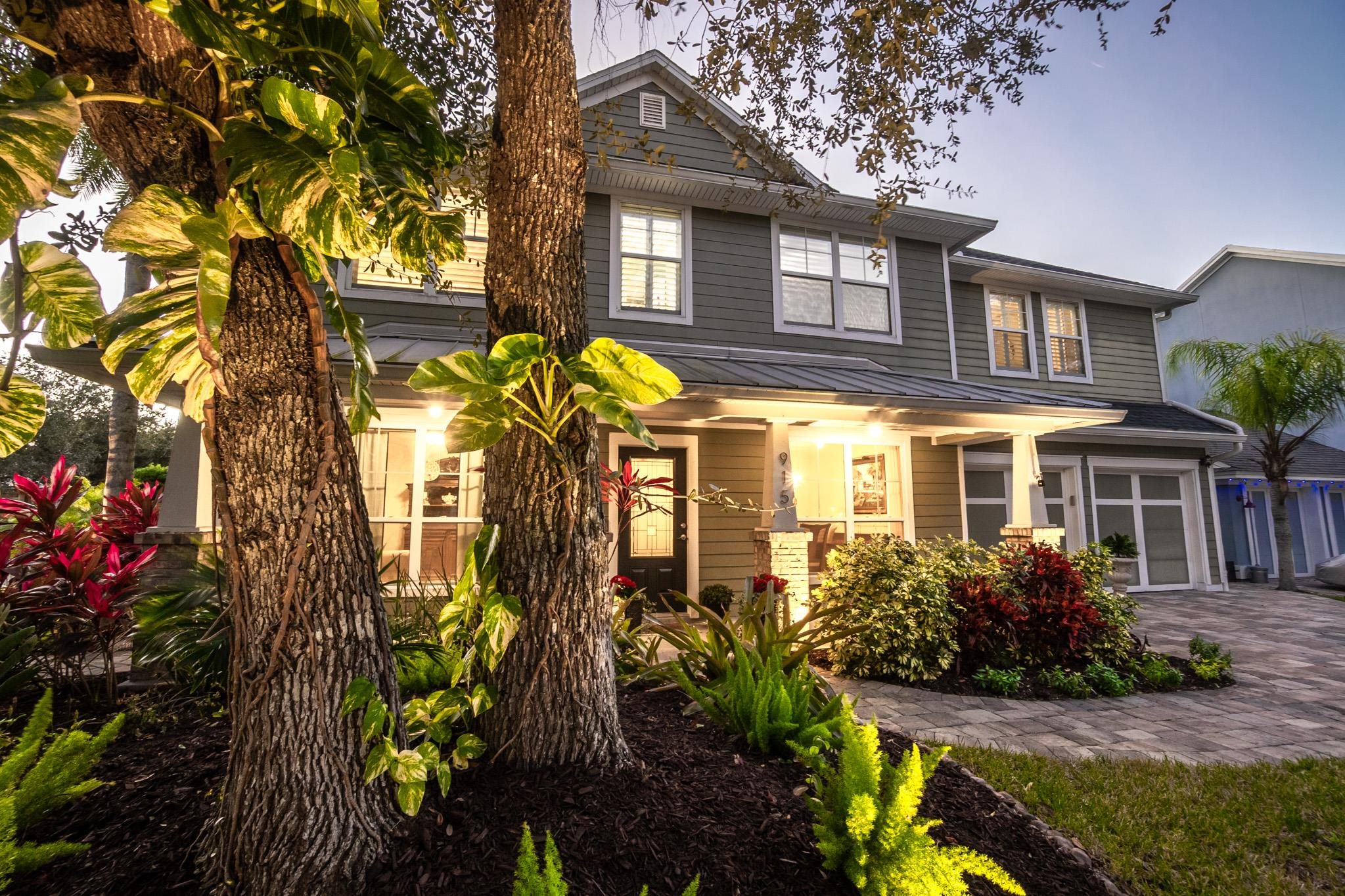 Located in the sought-after, family-friendly Sea Grove neighborhood on Anastasia Island, this 2, 680-square-foot home offers the perfect blend of comfort, style, and coastal living. Curb appeal is immediate, with a welcoming paver driveway and walkway setting the tone as you approach the home, enhanced by exterior flood lights that provide added security and nighttime visibility. Inside, the light-filled interior balances modern finishes with timeless design. Just off the foyer, a private office enclosed with glass French doors provides an ideal space for working from home, virtual meetings, or quiet study time. At the center of the home is a thoughtfully designed kitchen built for both everyday living and entertaining. It features a gas range, stainless steel appliances, an oversized island, and elegant quartzite countertops that offer both beauty and durability, and the added benefit of a whole-home water softener. The kitchen flows seamlessly into the living area, making it easy to stay connected while cooking or hosting, while a formal dining room nearby is perfect for holiday gatherings and special occasions. Upstairs, all four bedrooms are designed for privacy and comfort. Two spacious primary suites each include their own en-suite bathrooms, creating flexible living options for multi-generational households or guests. One of the primary suites offers a spacious, sun-filled bedroom with gorgeous backyard views and opens directly to a charming balcony, ideal for enjoying peaceful mornings or unwinding in the evening. The remaining two bedrooms share a Jack-and-Jill bathroom, offering both functionality and convenience. The home offers abundant storage throughout, with spacious closets and smartly designed storage areas that enhance everyday living. Dual HVAC systems with separate upstairs and downstairs units provide efficient climate control throughout the home. Set on a larger lot within the community, the backyard provides plenty of room for outdoor play, pets, or future enhancements. Outdoor living is elevated with a convenient outdoor shower and bathtub—perfect after a day at the beach—along with low-maintenance irrigation supported by a private well and a propane connection on the patio, ideal for outdoor cooking or a future fire feature. Mature fruit trees, including kumquat, key lime, and mango, add charm, shade, and a unique coastal touch to the outdoor space. Sea Grove is known for its laid-back coastal atmosphere, and this home is perfectly positioned to enjoy it all. Take a short bike ride to the beach or stroll to the community pool, library, post office, and nearby dining. This is Anastasia Island living at its best—comfortable, convenient, and close to everything that matters.