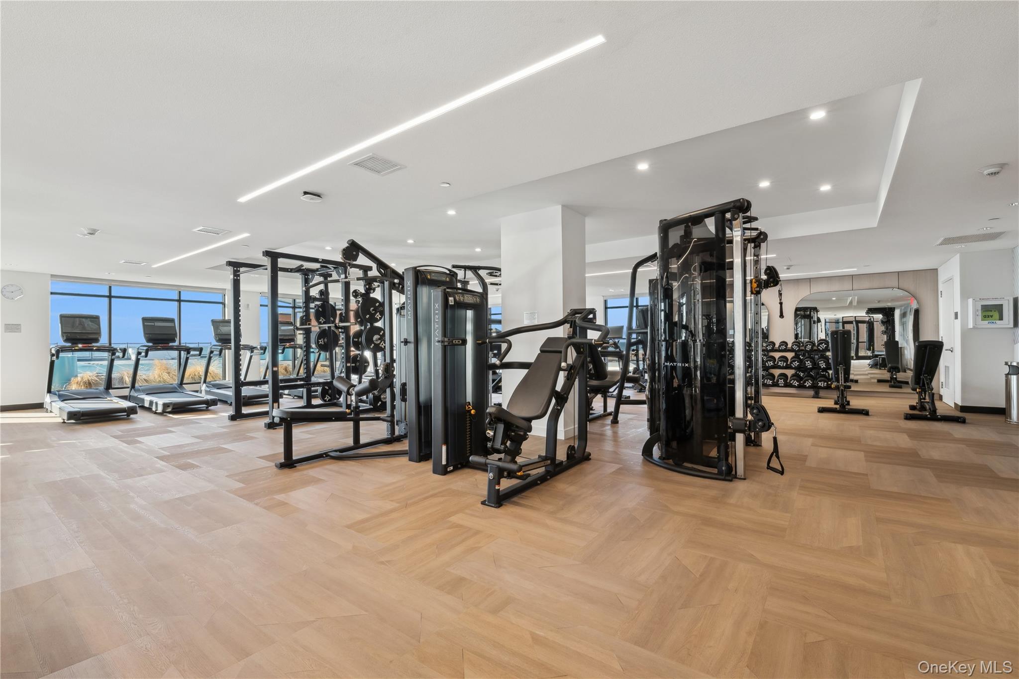 Live where refined design meets the rhythm of the ocean. The Boardwalk offers a rare opportunity to own an oceanfront residence in Long Beach that feels equal parts sophisticated retreat and everyday sanctuary. Set directly along the iconic boardwalk, this luxury condominium delivers a resort-inspired lifestyle with elevated architecture, thoughtful details, and effortless coastal living. This expansive 1, 918 square foot home features two bedrooms, two bathrooms, and a flexible den, all curated with intention and comfort in mind. Floor-to-ceiling windows line the residence, complemented by motorized Hunter Douglas solar shades on every window and door, allowing light and privacy to be perfectly balanced throughout the day. Wide-plank 7" European blond oak flooring flows seamlessly from room to room, while recessed lighting enhances the living room, dining area, and den. Two private terraces totaling 301 square feet extend the living space outdoors, creating the ideal setting for quiet mornings and breezy evenings by the sea. The open-concept great room with sliders to the 1st terrace, anchors the home and flows into a sleek, contemporary kitchen outfitted with custom Italian cabinetry with LED under counter lighting, Porcelanosa sintered stone countertops and backsplash, an oversized island, and polished nickel Kohler fixtures. A fully integrated Bosch appliance suite includes a five-burner gas cooktop, convection wall oven, ducted hood, French door refrigerator and freezer, microwave, and custom-paneled dishwasher. The expansive primary suite is a tranquil escape, offering its own 2nd private terrace, 2 oversized walk-in closets with custom interiors, and a dedicated office space/ library or dressing area. The spa-like en-suite bathroom is fully tiled from floor to ceiling and features decorative tile floors, a custom double vanity with Kohler undermount sinks, and a glass-enclosed rain shower. The secondary bathroom is equally refined, with fully tiled walls, double vanity, and glass-enclosed shower. A spacious second bedroom with walk-in closet is located just off the other side of the great room with sliders to the 2nd terrace. In addition to the 2 bedrooms there is a versatile den/ office/ or guest room located just off the living room. This condo also offers a discreet utility closet with a in unit stackable vented Whirlpool washer and dryer, 2 zone heat/CAC, a storage unit, and 2 individual parking spots. In addition, ceiling junction boxes are already in place in the living room, dining area, primary bedroom, den and library, offering flexibility for future lighting or fans. Both oversized closets and the library/dressing area are equipped with electrical outlets for added convenience. Thoughtful upgrades continue throughout, including Benjamin Moore Regal Select paint, screens on all windows and doors, additional fire and carbon monoxide detectors, and a Simple Safe system alarm system making this a turn key move in ready home. Life at The Boardwalk extends far beyond the residence itself. More than 40, 000 square feet of indoor and outdoor amenities offer a true resort-style experience, including a seasonal oceanside saltwater pool, private cabanas available for purchase, club and dining rooms for entertaining, a co-working lounge, outdoor kitchens, tennis court, putting green, private dog run, children's playroom, pet grooming station, and a state-of-the-art fitness studio with training room, saunas and complimentary valet parking. Ideally located near Long Beach’s restaurants, shops, and daily conveniences, The Boardwalk also provides easy access to Manhattan in under an hour via the Long Island Rail Road. A home designed for how you live now—elevated, effortless, and oceanfront. Welcome to The Boardwalk.