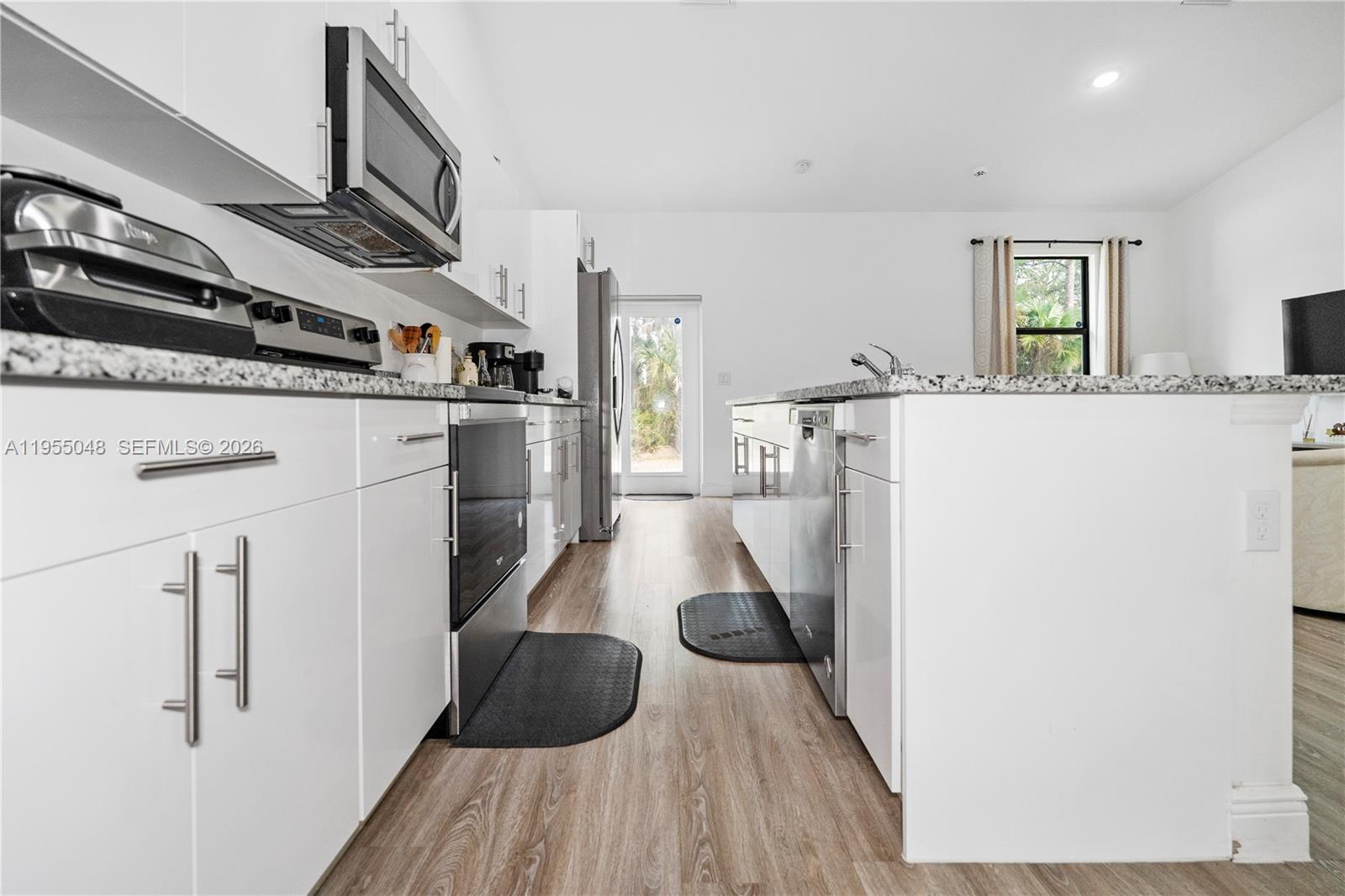 This beautiful 3-bedroom, 2-bathroom home, built in 2022, is located in the growing community of LaBelle, Florida, and sits on a spacious ¼-acre lot with a 2-car garage. Designed with comfort and style in mind, the property features an open-concept kitchen with elegant high-gloss white cabinetry, stainless steel appliances, and granite countertops, seamlessly flowing into the main living areas. The home offers waterproof laminate flooring throughout, thoughtfully selected to complement the granite surfaces and neutral wall colors. Both bathrooms are fully tiled and feature modern vanities with granite countertops and refined finishes. High ceilings throughout the property enhance the sense of space and natural light, while impact-resistant windows and doors provide added security and energy efficiency. As a newer construction, this home offers long-life systems and the benefit of more affordable property insurance. Additional features include a complete ADT security system with cameras and door and window alarms, washer and dryer, and partial furnishings, including a living room set, dining table, sofa, and more—all included in the sale. This move-in-ready home combines modern design, quality construction, and valuable upgrades, making it an excellent opportunity for homeowners or investors alike.