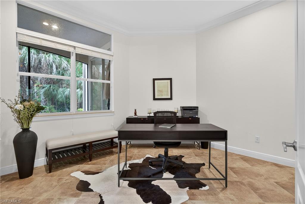 The primary suite offers a private sitting area, coffered ceilings, a large picture window, and direct access to the spacious screened lanai with gorgeous views of the reserve.
