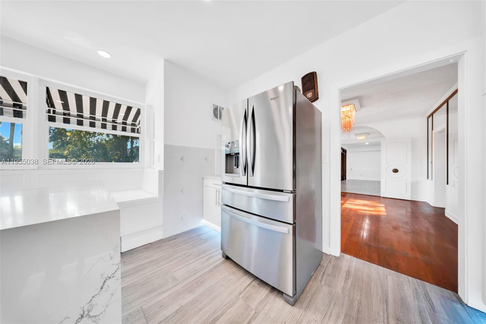 Exquisite contrast of old and new defines this 5-bedroom, 4. 5-bath residence. Original hardwood floors set the tone throughout, complemented by a formal front room with a wood-burning fireplace, an elegant dining room, and a family room/library with Mahogany French doors opening to a grand sunroom filled with natural light, all enhanced by impact windows throughout. Two downstairs primary bedrooms share a spacious, newly remodeled Jack-and-Jill bathroom featuring dual shower heads, including a relaxing rain shower and a therapeutic option. A third downstairs bedroom functions perfectly as a nanny or housekeeper suite with access to a full bath. Upstairs, two en-suite bedrooms retain original hardwood floors and timeless character.