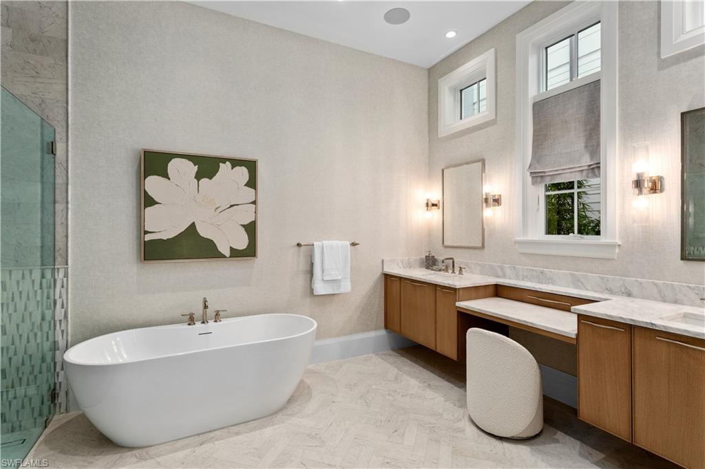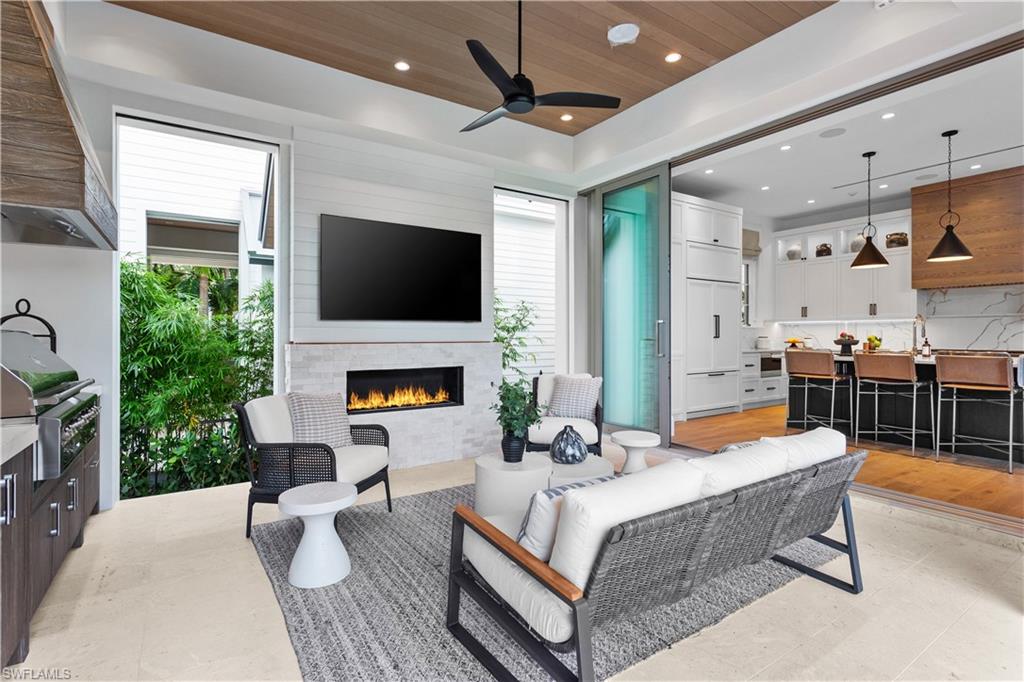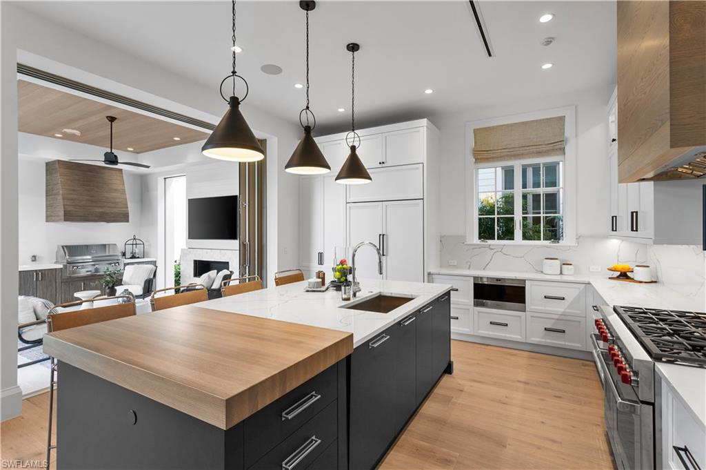 Outdoors, the rear courtyard is designed for relaxed entertaining, centered around a custom pool and spa, covered lounge, full outdoor kitchen, and pool bath. The setting is private and quiet, enhanced by alley access. A three-car garage—an uncommon amenity in Old Naples—features extra ceiling height suitable for vehicle lifts or specialized storage.