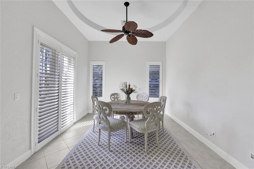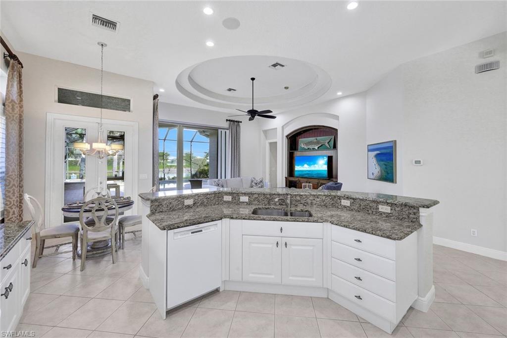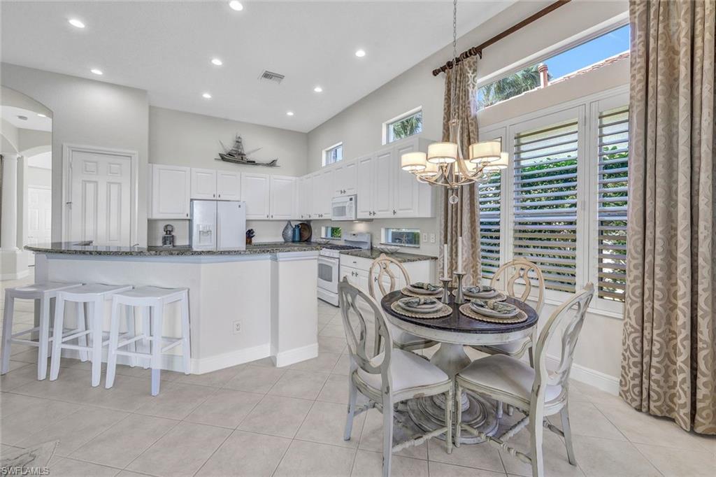 The bright, open kitchen is both functional and inviting, featuring a gas range, solid-surface countertops, and a charming breakfast nook. A thoughtfully designed layout allows for effortless flow from the interior living spaces to the expansive lanai, complete with hurricane-rated drop-down screens—ideal for year-round enjoyment.