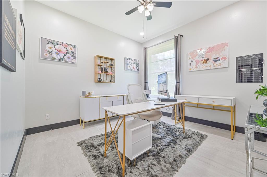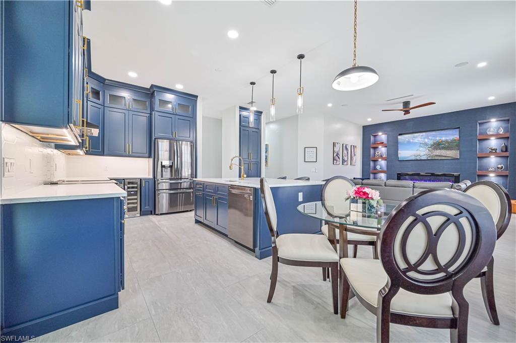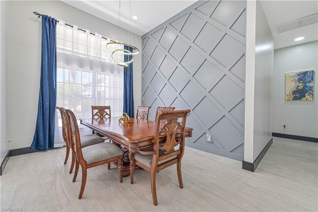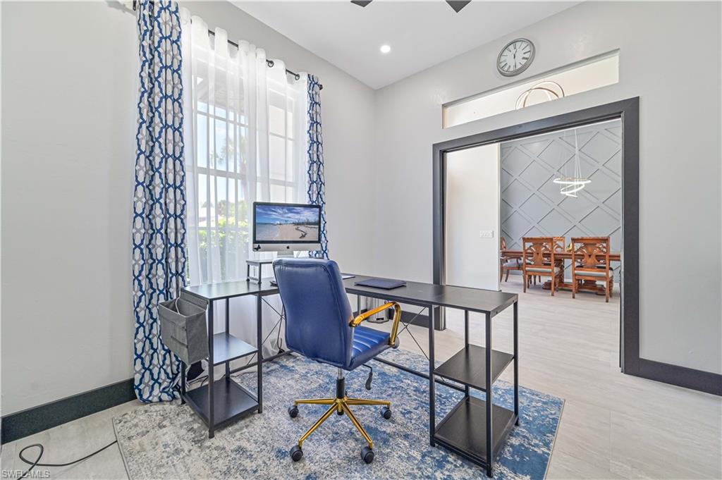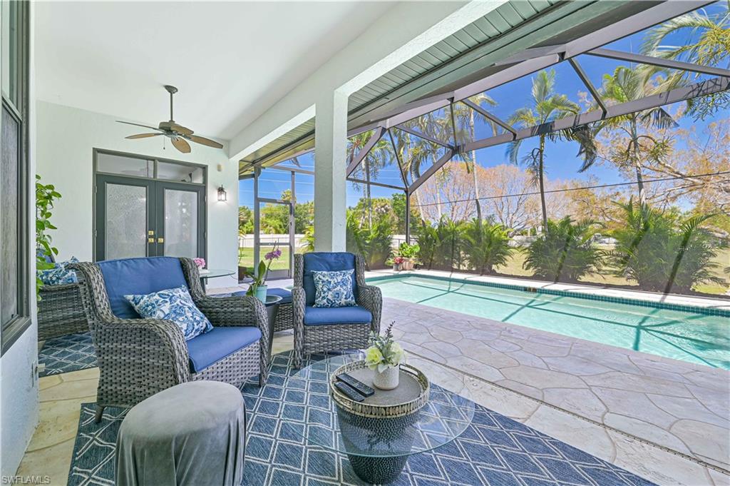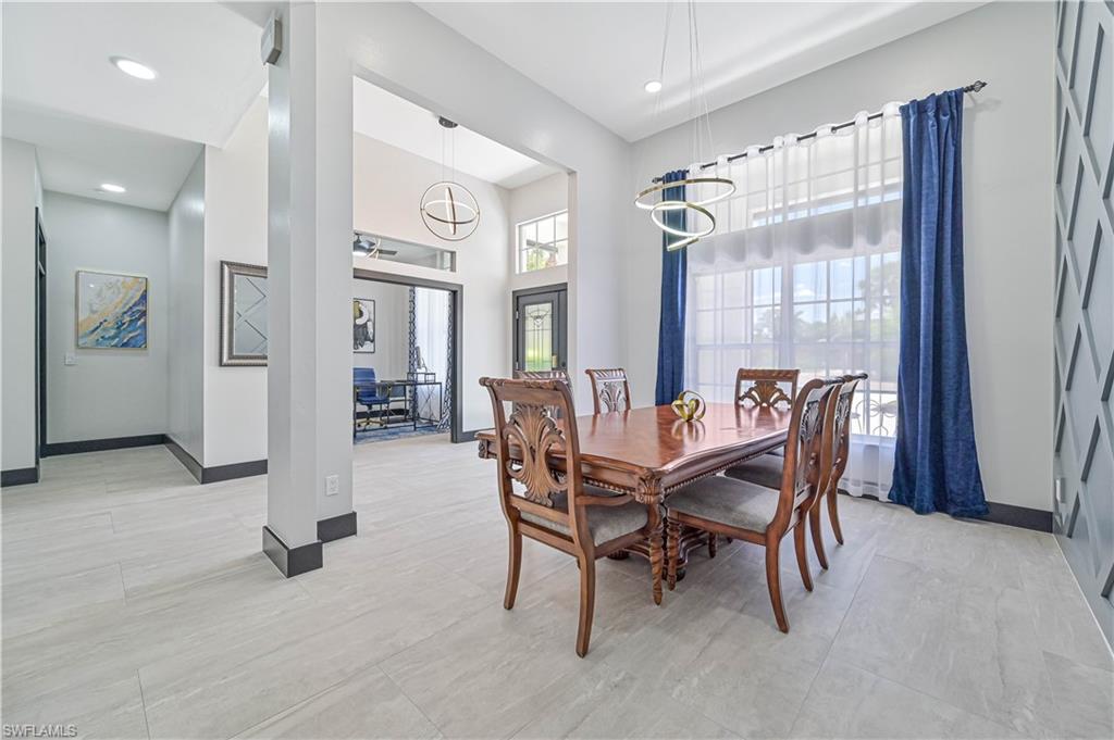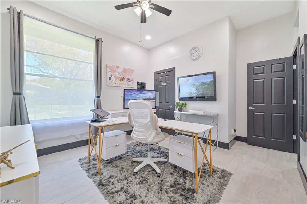 Price Adjustment! Welcome to this impeccably updated residence, which has 3BRs plus a versatile den, and 3BAs, an encompasses 2, 396 square feet of indoor living space. Set on an oversized lot with beautifully landscaped grounds and white exterior, this home offers curb appeal and privacy. Step inside to discover the large porcelain tiles, with complementary interior paint, and stylish 5-inch baseboards that grace every room. The updated kitchen is a chef's delight, featuring sleek cabinets, quartz countertops, and top-of-the-line appliances including a refrigerator, range, dishwasher, microwave, and a wine fridge. The home's interior is illuminated by recessed lights and light fixtures, designed for both functionality and style. The primary bedroom is a haven of comfort with French doors that open to a covered lanai and sparkling pool, overlooking a serene pond. The primary bathroom is a serene retreat with its modern cabinets, quartz countertop, Bluetooth ventilation fan, and a glass-enclosed shower adorned with gold-accented faucets. The primary closet features a custom organizational system with shelves, drawers, and hangers, catering to all your wardrobe needs. The dining room captivates with its diamond-inspired feature wall and modern light fixture, while the living room offers a stunning focal point with grass cloth wallpaper, an electric fireplace, and lighted shelving. The guest bath has been transformed with contemporary updates, including cabinets, quartz countertops, black fixtures, Bluetooth ventilation fan, and a tiled shower with a sleek sliding glass door. Updates to the laundry room include cabinets, sink, quartz countertop, and a stylish tiled backsplash. The backyard is fully fenced, ideal for small dogs. Enjoy the privacy of your covered lanai, offered by the uniquely-shaped lot. This home is a perfect blend of elegance and practicality, designed to offer unparalleled comfort and style. Centrally located within SWFL, with a short drive along the major thoroughfares of I-75 and US-41 to malls, restaurants, shops, beaches, golf, and other fun activities. HOA is only $500/Year!