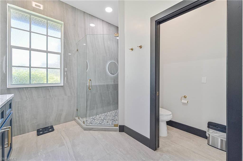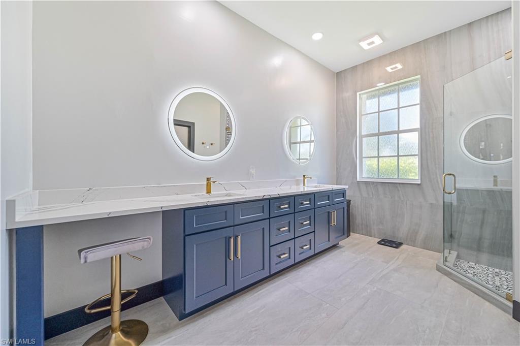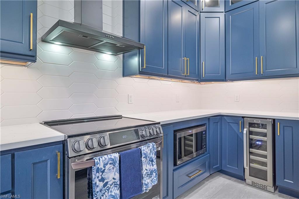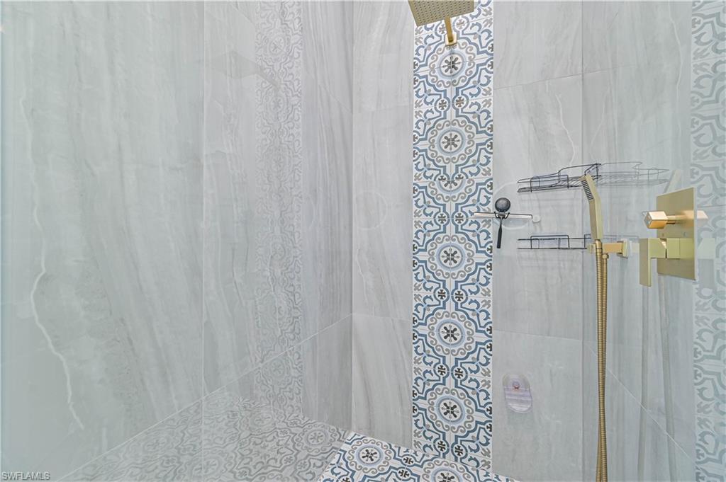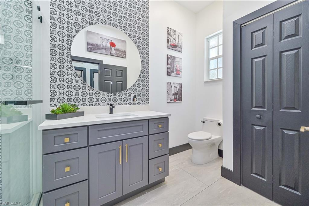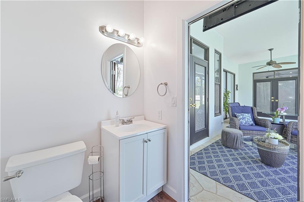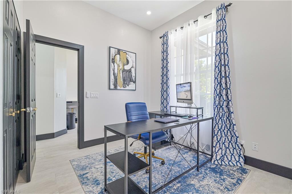 Price Adjustment! Welcome to this impeccably updated residence, which has 3BRs plus a versatile den, and 3BAs, an encompasses 2, 396 square feet of indoor living space. Set on an oversized lot with beautifully landscaped grounds and white exterior, this home offers curb appeal and privacy. Step inside to discover the large porcelain tiles, with complementary interior paint, and stylish 5-inch baseboards that grace every room. The updated kitchen is a chef's delight, featuring sleek cabinets, quartz countertops, and top-of-the-line appliances including a refrigerator, range, dishwasher, microwave, and a wine fridge. The home's interior is illuminated by recessed lights and light fixtures, designed for both functionality and style. The primary bedroom is a haven of comfort with French doors that open to a covered lanai and sparkling pool, overlooking a serene pond. The primary bathroom is a serene retreat with its modern cabinets, quartz countertop, Bluetooth ventilation fan, and a glass-enclosed shower adorned with gold-accented faucets. The primary closet features a custom organizational system with shelves, drawers, and hangers, catering to all your wardrobe needs. The dining room captivates with its diamond-inspired feature wall and modern light fixture, while the living room offers a stunning focal point with grass cloth wallpaper, an electric fireplace, and lighted shelving. The guest bath has been transformed with contemporary updates, including cabinets, quartz countertops, black fixtures, Bluetooth ventilation fan, and a tiled shower with a sleek sliding glass door. Updates to the laundry room include cabinets, sink, quartz countertop, and a stylish tiled backsplash. The backyard is fully fenced, ideal for small dogs. Enjoy the privacy of your covered lanai, offered by the uniquely-shaped lot. This home is a perfect blend of elegance and practicality, designed to offer unparalleled comfort and style. Centrally located within SWFL, with a short drive along the major thoroughfares of I-75 and US-41 to malls, restaurants, shops, beaches, golf, and other fun activities. HOA is only $500/Year!