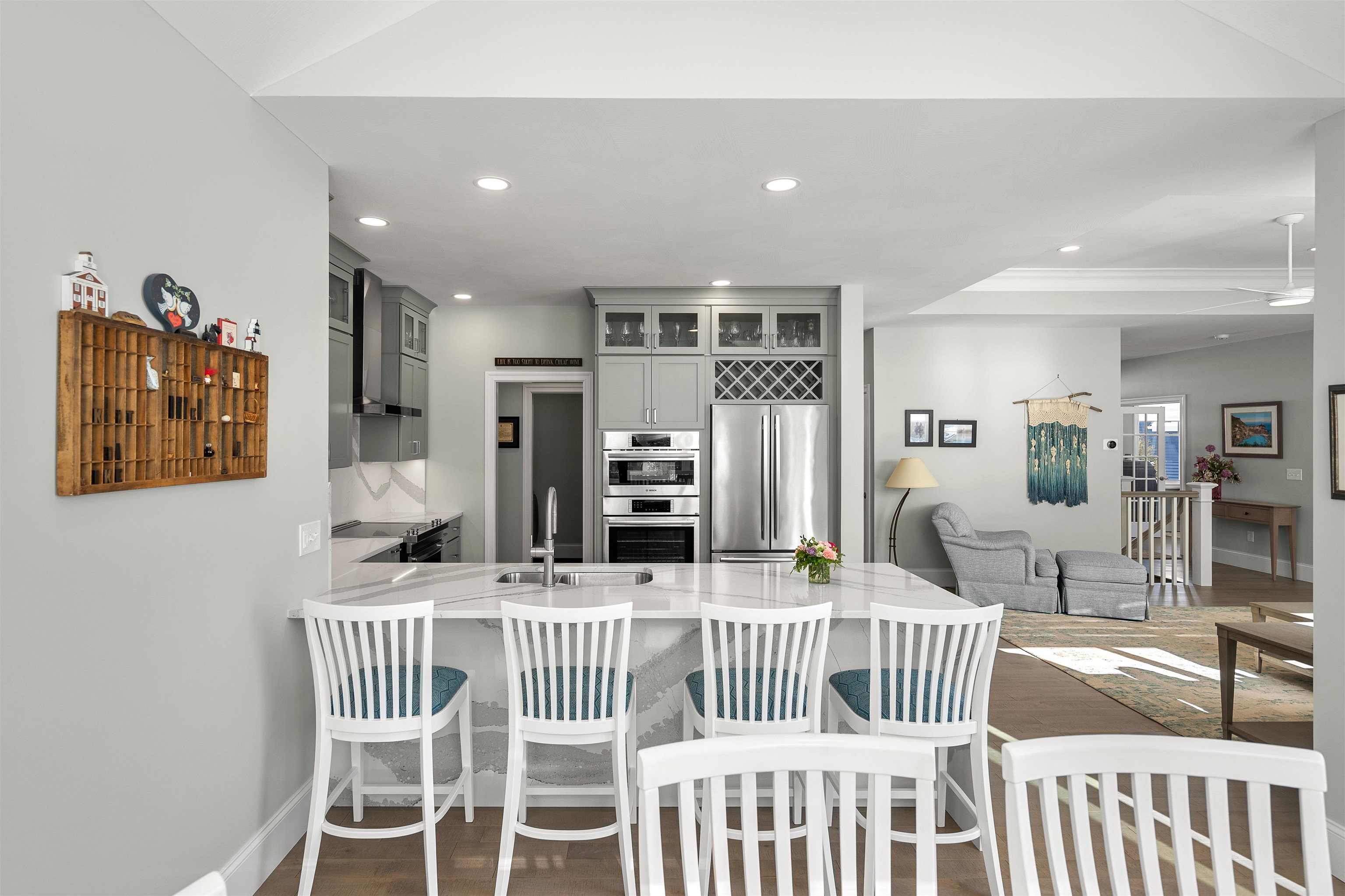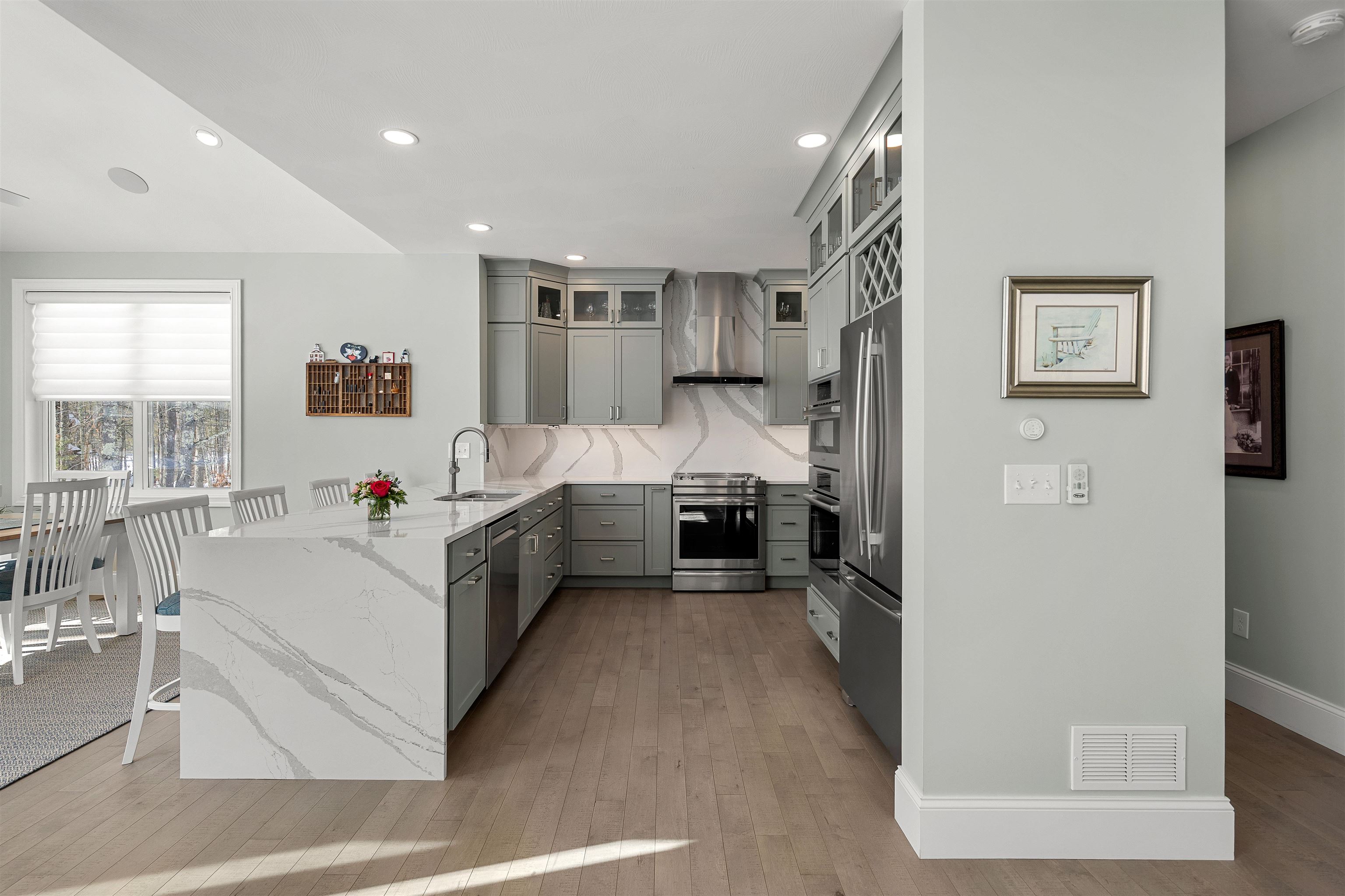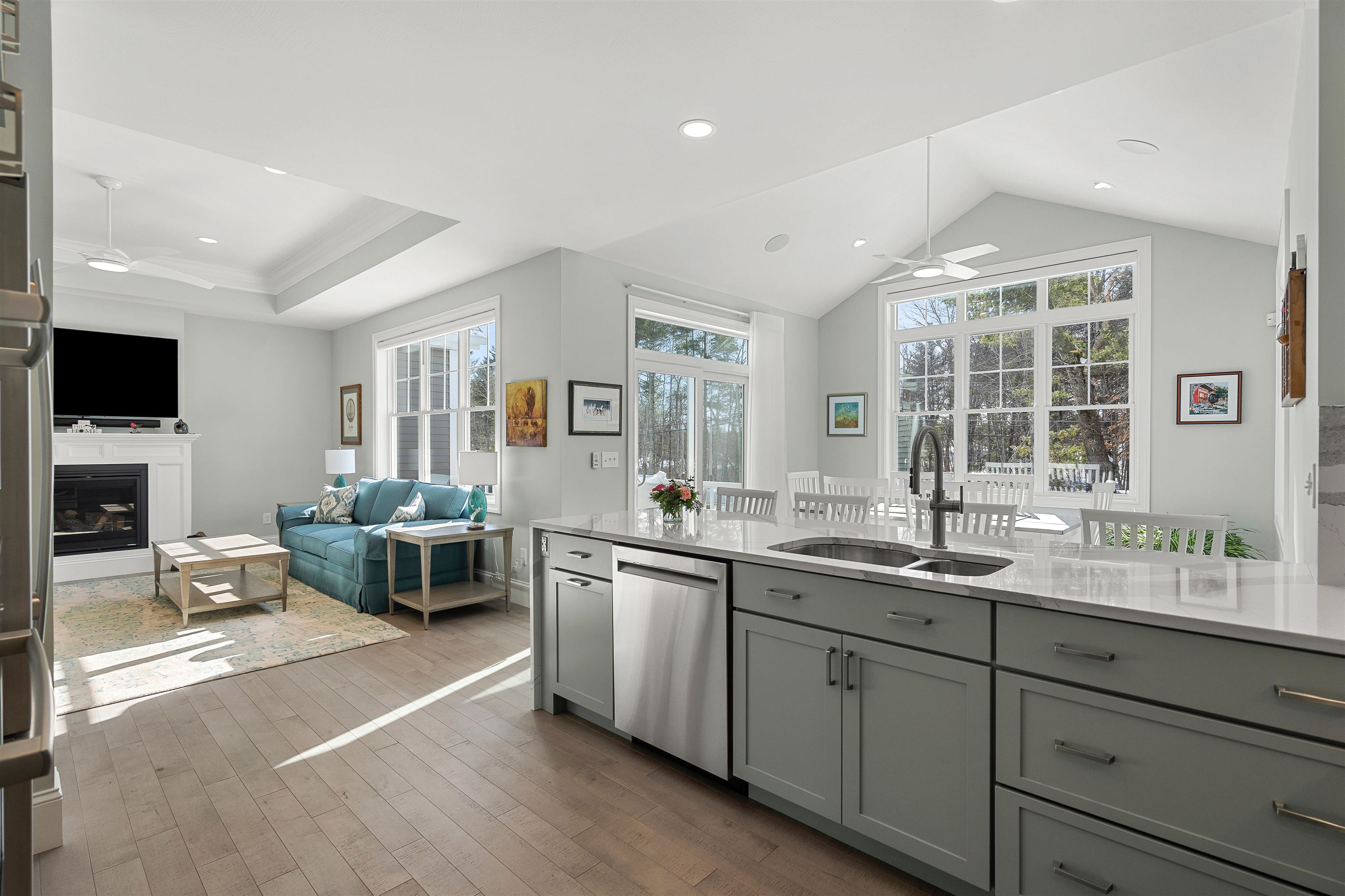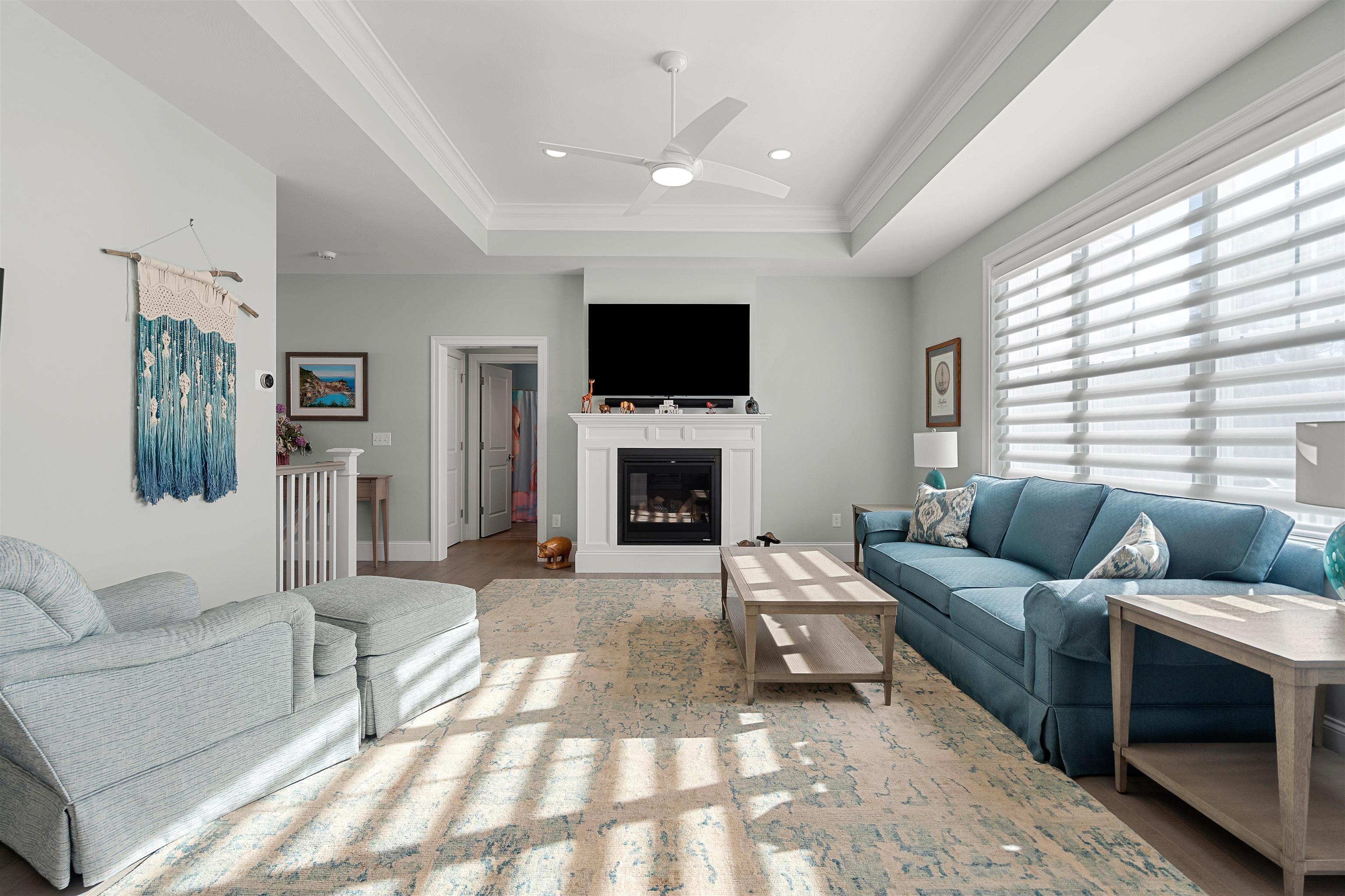 Welcome to this beautifully designed 3-bedroom, 2-bath single-family detached condo built in 2022 in the desirable Terrell Farm Condominium community. Enjoy easy one-level living with an open floor plan, 9' and vaulted ceilings, and expansive, light-filled windows. The dream kitchen features JennAir and Bosch appliances, a Cambria quartz waterfall island and backsplash, high-end cabinetry, a pantry closet, and a sunlit dining area. Just off the foyer is a versatile flex room—ideal as a formal dining room or home office—along with two additional bedrooms well suited for family, guests, or a study. The primary suite offers a vaulted ceiling, custom walk-in closet, and a luxurious bath with radiant heated floors, double vanity, and spa-like Corian shower. Throughout the home are solid stained oak floors, motorized Hunter Douglas Pirouette shades, central vacuum, custom closets, and integrated Sonos speakers. Additional highlights include a cozy gas fireplace, a laundry room with full-wall cabinetry, and an epoxied two-car garage with built-ins. An unfinished, insulated walk-out basement with daylight windows and stubbed plumbing for a future bathroom provides excellent expansion potential. Outdoor living spaces include composite decking on the farmer’s porch and elevated deck, a paver stone front walkway, and a backyard cobblestone patio. Enjoy low-maintenance living with HOA services, city water, access to Nashua’s amenities, nearby walking paths and rail trails, golf, and the charm of neighboring Hollis. This exceptional home combines one-level living, thoughtful upgrades, and flexibility—an opportunity not to be missed.