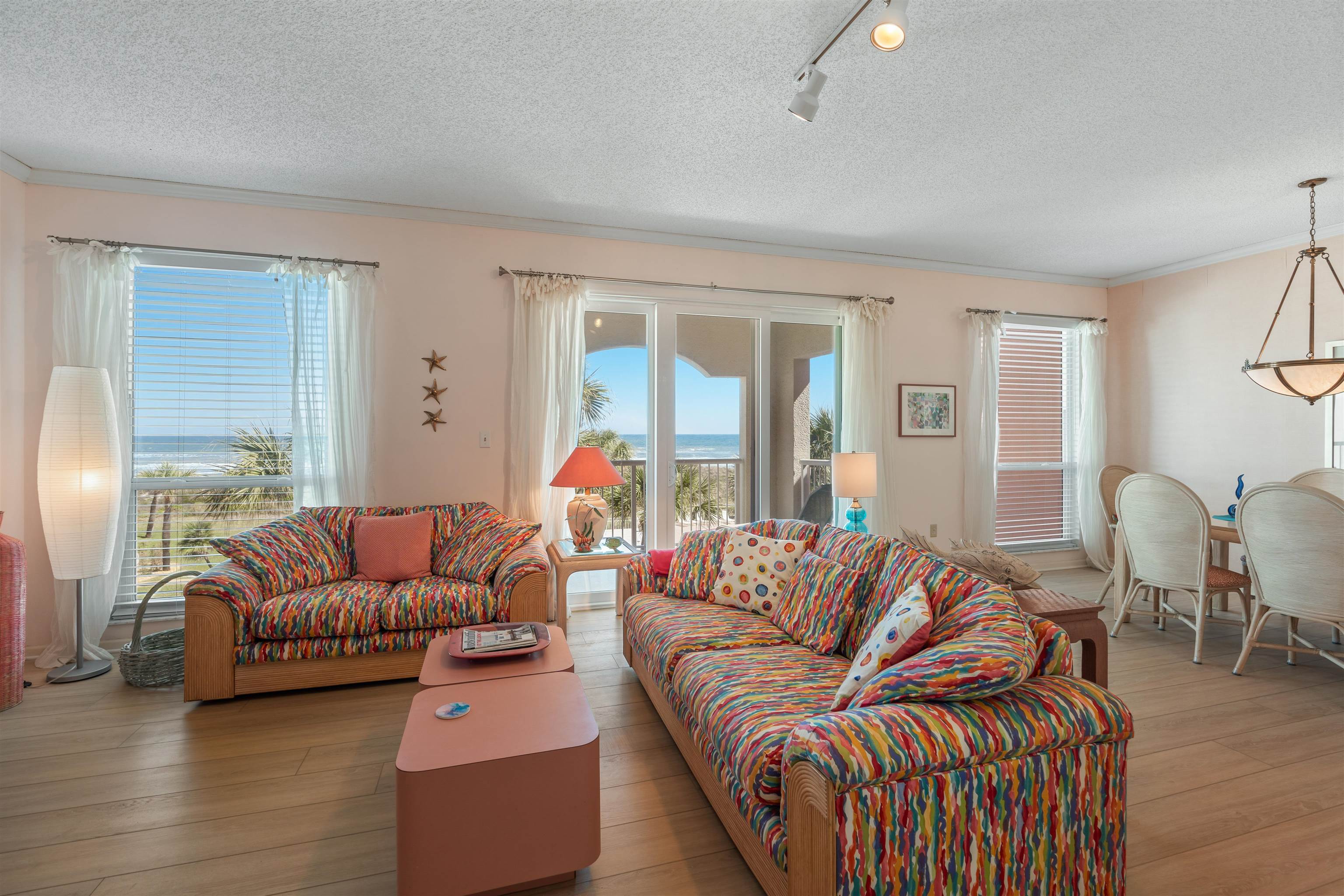 Atlantic East has always been known as one of the Premier Gated Oceanfront Condo developments in St Augustine! Beautifully designed & constructed with attention to detail both in architecture & floorplans. #310 is a Top floor & affords 10ft ceilings only avail on the 3rd floor! It has an expansive 28ft wide living area with a wall of windows on the ocean to take in the spectacular beach & sea views. Open plan, generously sized rooms, split bedrooms, Main BR w/walk in closet & posh main bath with shower, separate spa tub & double vanity. The guest BR is very spacious allowing a sleeping & sitting area. Large kitchen with breakfast bar, pantry, separate dry bar area, Inside full size laundry, crown molding throughout. New Impact doors & windows, lovely terrace overlooking tropical pool & ocean. Dedicated covered parking space for 1 car add'l guest parking. Elevator access, large pool, beach accesses, tennis, clubhouse w/gym, library, personal locked storage unit. Residentially oriented. Pets are allowed for owners 30lb weight restriction. No vacation rentals, 6 month minimum.