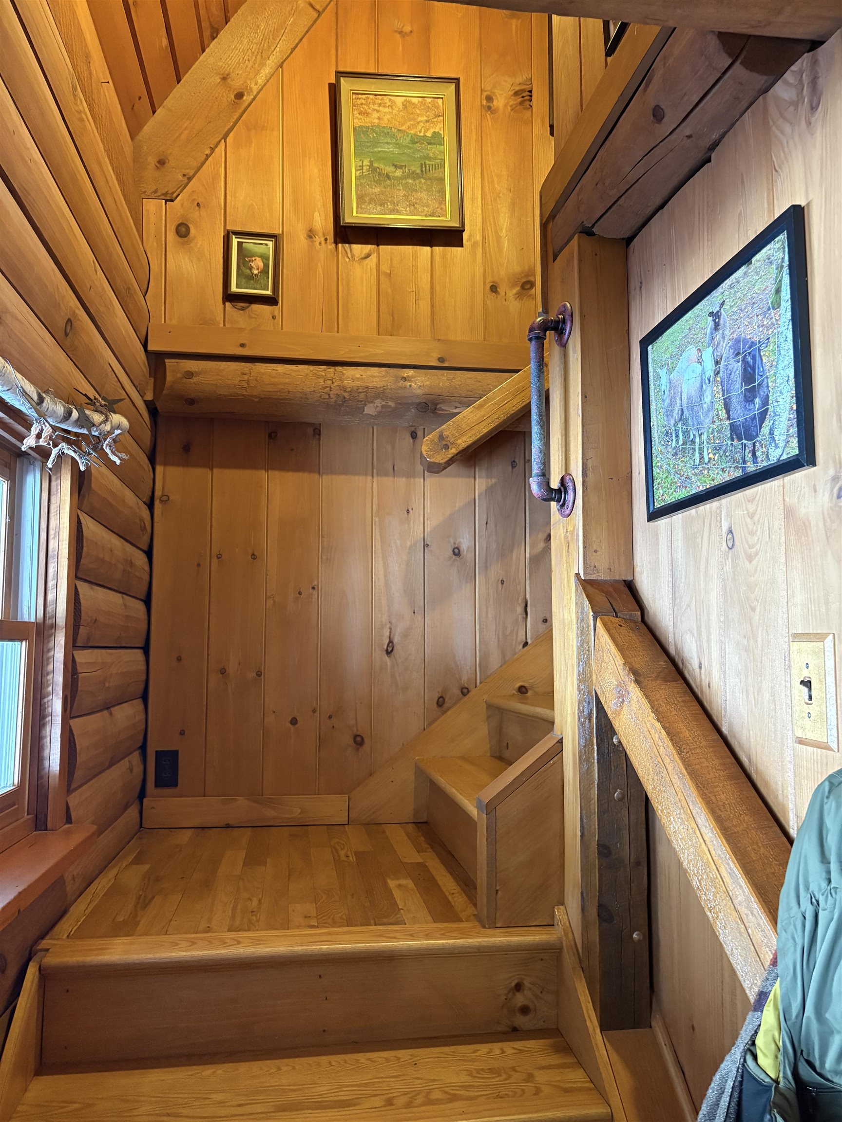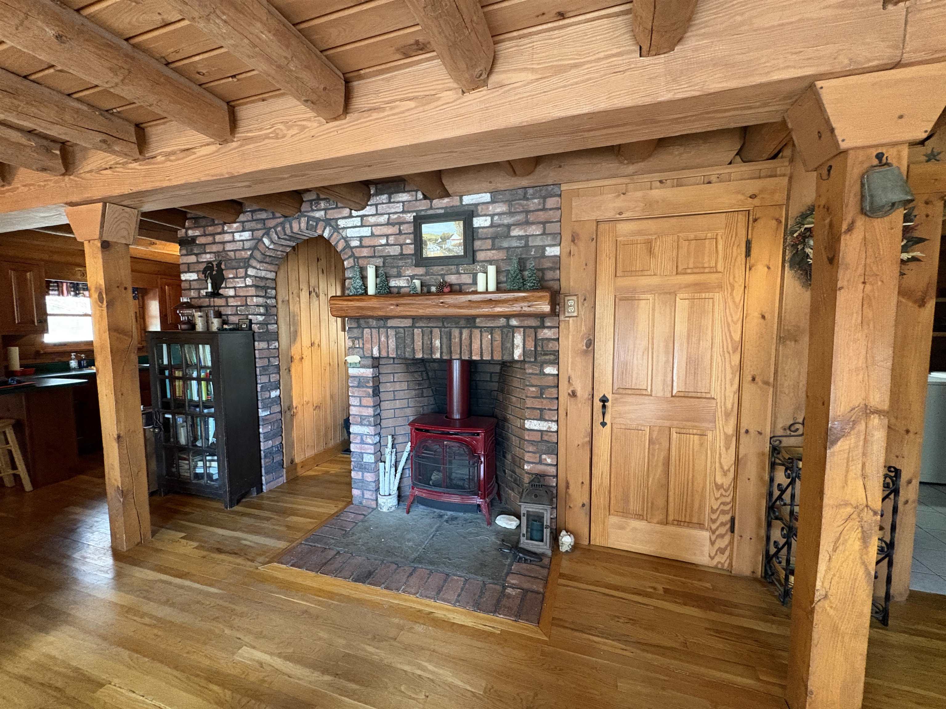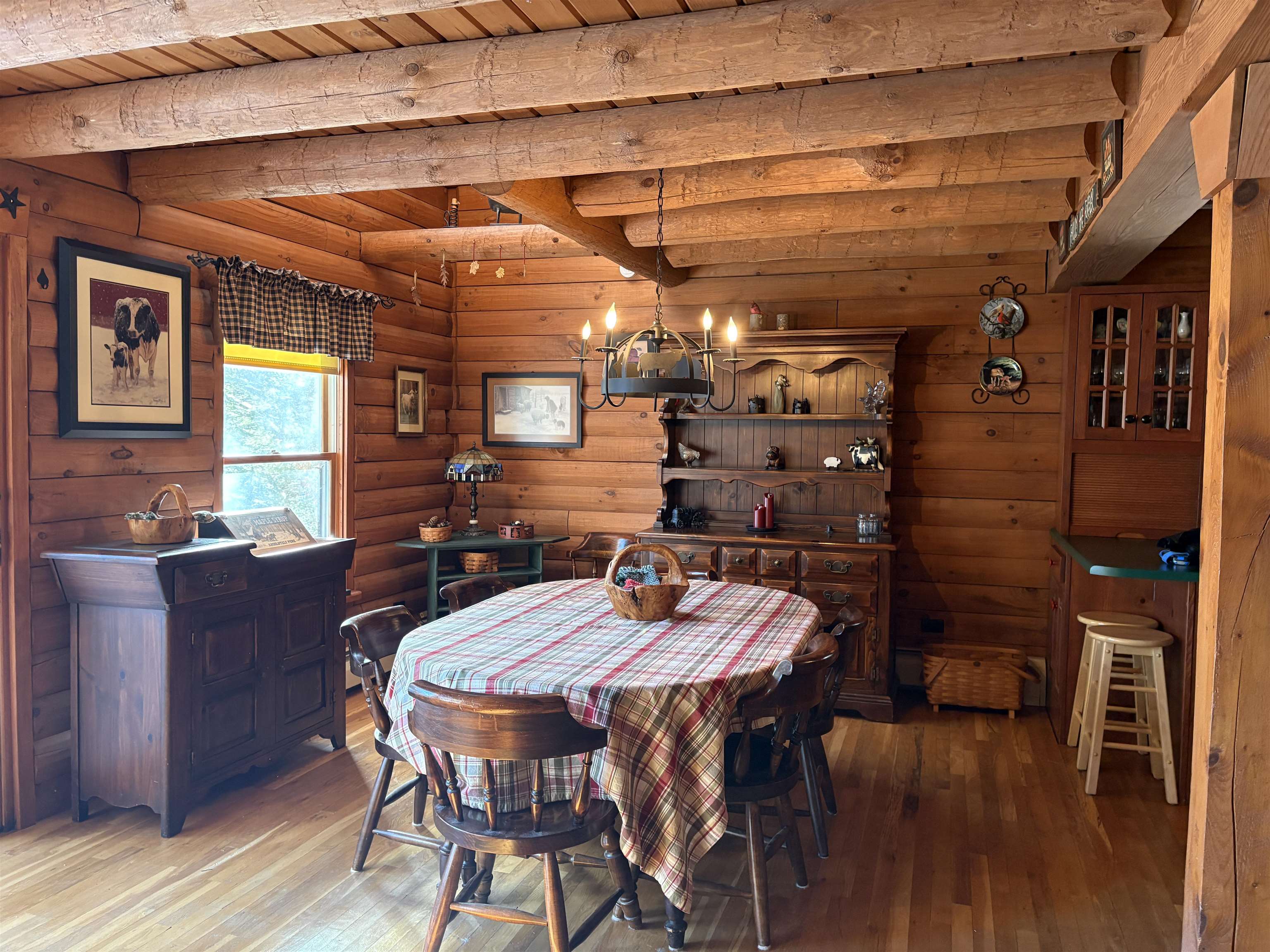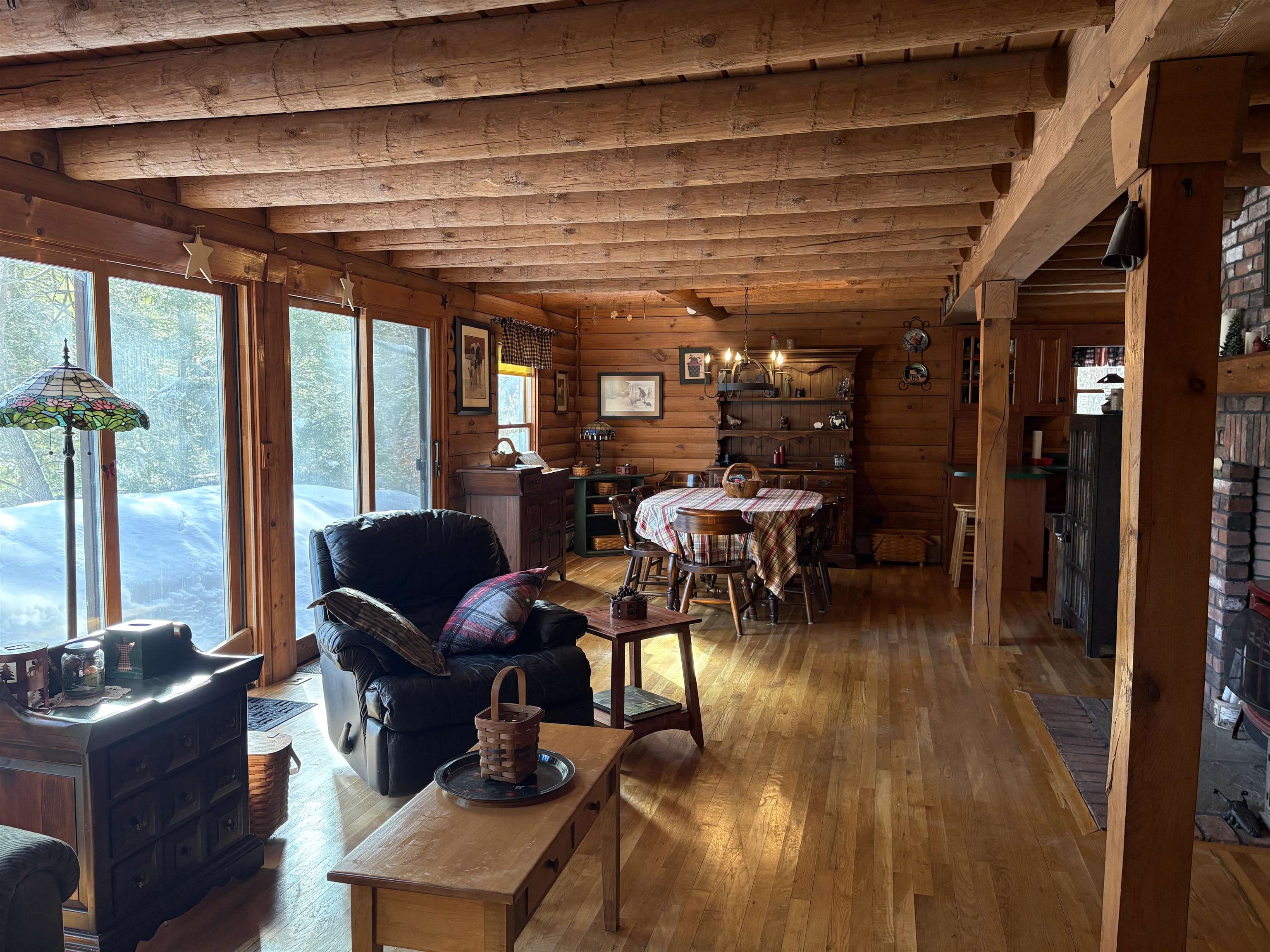 This charming log home sits nestled off the main road, above the nearby Camp Brook, which meanders through the property. This home was thoughtfully built and lovingly cared for by it's current owner. The open living/dining room is light filled by skylights and sliding glass doors that lead to the back deck. Cozy up by the brick fireplace with stove insert. Sit and listen to the babbling brook on the covered front porch or from the balcony off of the primary bedroom. A clawfoot tub, hardwood floors and cherry cabinets are just a few of the lovely features in this home. A full basement offers plenty of storage space, as does the detached two bay garage. Come take a look at everything this delightful log home has to offer!