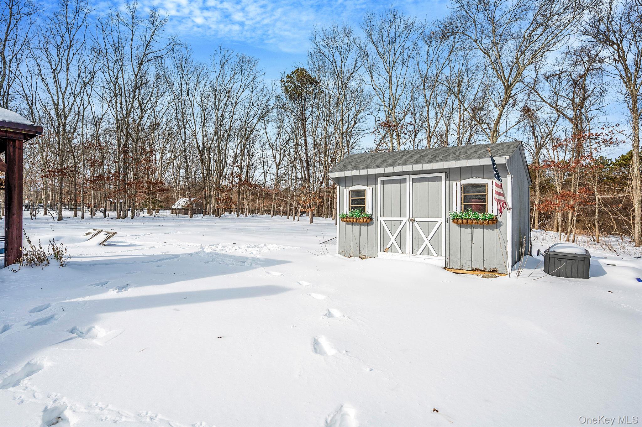 Welcome to 21 Jodi Drive, Manorville, a charming and well-maintained ranch located on a cul de sac in the Eastport-South Manor School District. This inviting home offers a nicely sized living room, a spacious den ideal for relaxing or entertaining, and an eat-in kitchen featuring stainless steel appliances and tasteful updates. The home includes (3) generously sized bedrooms and (1) full bath with a detached garage, providing comfortable living space with ample storage throughout. Additional highlights include central air, newer siding, and excellent overall condition. The serene, blank canvas of a lot, features a newer patio and shed, creating a wonderful setting to unwind and enjoy the outdoors. Do not miss this amazing opportunity to own in a great location with LOW Taxes!