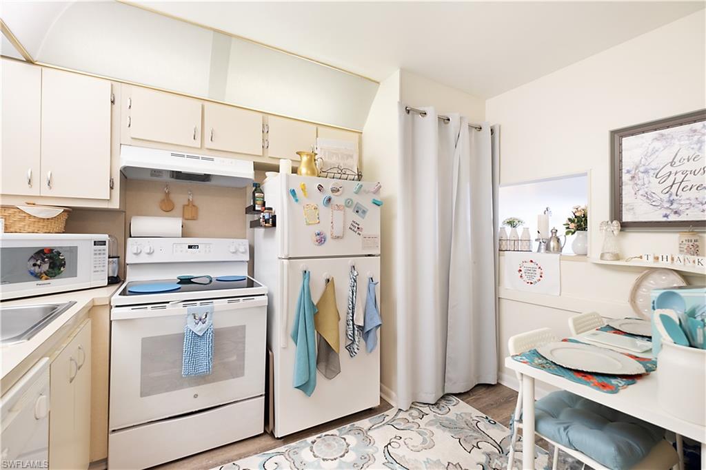 Resort living at its finest in the highly desirable Fairways community, a vibrant 55 plus community perfectly positioned off Collier Boulevard in East Naples with convenient access to everything Southwest Florida has to offer. This beautiful spacious 1 bedroom 1 bath condo is located on the top floor of a 4 story building so no one above you and features spectacular views of the newly installed 9 hole public golf course from your screened-in, covered lanai where you can watch stunning Naples sunsets and enjoy the peaceful Florida lifestyle. This building is the only one in the complex with elevator access while all the 2 story units require walking up stairs for access. The kitchen is adorable with white appliances and neutral cabinetry plus a convenient pass-through to the dining area that makes entertaining effortless. Gorgeous luxury vinyl flooring flows throughout the main living areas while the spacious bedroom showcases beautiful golf course views, plush neutral carpet, and a deep walk-in closet providing ample storage. The bath features tile flooring, white cabinetry, cultured marble countertops, and shower. The generous living great room features pocket sliders opening to the large lanai with stunning golf course views creating the perfect indoor-outdoor living space. Additional features include a stackable washer and dryer for convenience, impact glass, customized hurricane rated electric screens for peace of mind, extra storage in the hallway, and a retractable screen door to take advantage of wonderful warm Florida breezes. Mailboxes and elevator are conveniently located for easy access to your floor. All of the exceptional amenities are walking distance from the condo and include ample guest parking, clubhouse with social activities, sparkling pool, bocce court, covered dining area, bike racks, grill and picnic area, tennis court, pickleball court, and outdoor patio area all surrounded by a park-like setting near the lake with fountain features creating a serene retreat. This East Naples location puts you minutes from Publix and Walmart on Collier Boulevard, Collier Plaza with its array of restaurants and services, Naples Coastal Shoppes for upscale shopping, and easy access to Interstate 75 for quick trips throughout Southwest Florida. Downtown Naples with its world famous Fifth Avenue South shopping, dining and entertainment is just a short drive away, along with pristine Gulf beaches including Naples Pier and Vanderbilt Beach where you can enjoy spectacular sunsets over the Gulf of Mexico. Southwest Florida International Airport is approximately 30 minutes away making travel convenient. The location also provides access to beautiful regional parks including Sugden Regional Park with its 60 acre Lake Avalon, North Collier Regional Park with extensive sports facilities and walking trails, and the natural beauty of nearby preserve lands perfect for outdoor recreation. This unit has extra storage room 3'3" X 2'7" x 8' high.