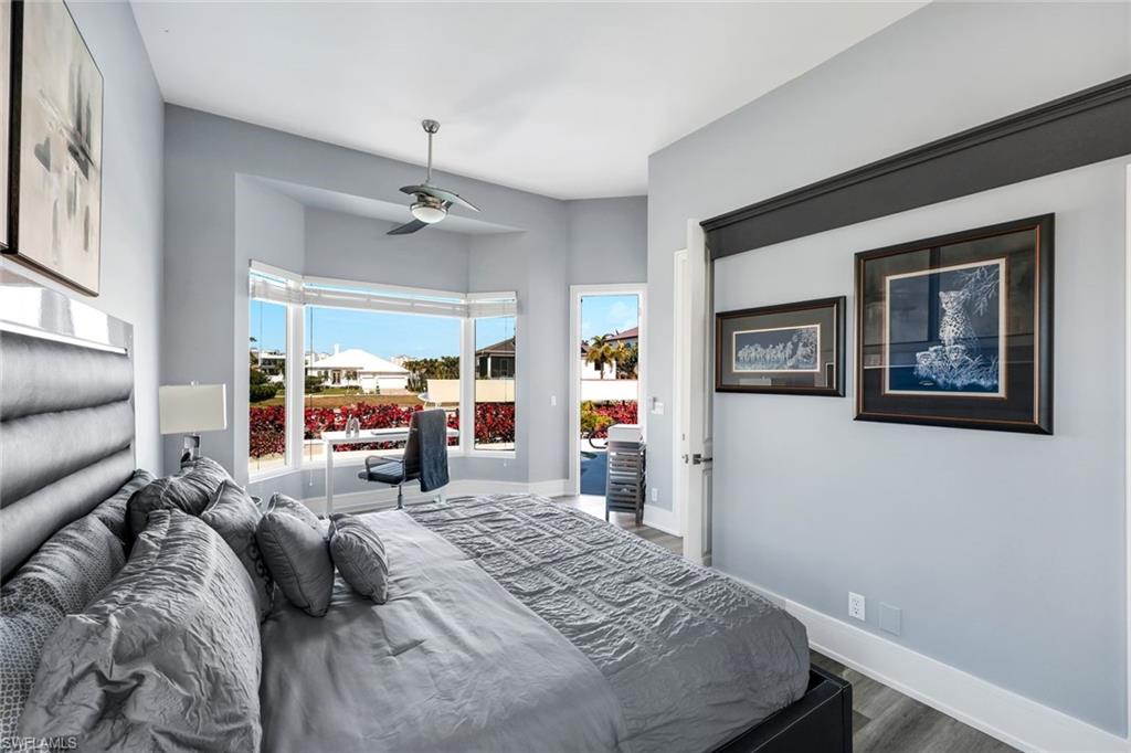 This impeccably maintained residence is equipped with hurricane impact windows and doors, plantation shutters, ample LED recessed lighting, and two A/C zones. The home features exquisite wood, stone, and tile flooring, creating a harmonious flow of elegance throughout.