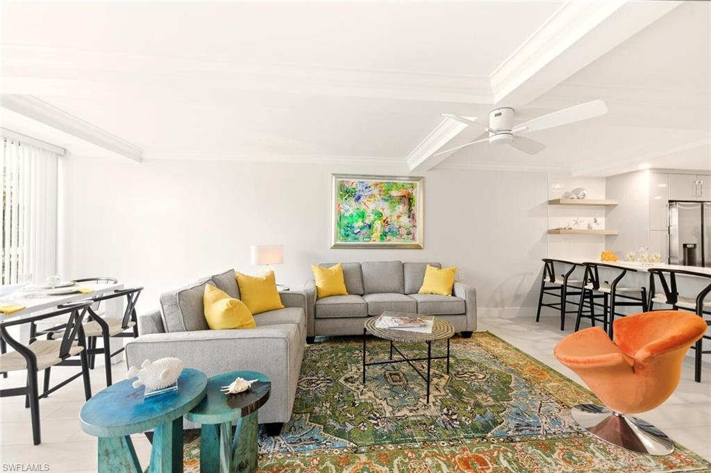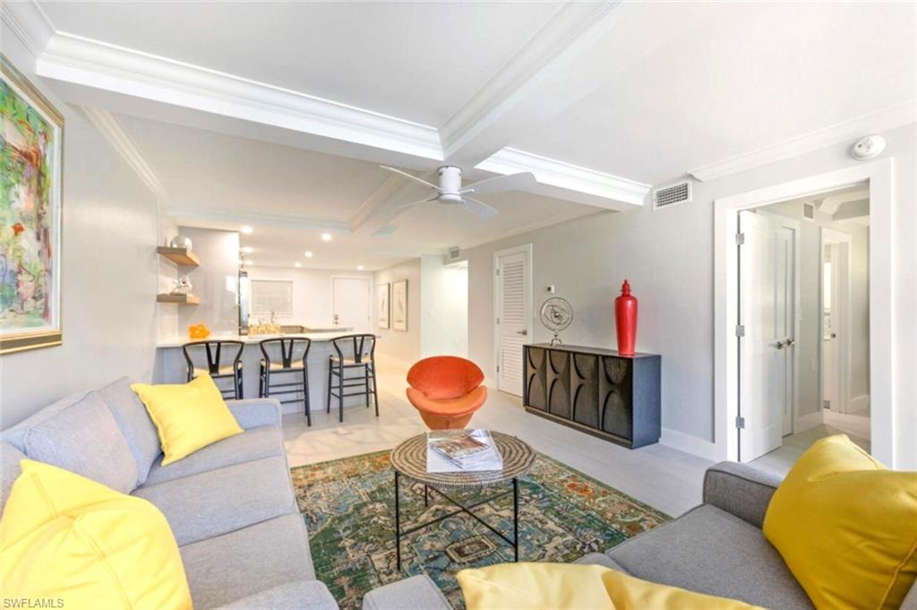 Exqisite condo in the heart of Olde Naples, delivering an unmatched walkable lifestyle just steps from Fifth Avenue South, Third Street South, Tin City, Cambier Park, and Naples’ famous white-sand beaches—where glowing sunsets over the Gulf become part of your daily routine. This fully renovated, professionally furnished 2-bedroom, 2-bath residence has been completely reimagined down to the concrete, offering the look, feel, and peace of mind of new construction. The interior features a thoughtfully curated designer aesthetic with high-end finishes throughout. The open kitchen is both beautiful and functional, showcasing custom soft-close cabinetry, quartz countertops, smart appliances, a pantry, and a Veego wine refrigerator. Impact windows and doors, new lighting, fans, fixtures, and elevated ceiling treatments complete the transformation. Spa-inspired bathrooms highlight refined tile selections and custom cabinetry, while every detail of the home reflects a light, coastal, and upscale feel that is both inviting and refined. Offered professionally furnished and decorator designed, this residence is truly move-in ready. Enjoy peaceful views just steps from the community pool, courtyard, and gas grilling area—perfect for relaxed afternoons and effortless entertaining. Additional conveniences include assigned parking, ample guest parking, a building elevator, and a ground-floor community laundry facility. Well-suited as a primary residence, seasonal getaway, or income-producing opportunity, this condo offers one of Old Naples’ most flexible rental policies with 30-day minimum rentals up to 12 times per year, no age restrictions, and a highly accommodating pet policy. Renovated with longevity in mind, this home delivers lasting value and peace of mind. No car required—walk to dining, shopping, the beach, and everything you love about downtown Naples.