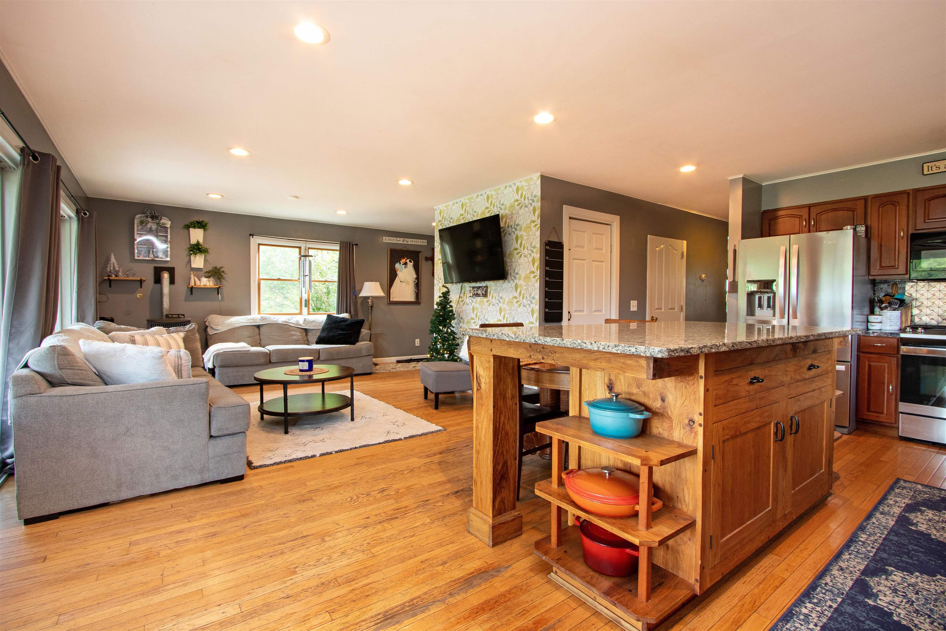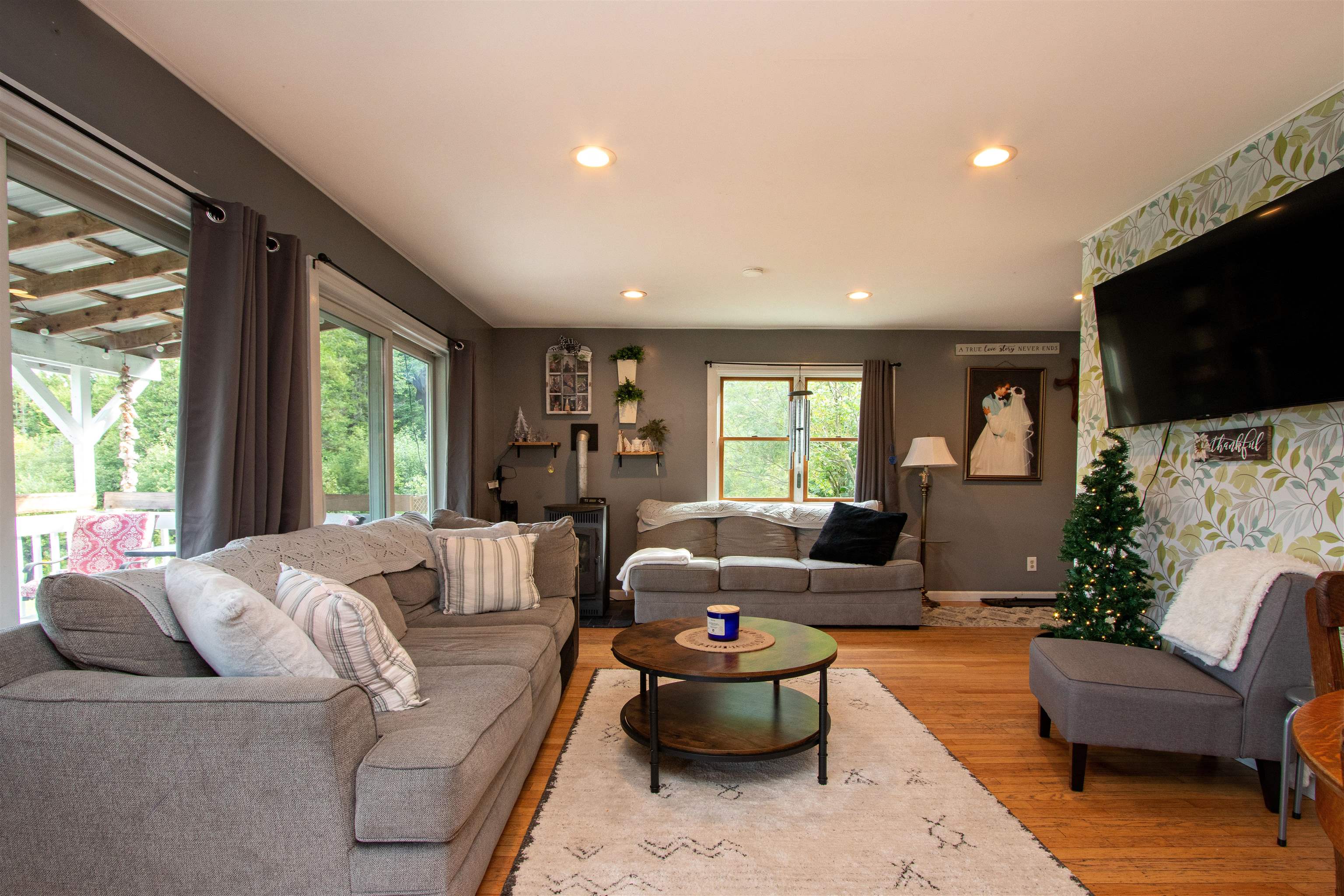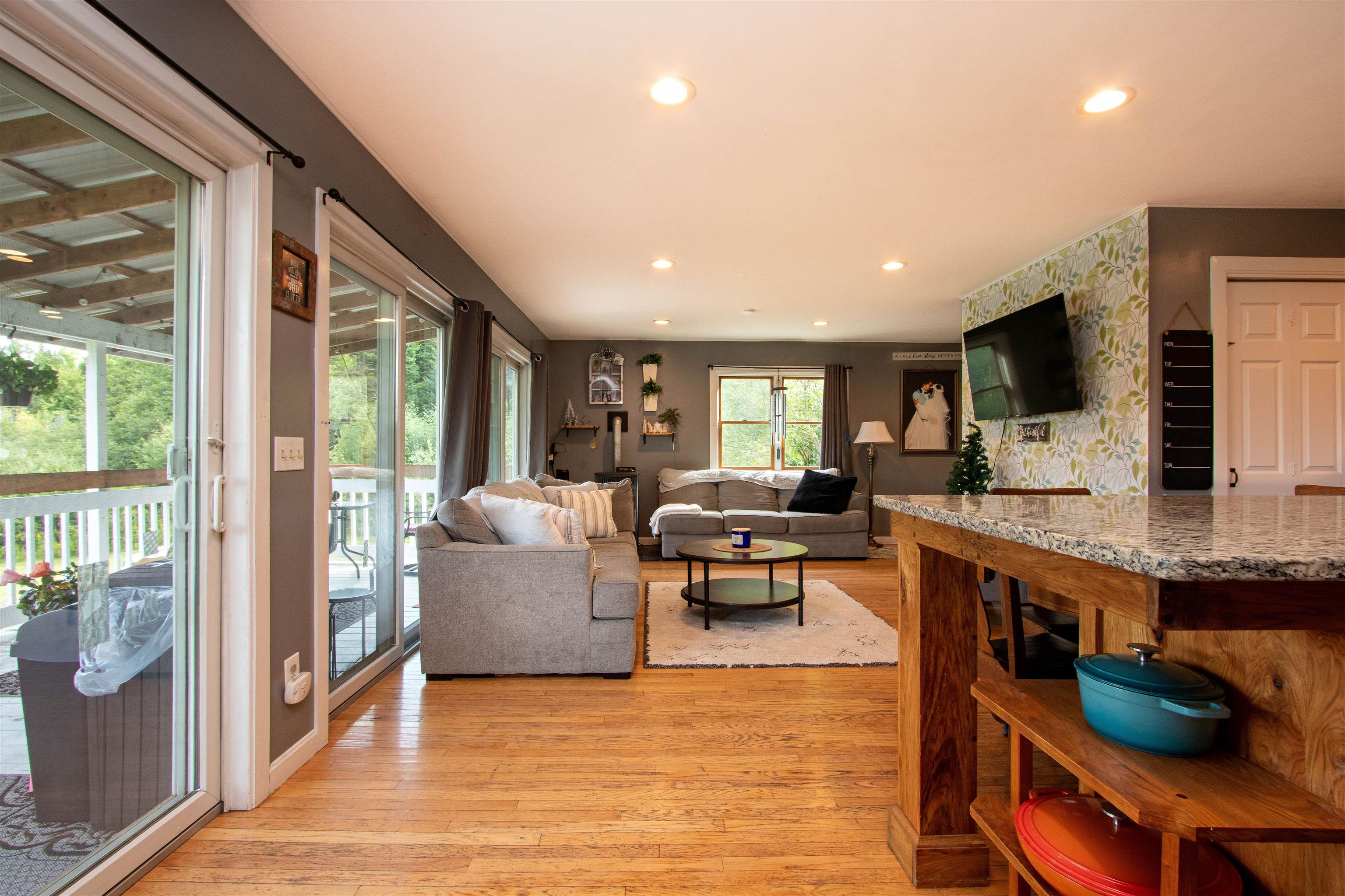 Set back from the road on 10+/- acres, this Hardwick home offers a bright and inviting open layout where the living room, dining area, and kitchen flow seamlessly together across hardwood floors. The kitchen features ample cabinet and counter space, a center island, and a walk-in pantry, while the living room is warmed by a pellet stove in the corner. Three sets of sliding glass doors connect this main living space to a covered porch overlooking the yard and private pond perfect for soaking up the light and embracing indoor-outdoor living. The main level also includes a family room, a bonus room ideal for a home office, and a full bath. Upstairs, you’ll find a convenient central laundry area, three bedrooms, and a full bath. The finished walkout lower level adds even more living space with a family room, a guest area, and a half bath. Outside, the land offers both open and wooded areas, plenty of room for gardens, a lean-to, and a shed. Living here means more than just enjoying your private retreat. Hardwick has earned a reputation as a hub for Vermont’s local food and farm-to-table movement, with nearby farms, cheesemakers, and markets adding to the community’s vibrant culture. The historic village center offers cafés and small shops along the Lamoille River, while the Lamoille Valley Rail Trail, beloved for walking, biking, and snowmobiling, runs right through town. It’s a place where outdoor recreation, community connection, and Vermont charm all come together.