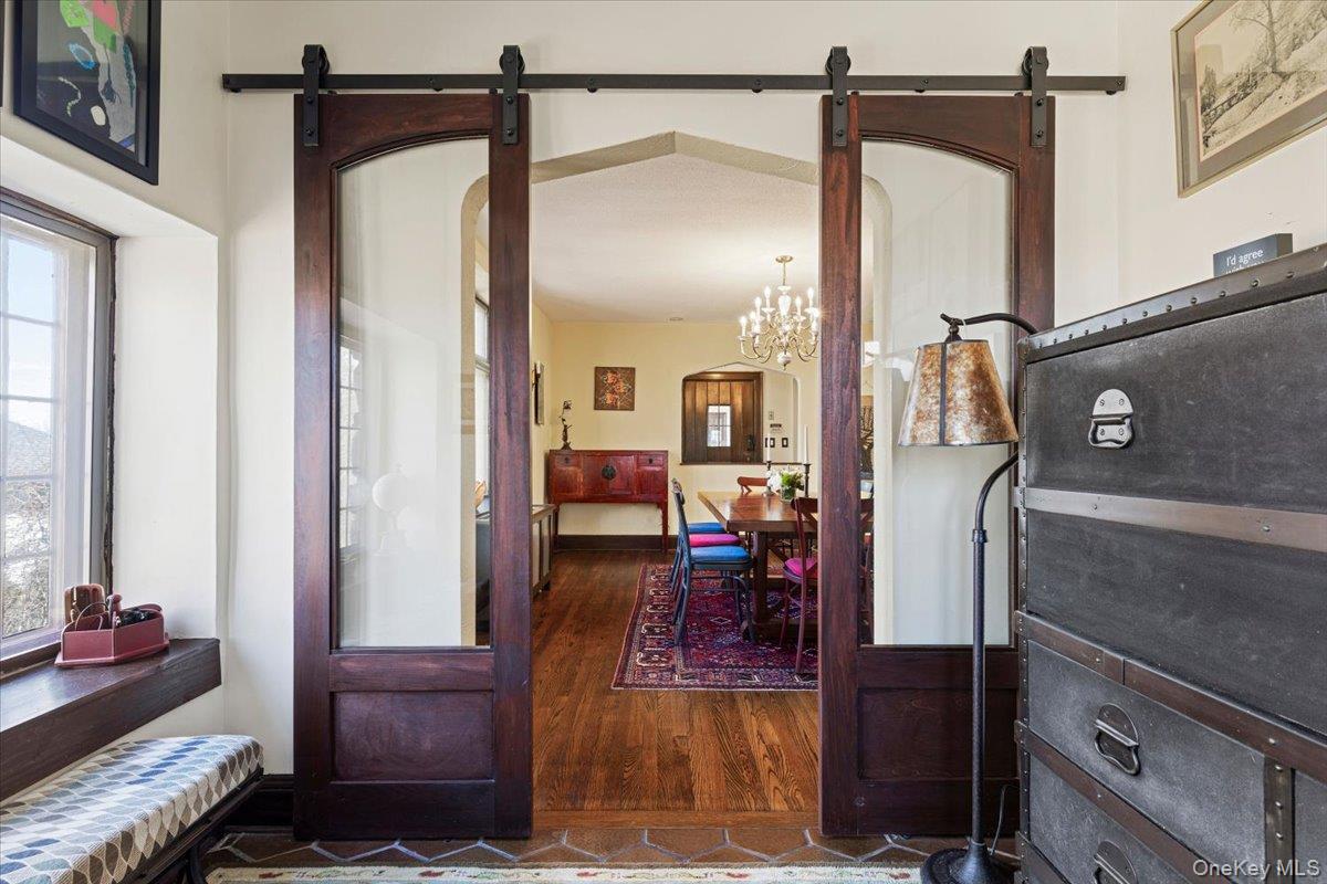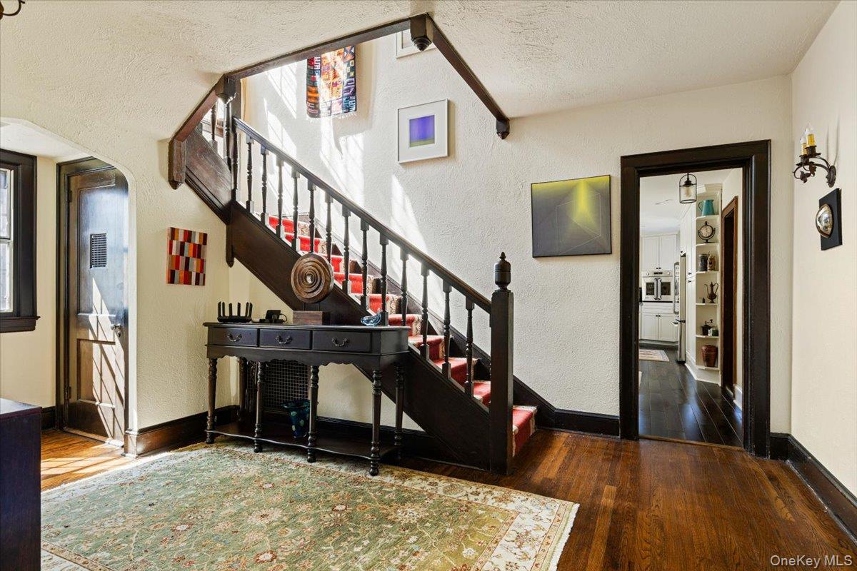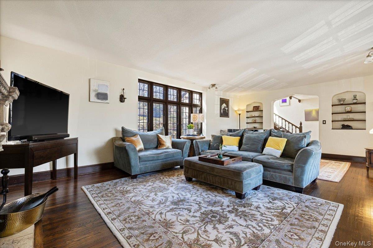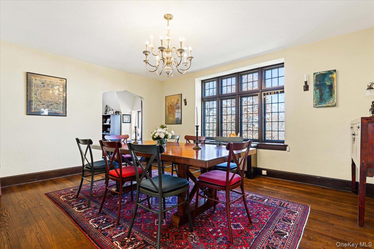 Grand 1925 Tudor showcasing timeless architectural elegance with a gracefully graduated slate roof, a striking blend of stone and brick, and subtle wooden accents. Nestled on half an acre in the highly sought-after Edgemont School District, this home is within walking distance to the Jr. /Sr. High School, Scarsdale Golf Club, Hartsdale train station, and a vibrant array of dining options. Step inside to experience the home’s historic charm, enhanced by an abundance of leaded and stained glass windows that bathe the interiors in natural light, complemented by gleaming hardwood floors throughout. The airy living room features a hand-carved stone fireplace mantel, while the grand foyer boasts a bespoke oak staircase. The renovated eat-in kitchen is both stylish and functional, paired with a formal dining room and an inspirational sunroom, currently used as an office. Ascending the staircase, crowned by a breathtaking floor-to-ceiling stained glass window, you’ll find a spacious primary suite complete with a full bathroom and dressing room, along with three additional bedrooms and a hallway bathroom. The basement offers a versatile recreational space ideal for a gym, laundry room, and convenient access to the large attached 2-car garage. This home is a true masterpiece, blending classic grandeur with modern comforts in an unbeatable location!