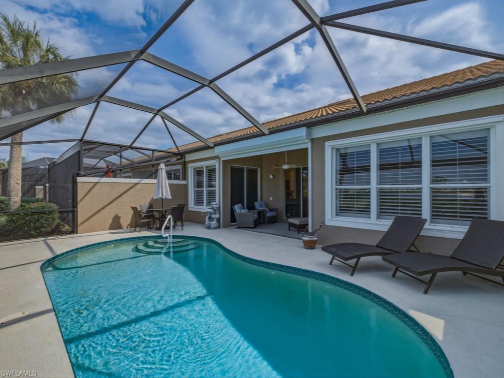 Rarely available Sabal Cove attached villa with the best views in Spring Run with a picture frame lanai overlooking the first hole and lake while you relax by your private pool. Spring Run is a bundled golf community with an 18 hole championship course that is meticulously maintained. This is a three bedroom two bath villa with a two car garage with your own private pool. This is a very active community with not only a championship golf course but also clubhouse dining, bocce, pickleball, tennis, resort style pool, fitness center and more. Optional membership in The Commons Club with private beach club and health and lifestyle center. This unit has had many recent upgrades including newer air conditioner and water heater and is conveniently located within walking distance to urgent care doctors offices and Coconut Point Mall and just a short drive to the airport. Also on the hospital electric grid so it never loses power and has never had any flooding. Come see why this community always gets rave reviews.