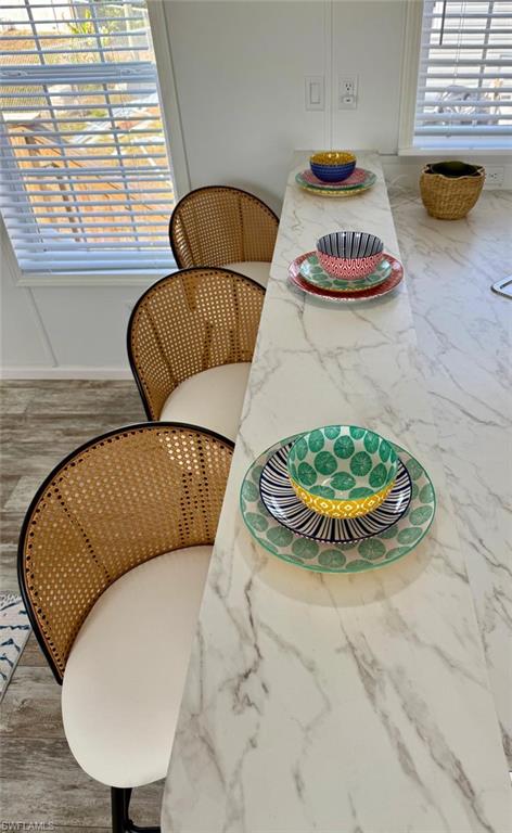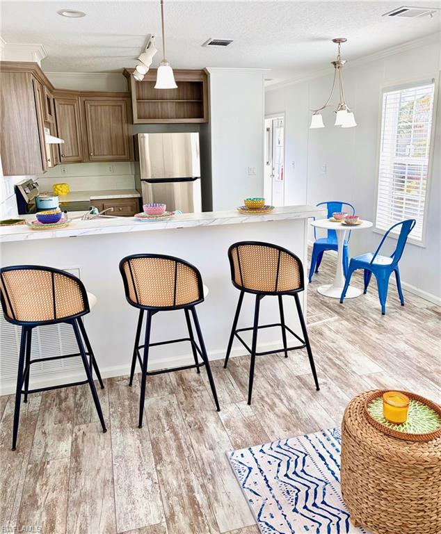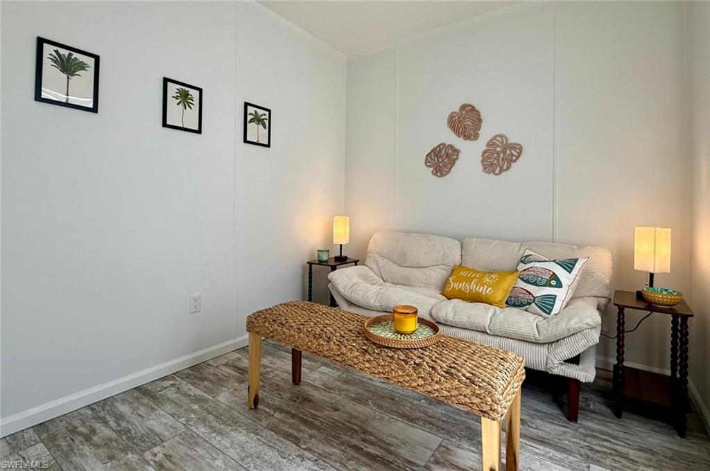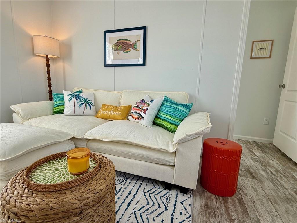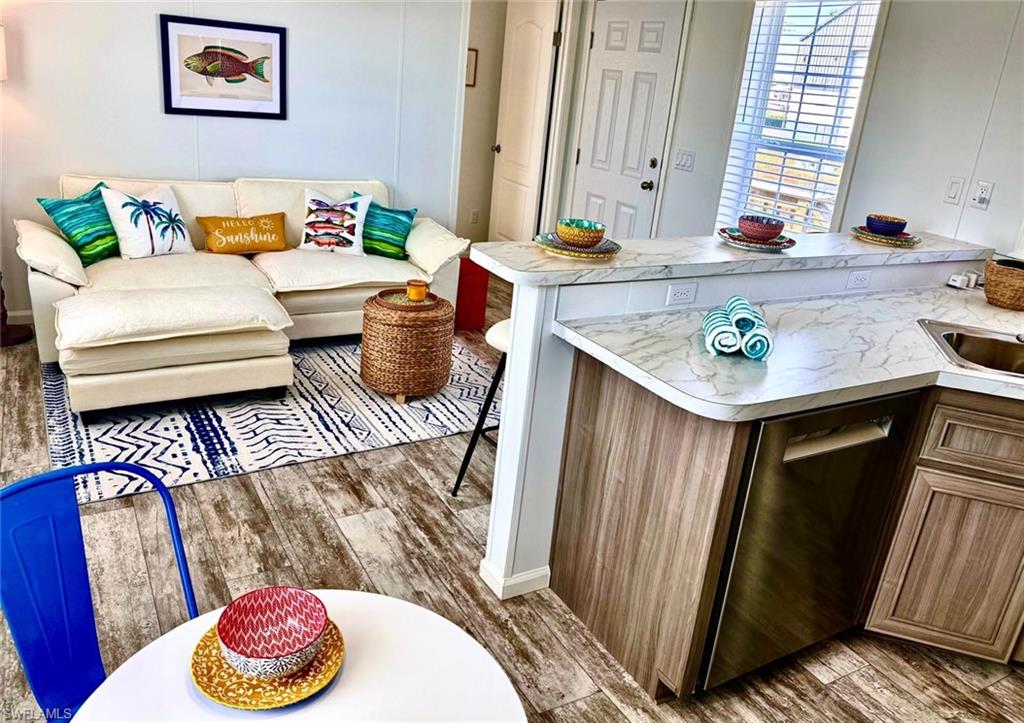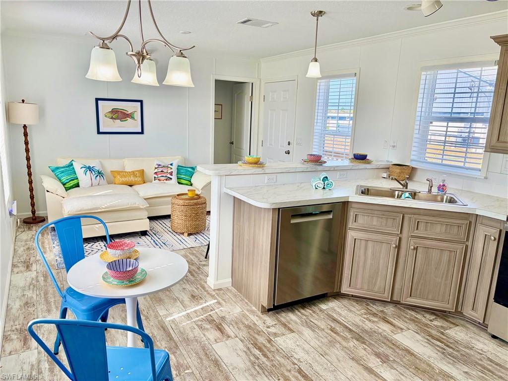 A beautiful charming little bungalow - the perfect spot for seasonal trips to Fort Myers! Enchanting, light and bright NEW elevated 2/1 cottage with an eat-in kitchen and breakfast bar. 2. 5 miles from Fort Myers Beach in Thunderbird Park, a friendly active 55+ community where you own your own land. This 2025 manufactured Jacobson home is furnished and designed with all new furniture and décor, full of bright colors and comfort in mind. Smile every time you walk in the door of your sweet affordable cottage cooled by new HVAC. New Bosch dishwasher + LG refrigerator + GE range + Whirlpool washer/dryer. This delightful home is elevated 5’ for safety from potential flooding with only 7 stairs, 2 entrances for each side of the home. Comes with 24/7 ZEVO pest systems inside. Bedrooms are at opposite ends of the house for privacy. Affordable high-quality living with low taxes plus low monthly HOA of $100 includes strong sense of community, nice neighbors, and pride of ownership (341 homes) with pool, party pavilion, horseshoes, shuffleboard, bocce ball court, clubs, monthly events for meals and games. Close to the beach, local shops, restaurants, bars, golf, parks, and healthcare. Call today for an appointment!