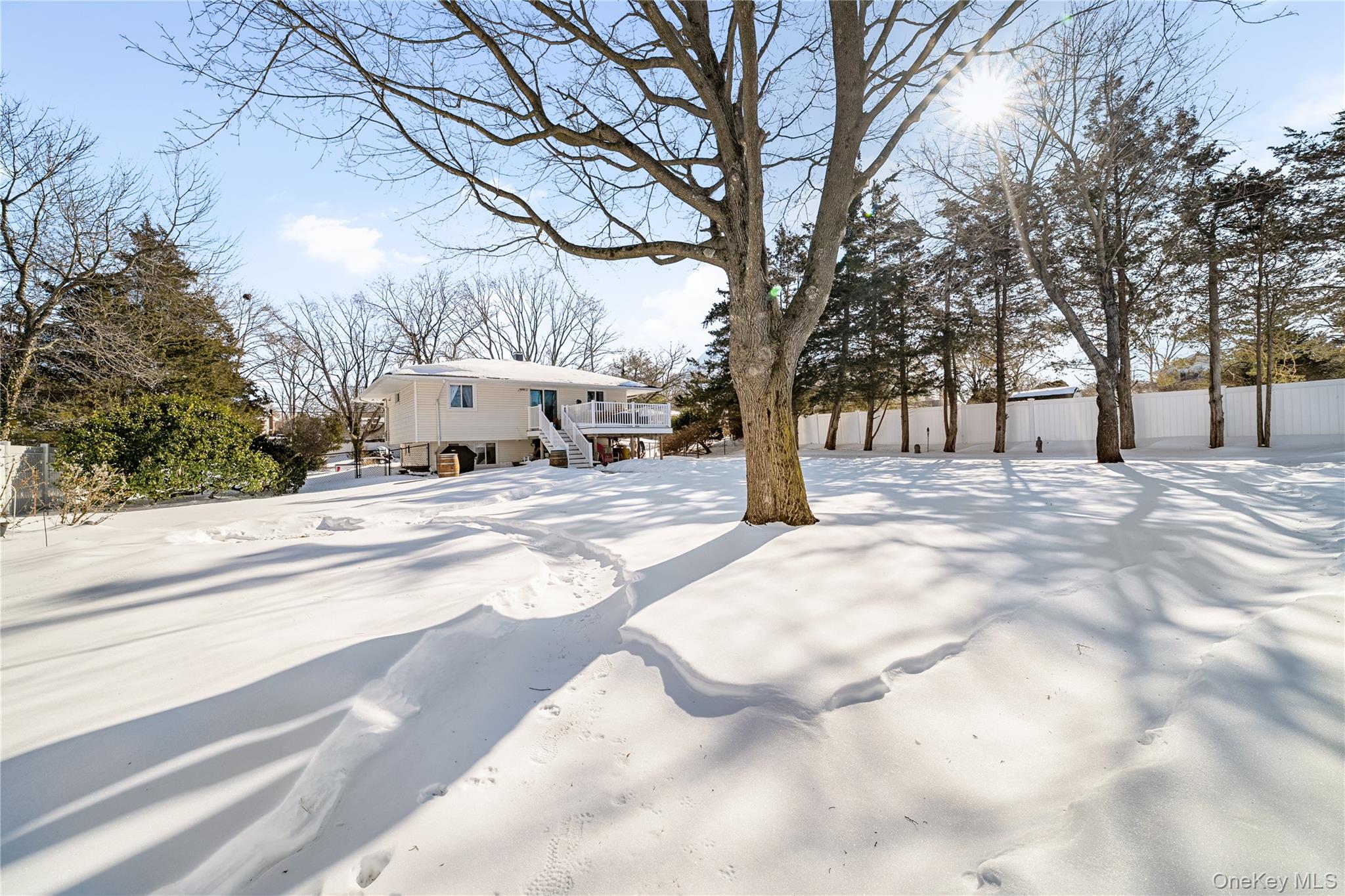 Experience North Shore living in this impeccably maintained 3-bedroom, 2-bath High Ranch located in the heart of East Setauket. The upper level features a huge, sun-filled living room with abundant natural light, creating an inviting and spacious atmosphere. Recent capital improvements include a brand-new roof, upgraded 200-amp electrical service, and a high-efficiency hot water heater (2024–2025), offering true peace of mind. The first floor offers a huge, light-filled living area with exceptional natural light, newly refreshed in 2024 with modern flooring and a full bath, providing excellent potential for legal rental income or extended living with proper permits. Outdoor living shines with a sprawling brick-paver patio and expansive upper deck, fully enclosed by a brand-new privacy fence (2025). Additional highlights include a durable pre-cast concrete cesspool system. Average monthly utilities: Gas $171, Electric $159, Water $50–$70 (seasonal, sprinkler use). A rare, turnkey opportunity in the prestigious Three Village area