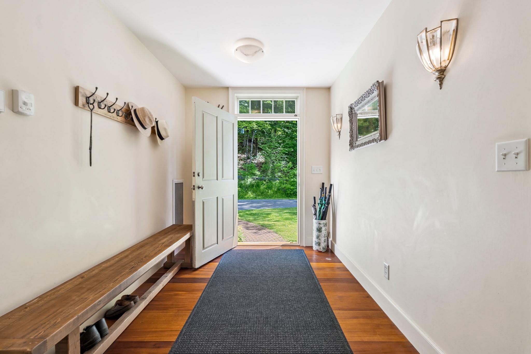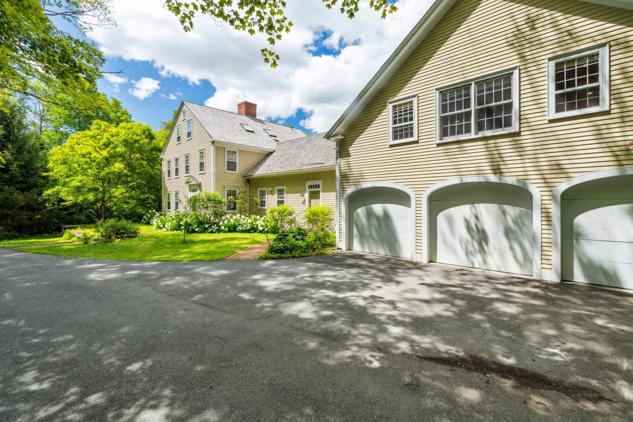 16 OLCOTT ROAD- Elegant, spacious, and immaculate reproduction colonial constructed by premier builder Douglas Gest in an idyllic location minutes to Norwich Village yet privately set with lovely westerly views. This gorgeous home is well-appointed, bright, and has fine finish work at every turn. The main level flows effortlessly from a spacious kitchen and pantry to open concept dining and family room areas and a grand granite patio with persistent views. Also on this level is a library in the southeast corner and a private office space that could provide the option for a future ground floor primary suite. The main second floor has three well-sized bedrooms while the primary suite features a large ensuite bathroom oriented to the west. Additionally, there is a spacious guest bedroom suite and a gym over the garage. On the third level is a bedroom with a full bath, and a bonus room. The land component consists of 7. 5 acres with a large open field, mixed woods, and a perfect spot for an additional barn if desired on the northern side of the grounds. This highly desirable location and well-maintained home provide easy access to Hanover, Dartmouth College, Dartmouth Health, local schools, and abundant local trail access.
