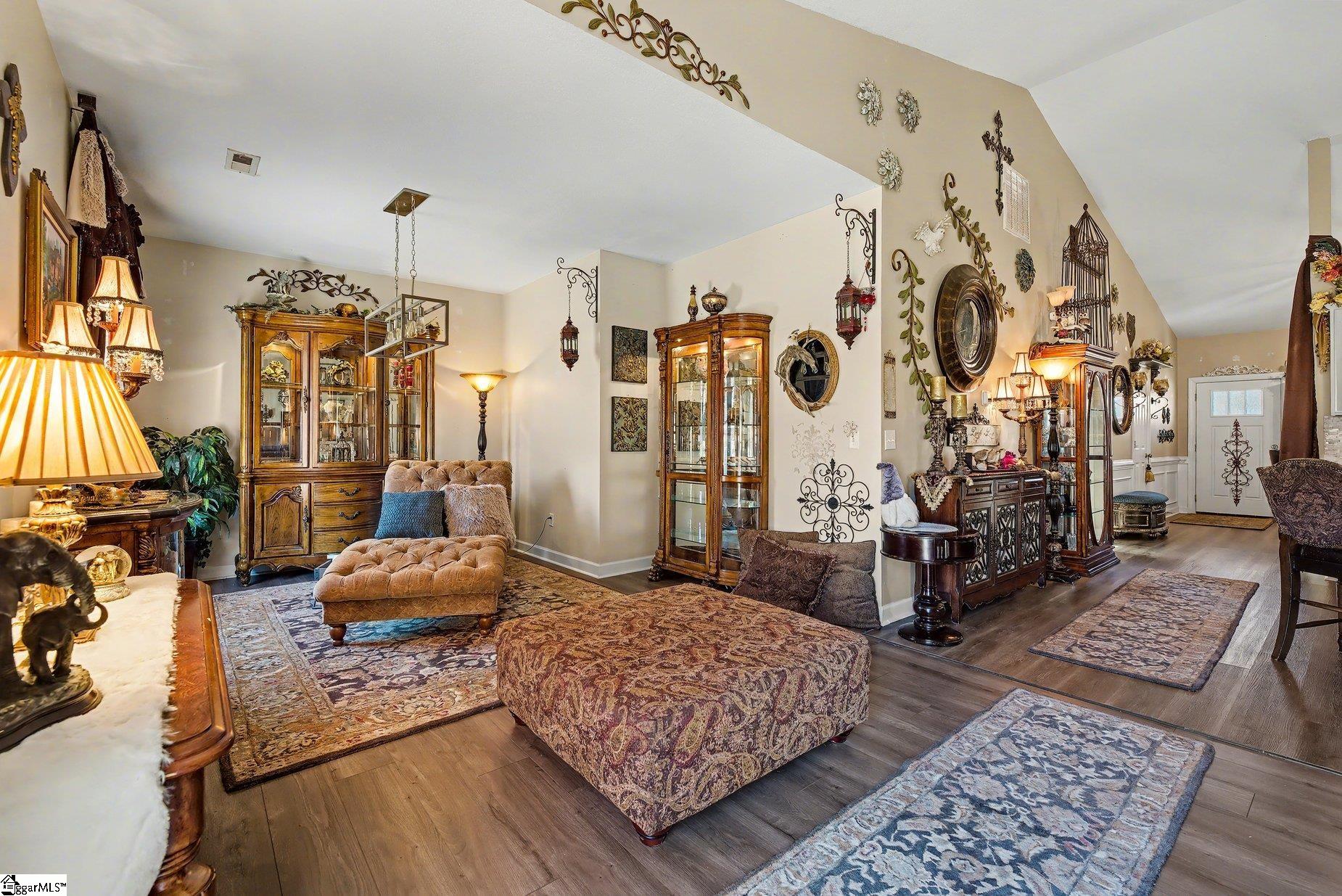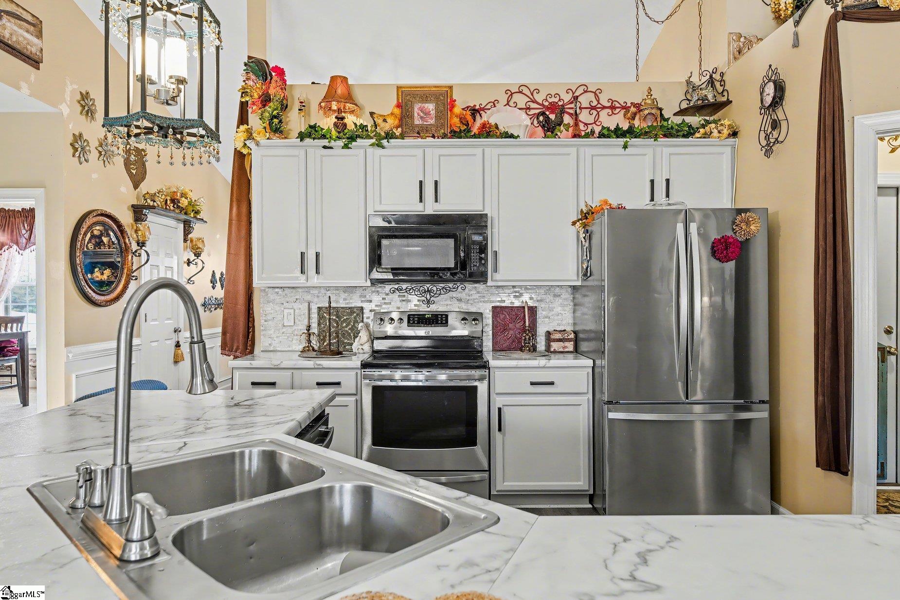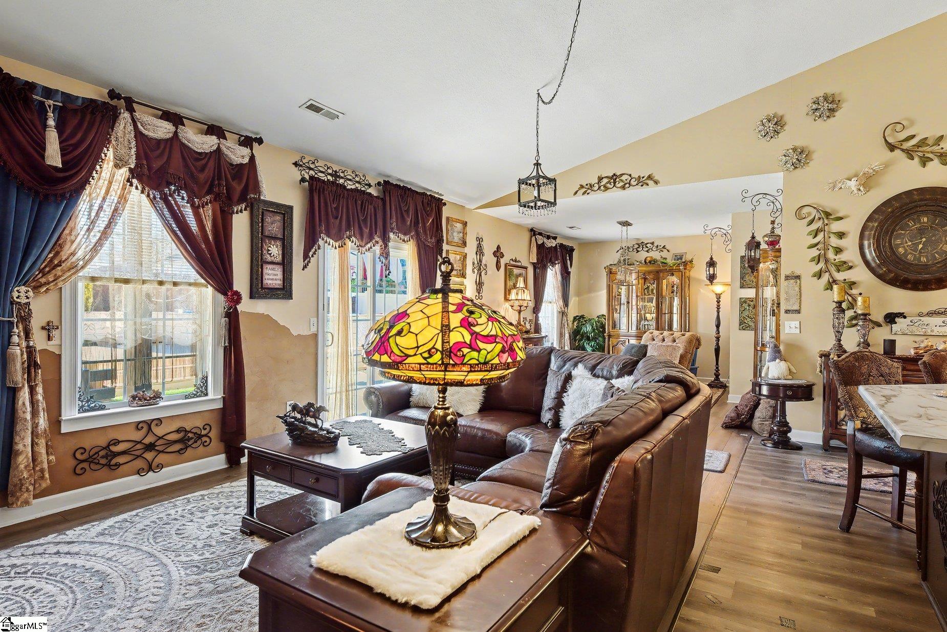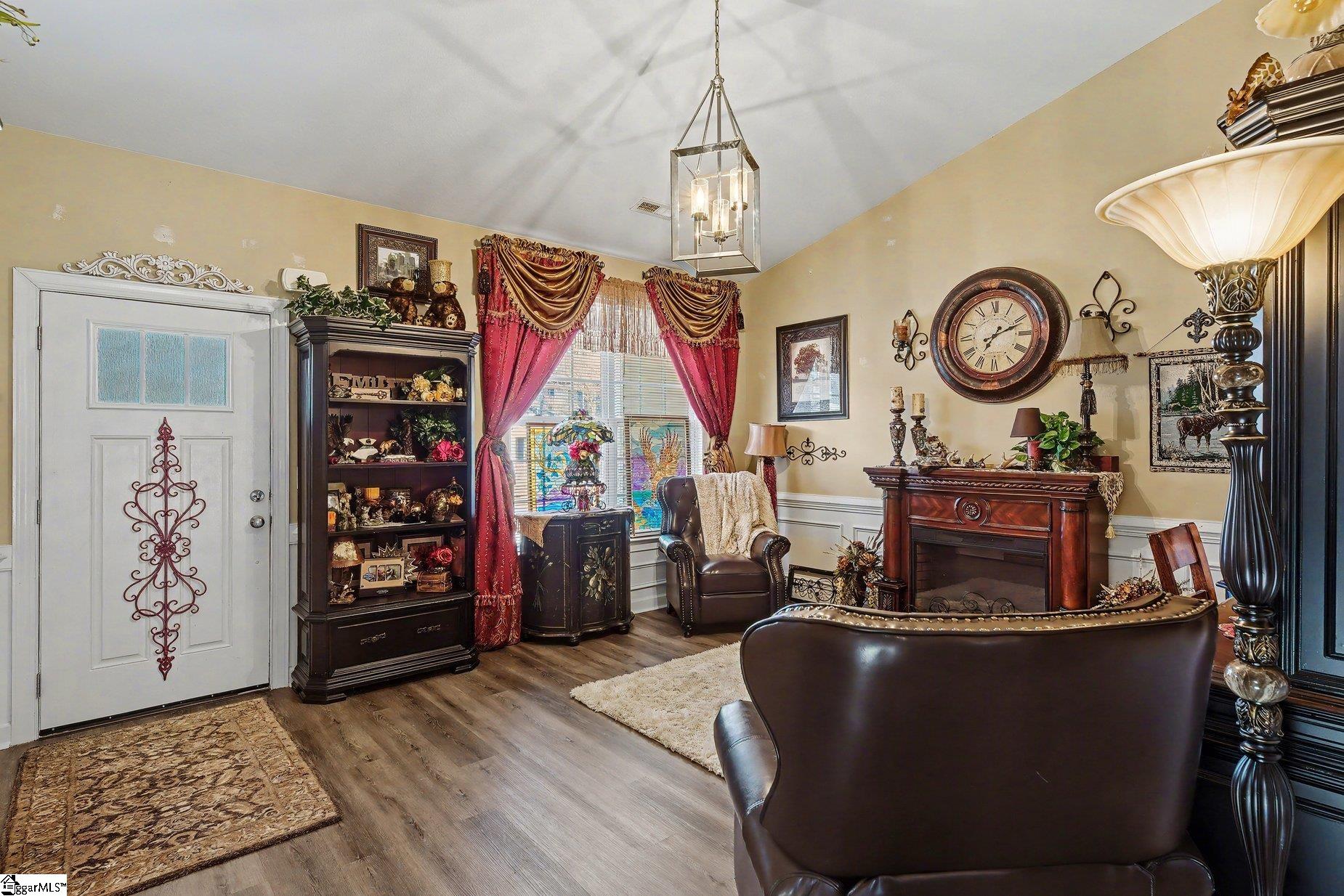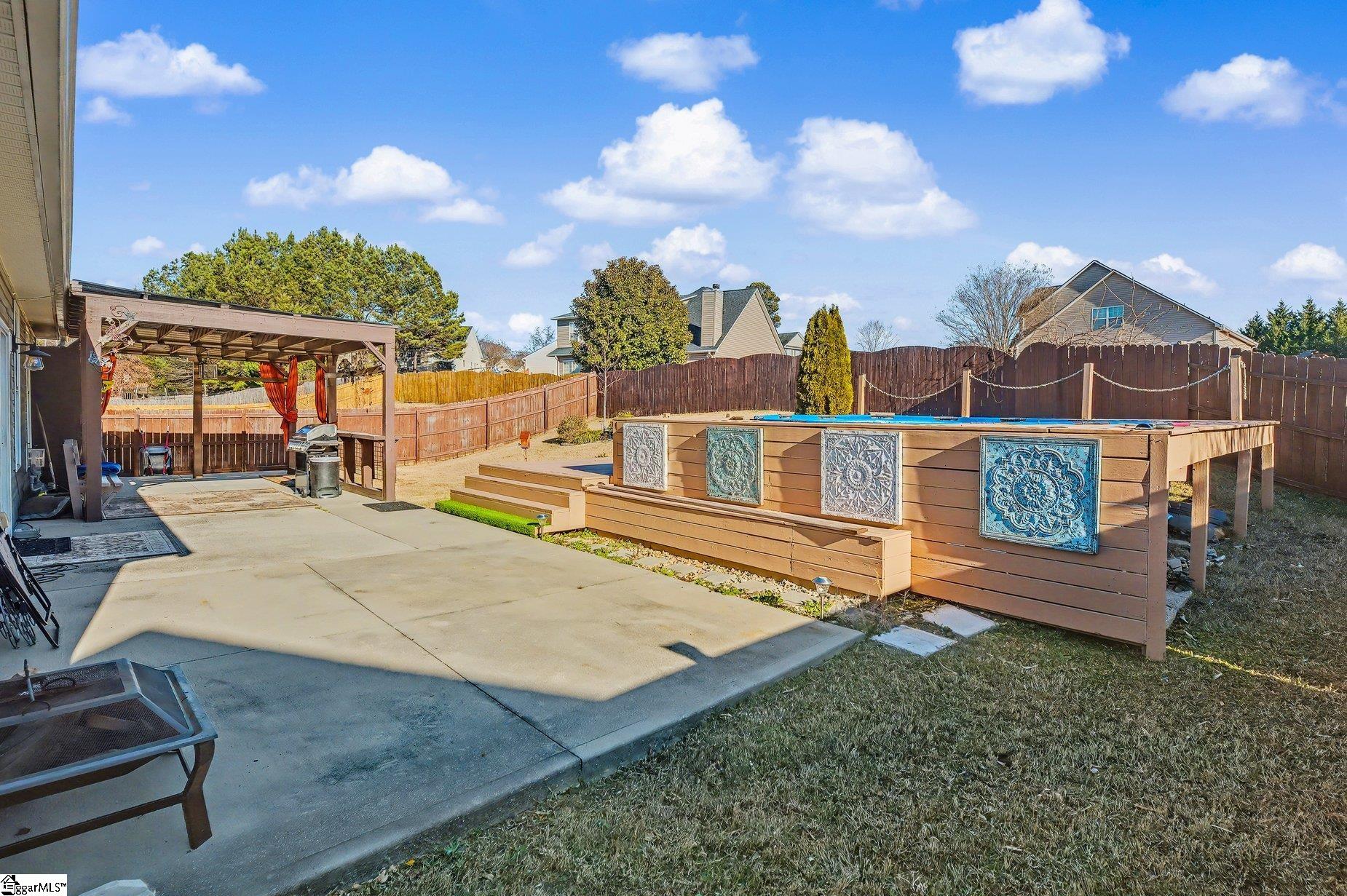 This beautifully appointed, move-in-ready ranch with elegant stone accents offers the perfect blend of comfort and refined living. Featuring 3 bedrooms and 2 baths, the open-concept floor plan is designed to feel both spacious and inviting. A richly accented den with classic chair rail detailing adds character, while the expansive kitchen showcases an eat-in island, vaulted ceilings, and seamless flow into the living area. The living room is anchored by a cozy gas log fireplace with a custom tile surround, creating a warm and welcoming atmosphere. Step outside to an extended patio overlooking a large, fully fenced backyard—ideal for quiet mornings or evening gatherings beneath the pergola. The outdoor space is truly a retreat, complete with a private pool and a beautifully terraced wood deck that offers both style and function. The primary suite provides a serene escape with a generous walk-in closet and a spa-inspired en-suite bath featuring double vanities, a glass-enclosed walk-in shower, and a separate garden tub. Two additional bedrooms and a full bath offer comfort and flexibility for guests or family. Additional highlights include a separate laundry room, a 2-car garage, and a newer HVAC system. Ideally located directly across from the community swimming pool and recreation area, this home offers the rare convenience of both private and community pool access. Just minutes from shopping, dining, and everyday conveniences, this exceptional property delivers luxury, comfort, and lifestyle in one beautiful package.