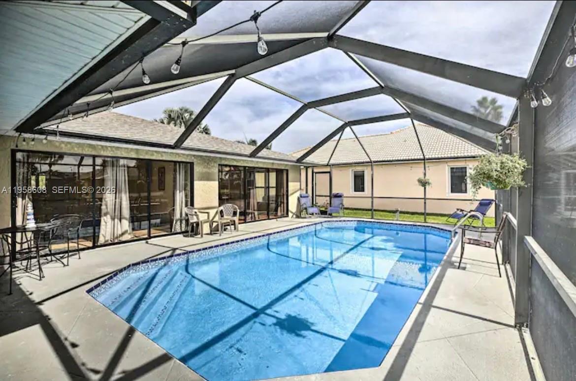 Major improvements include a new HVAC system (2021), resurfaced pool (2021), pool heater (2021), and a brand-new pool cage/screen enclosure (2023). Additional updates include new blinds and closet doors in all bedrooms, new storage closets in the garage, and a new garage door opener and track system (2024).