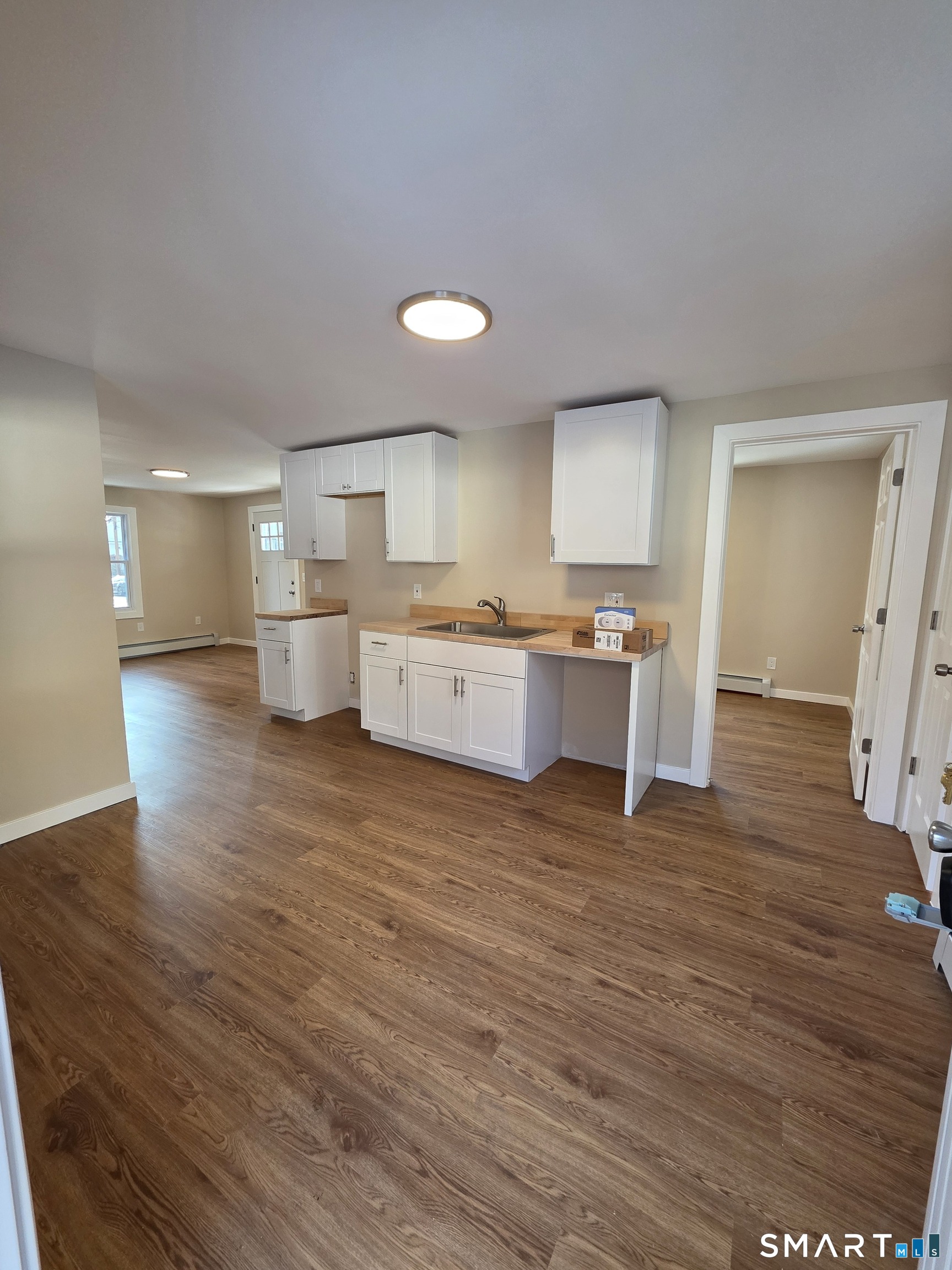 Completely renovated first-floor two-bedroom apartment featuring new flooring throughout, an updated kitchen, and a newly renovated bathroom. Washer and dryer hookup located in the kitchen for added convenience. The unit will be ready for March 1st occupancy. Street parking with a one-bay garage available to rent for an additional $100 per month. Monthly rent is $1, 850; tenant is responsible for all utilities. Apartment is currently undergoing final renovations.