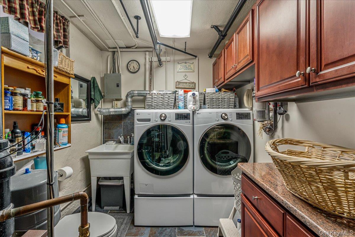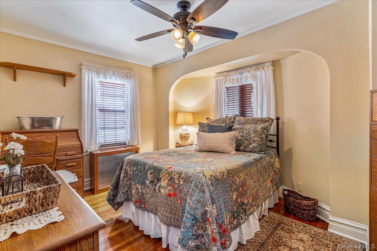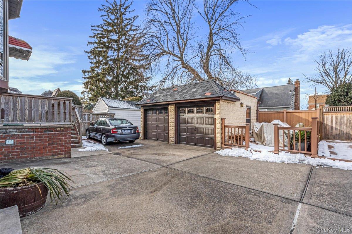 Classic architectural charm and thoughtful modern upgrades come together in this sun-filled brick Tudor-style residence, ideally situated in the highly desirable North Flushing section of Flushing. This residence offers a well-defined layout across three levels, including a main floor, second floor, and finished basement. The exterior features a classic brick facadr with stone accents, a new slate and pitched roof on the house, a new pitched roof on the garage, and a raised front entry. A driveway which leads to a detached garage and additional storage. The rear of the property includes a cement driveway area and deck access. The main level includes a formal living room with hardwood flooring, picture frame molding, wall sconces, ceiling fan, and a decorative fireplace with detailed mantel. An arched opening connects the living room to the formal dining room, creating separation while maintaining flow. The dining room features a generous space for a full dining set and is positioned adjacent to the kitchen. The windowed kitchen is outfitted with wood cabinetry, granite countertops, tiled flooring, recessed lighting, and stainless-steel appliances, including a gas range, microwave, refrigerator, and a built-in breakfast nook with additional cabinetry. The second floor includes three bedrooms with hardwood flooring, ceiling fans, and windows providing natural light. The primary bedroom offers generous proportions and decorative wall detailing. A full bathroom on this level includes tiled walls and flooring, a vanity with stone countertop, a jacuzzi bathtub, and a separate glass-enclosed shower. The lower level includes a full finished basement area with high ceiling, recessed lighting, extensive built-in cabinetry, utility area with washer and dryer, and French drainage. This level provides flexible space suitable for storage and recreation. The property is in close proximity to local bus transportation (Q16, Q28), 6 blocks from the LIRR, Bowne Park, shopping, and dining.