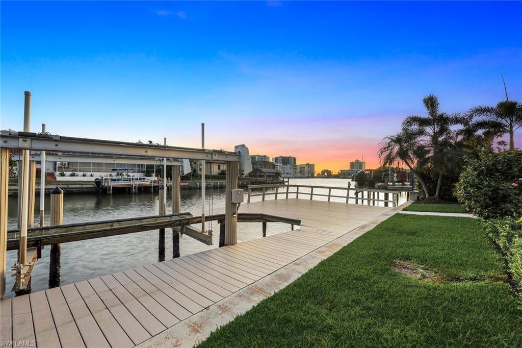 Exceptional Gulf access waterfront residence offering sweeping southern canal vistas and bay views, gorgeous by day or night to enjoys the lights of the Ritz. Beautifully renovated rare coastal find! From the moment you arrive, elegant mahogany double entry doors frame a stunning sightline to the shimmering water views beyond. This meticulously maintained three story home with elevator has been masterfully reimagined with a refined open-concept design, ideal for both relaxed living and elevated entertaining. The great room is anchored by a sleek linear fireplace that sets the mood, seamlessly flowing into a chef inspired kitchen featuring wine cooler and custom built-in banquette wrapped in dramatic mitered windows an unforgettable gathering space. Contemporary glass railed stairs lead to a private loft and the serene primary suite, highlighted by a tray ceiling, dual custom closets, and a spa-like oversized bath. Step onto your private balcony and savor breathtaking sunsets and the lights at night of the Ritz. Terraces on all three levels provide remarkable outdoor living spaces. Designed for effortless indoor outdoor living boasting the first-floor spacious family room/media area with dining that opens to a private resort style pool and spa, complete with a pizza oven and outdoor kitchen ambiance. Perfect for hosting or unwinding after a day on the water, while a solid composite dock with boat lift ensures easy care and access to the Gulf. Additional features include a 3+ car garage. Just a short stroll to the white sugar sands of Vanderbilt Beach and moments from world class dining at the Ritz, plethora of upscale shopping, La Playa Beach Club, Mercato shopping and entertainment. One visit is all it takes to fall in love!