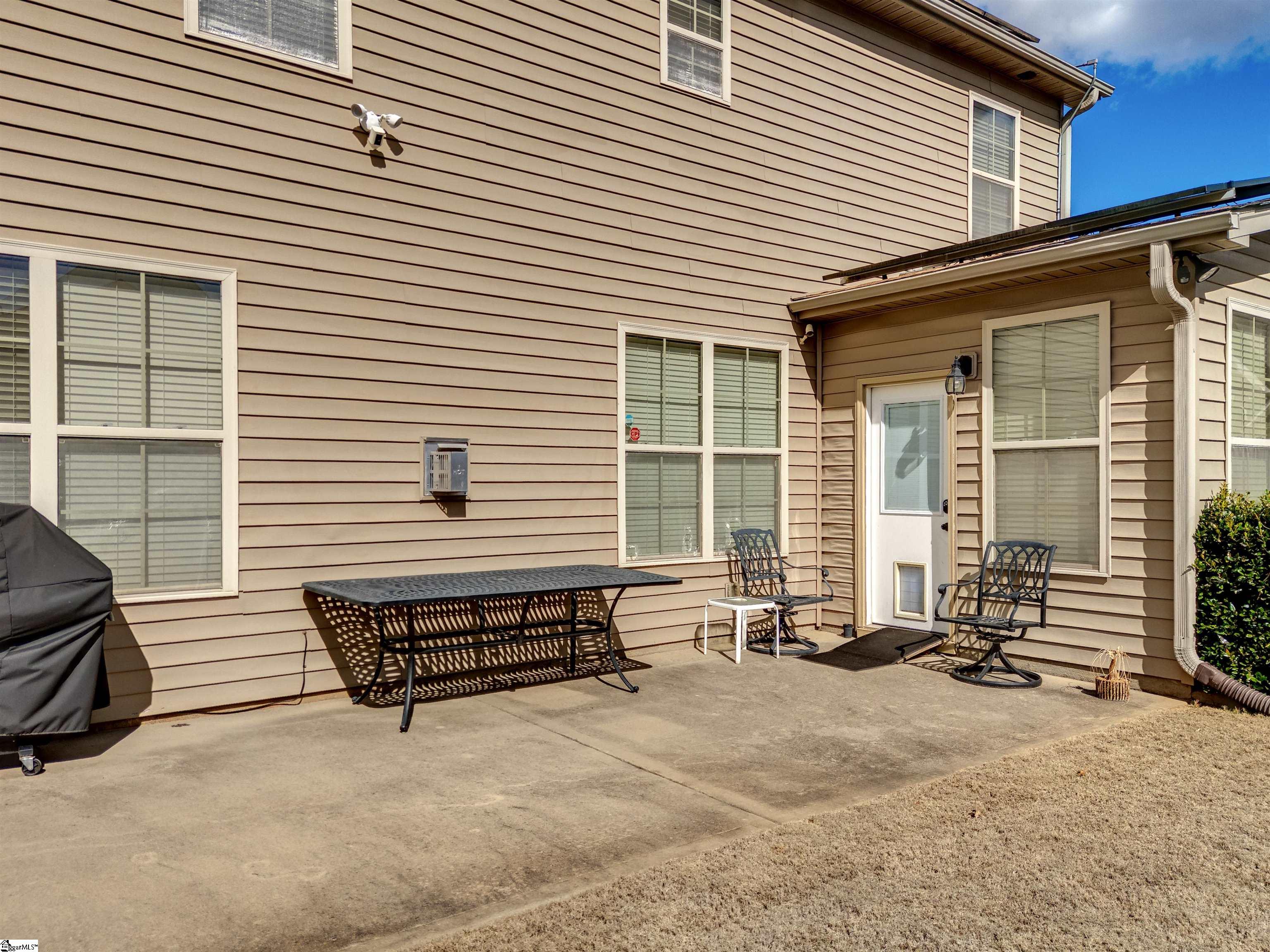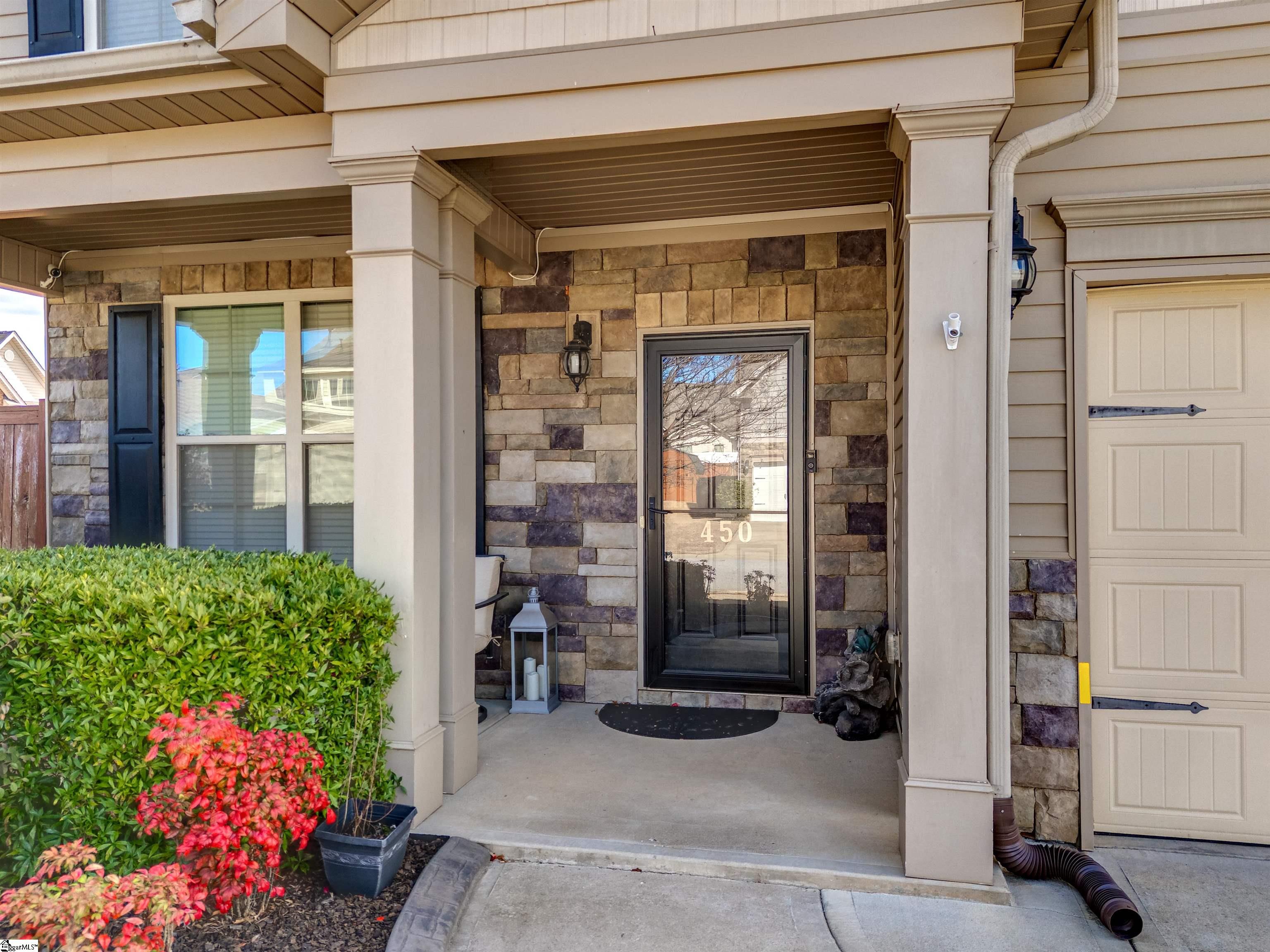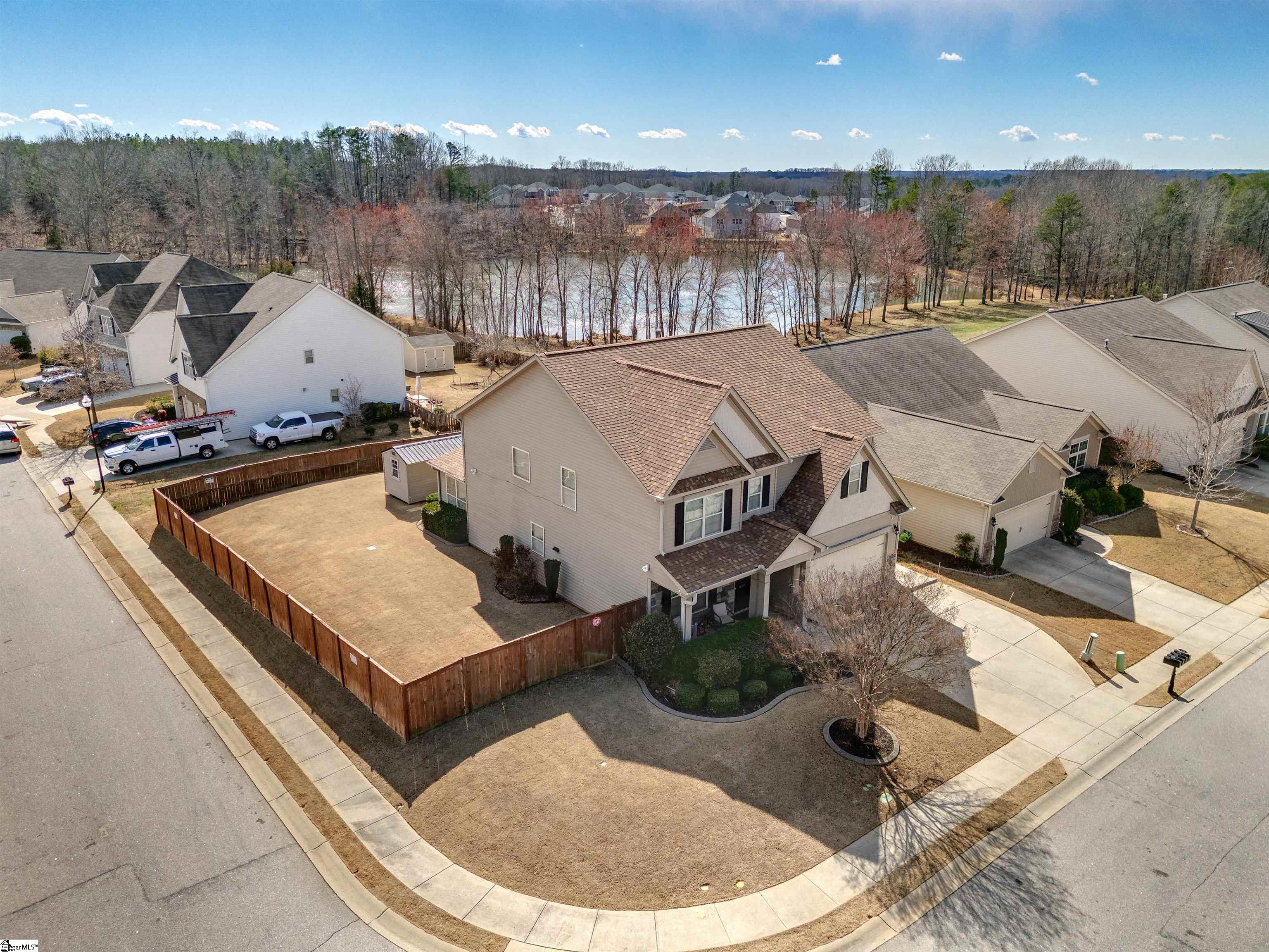 Welcome to 450 Bucklebury Road a beautiful five bedroom, four bathroom home in a prime location. The moment you enter from the front porch you’ll be greeted by a foyer that seamlessly integrates the living, dining, and kitchen areas. The kitchen is equipped with granite countertops, tile backsplash, stainless steel appliances (including a gas range), a pantry, and large center island. The breakfast area leads to a sunroom where you can access the backyard. There you will find an oversized concrete patio with a gas hook-up for your grill, storage building that conveys, and fenced in backyard. Back inside, The great room is open to the kitchen and includes a cozy corner fireplace with gas logs. Finishing out the main floor is a bedroom (Murphy bed will convey) and full bath that provides convenience for potential guest. On the second level you will find one bedroom that was used as a walk-in closet for the current owner and a full hall bath. Two additional spacious bedrooms provide comfort and share access to a full bathroom. The primary suite features a large bedroom area, en-suite bathroom with a tile shower, jetted tub, dual vanities, and walk-in closet. The walk-in laundry room is also located on the 2nd floor with close proximity to all bedrooms. The roof was replaced in 2025 and solar panels are owned, to help lower the cost of energy bills. This home is situated on an upgraded corner lot in Franklin Pointe, a highly desirable community where you'll enjoy access to the neighborhood pool, clubhouse, and playground. Conveniently located near BMW, GSP Airport, I-85, and just minutes from downtown Greer and Greenville. Don't miss out on all this lovely home has to offer!